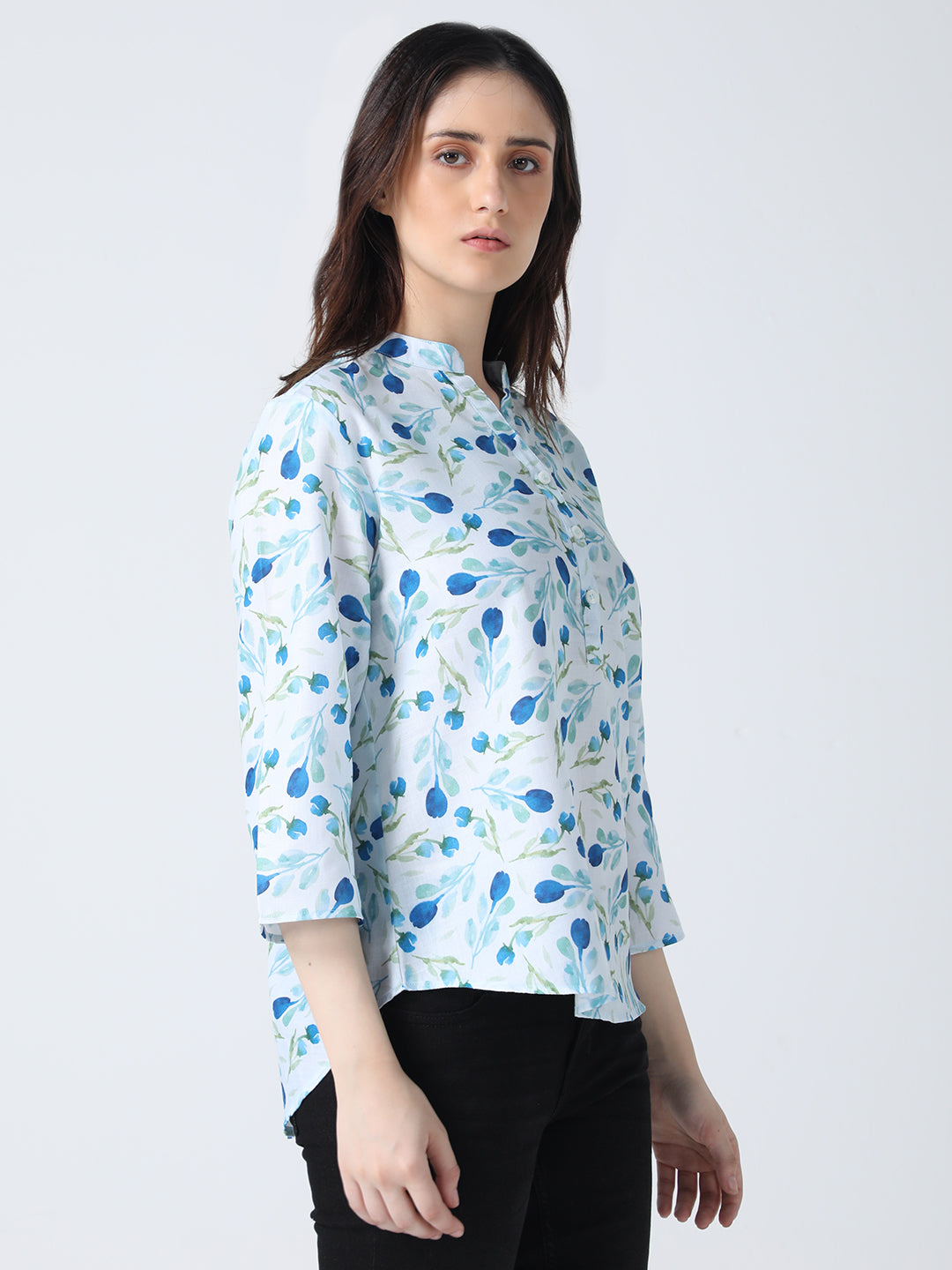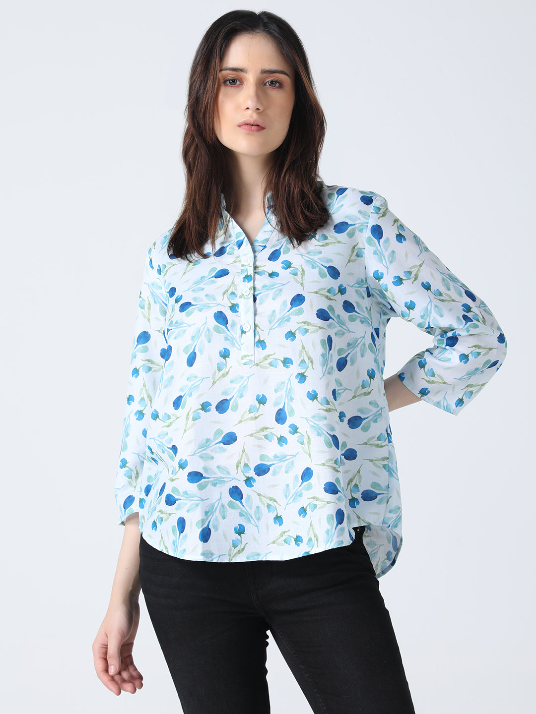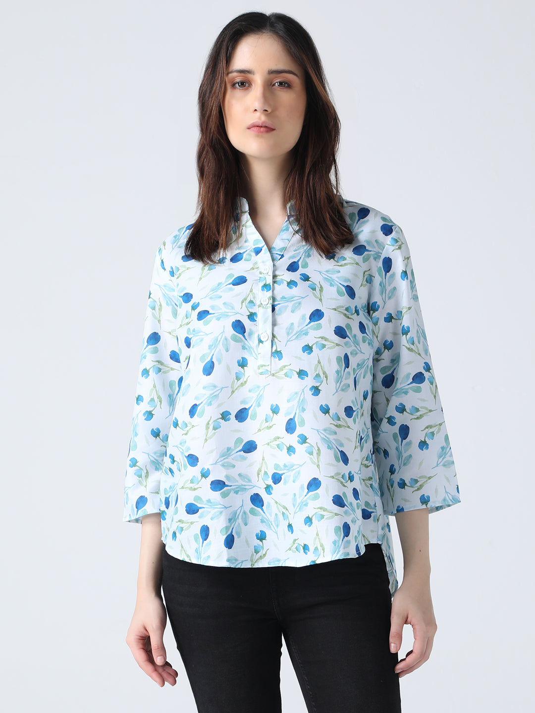 This shirt features a floral print, mandarin collar, and 3/4 sleeves, all crafted from soft cotton fabric. A comfortable and stylish choice for any casual occasion.