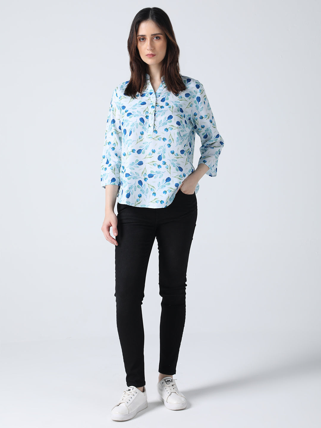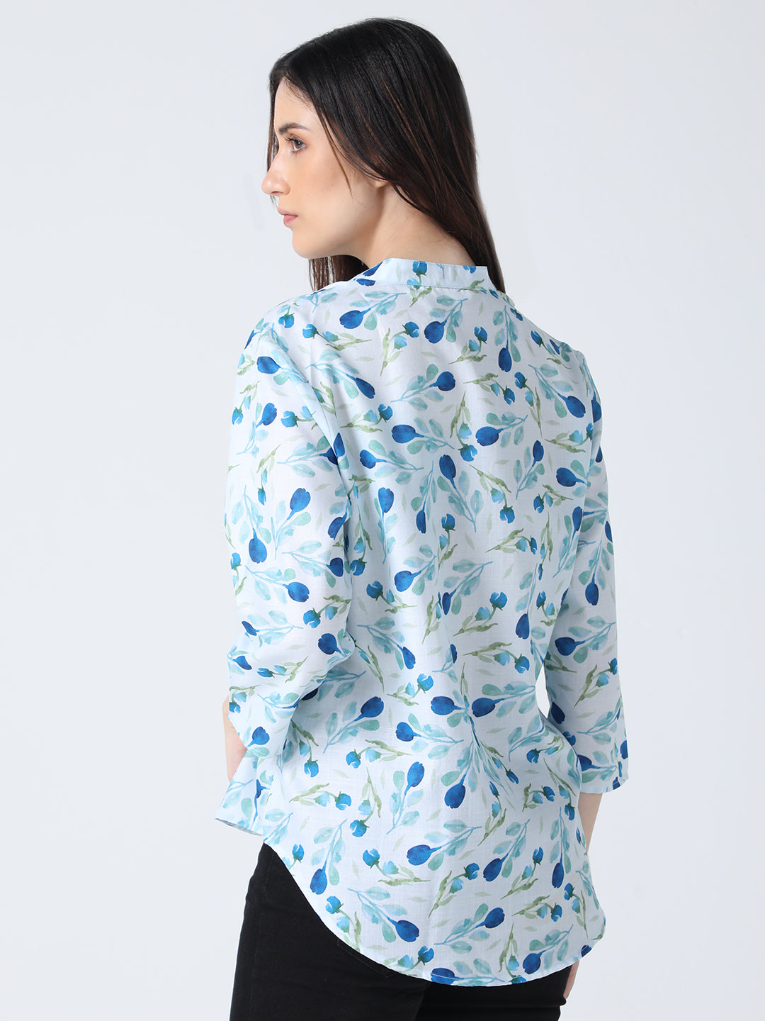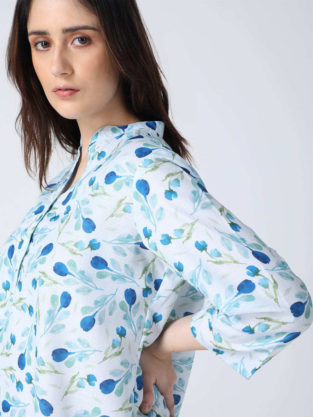 This shirt features a floral print, mandarin collar, and 3/4 sleeves, all crafted from soft cotton fabric. A comfortable and stylish choice for any casual occasion.