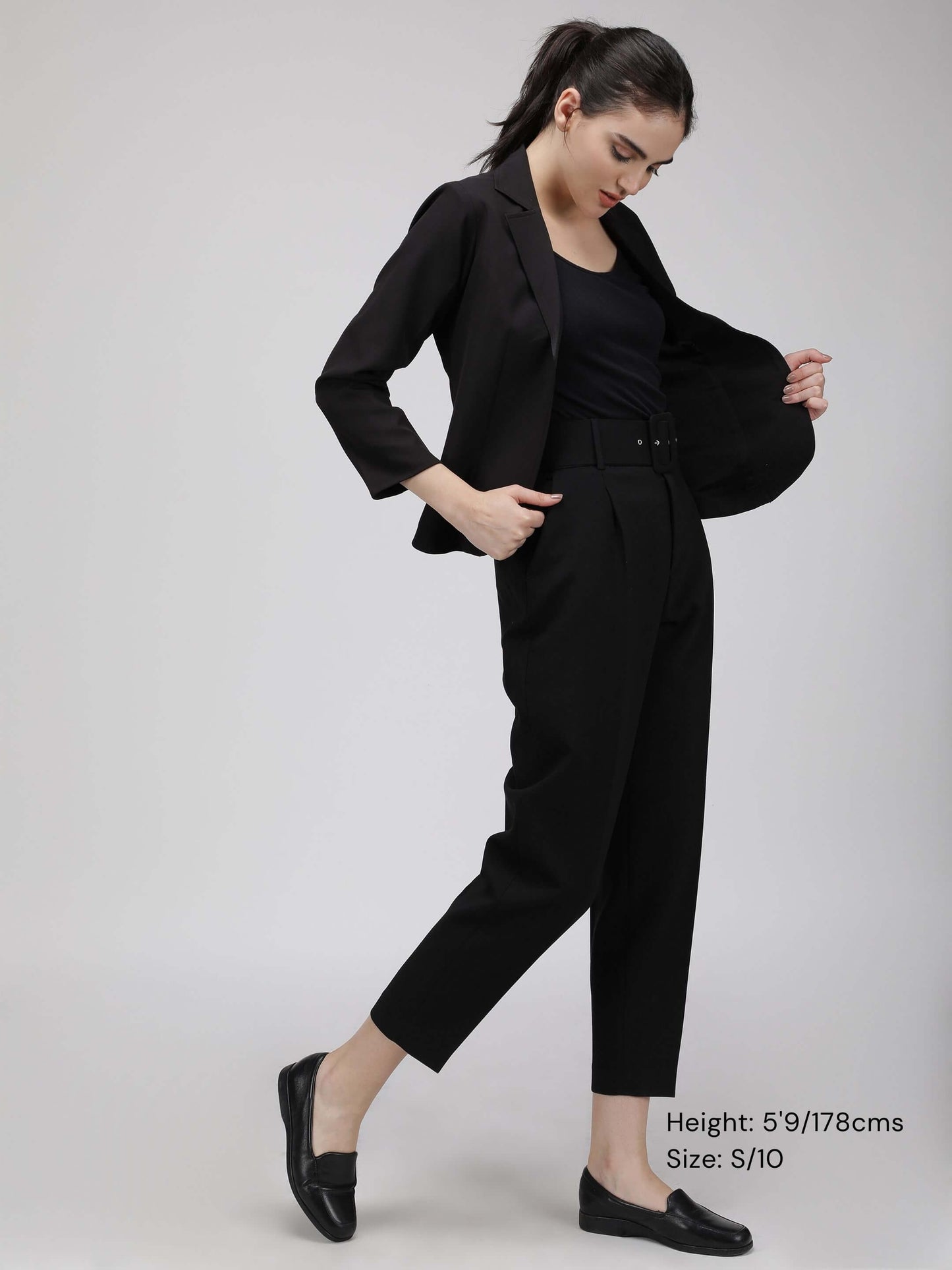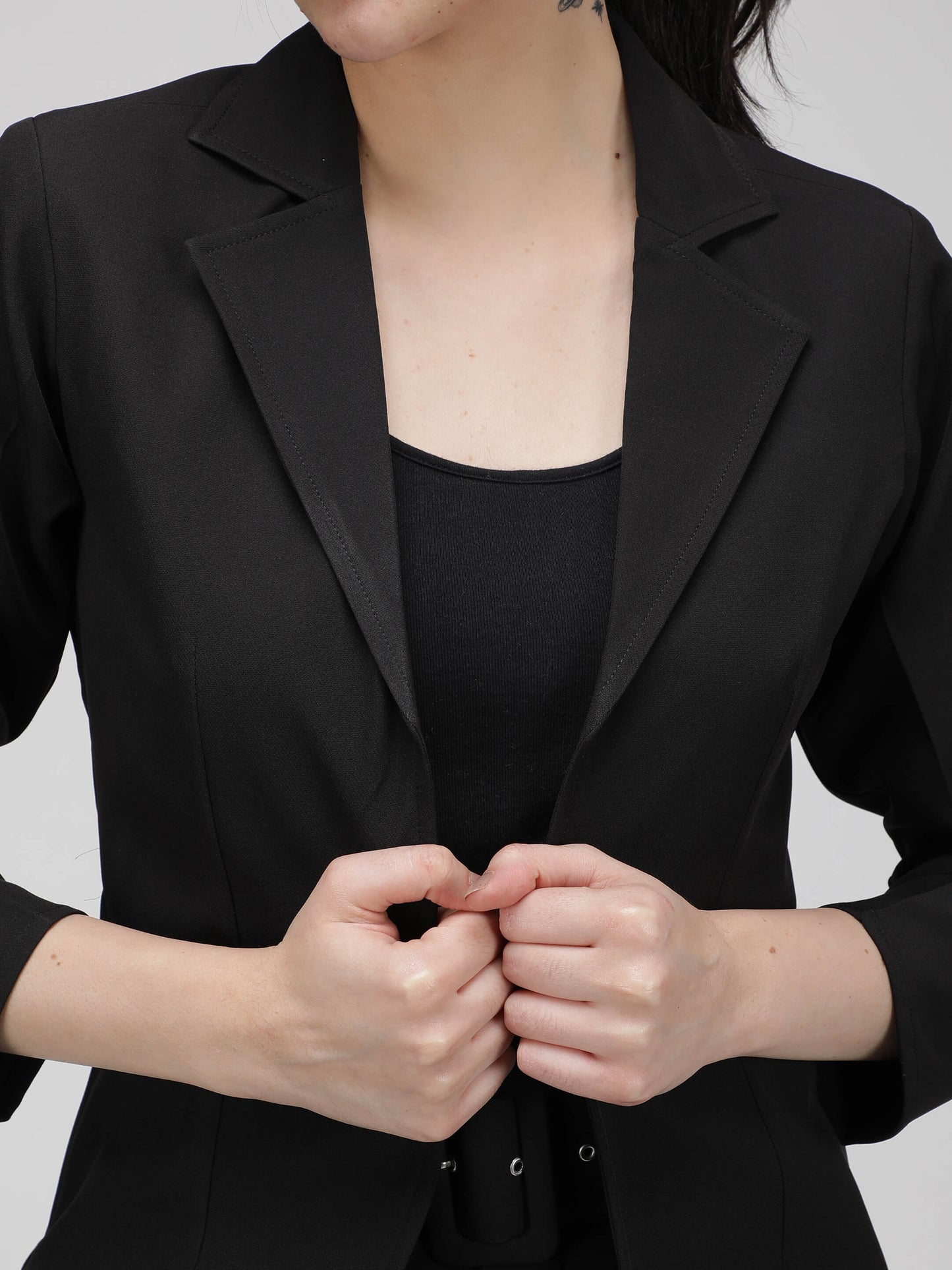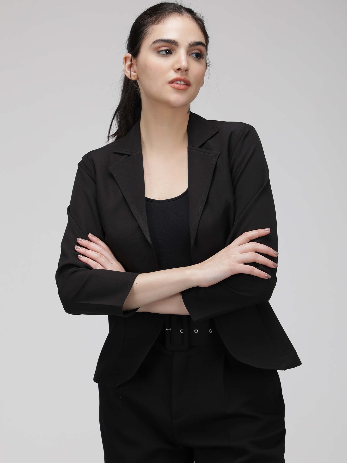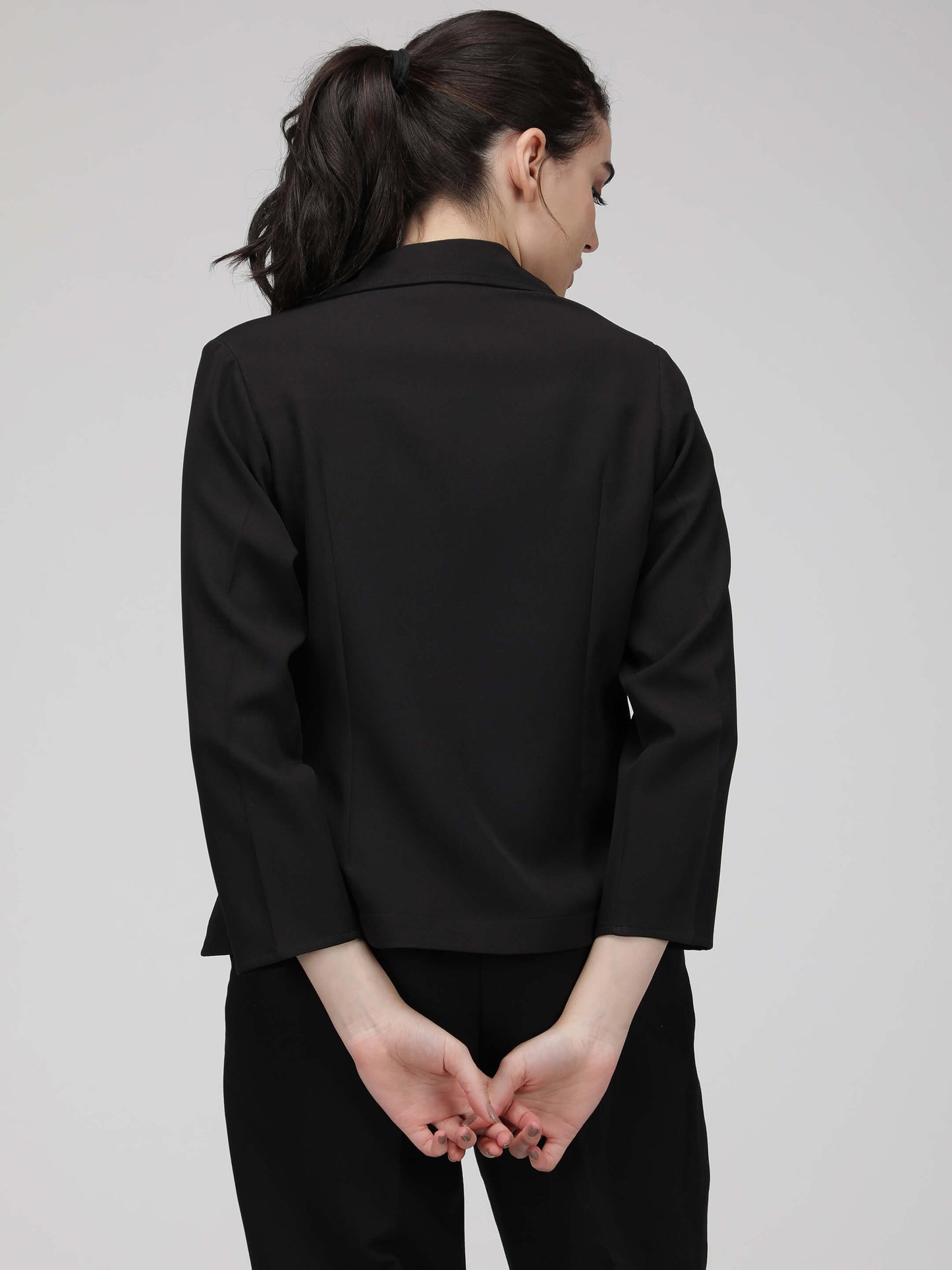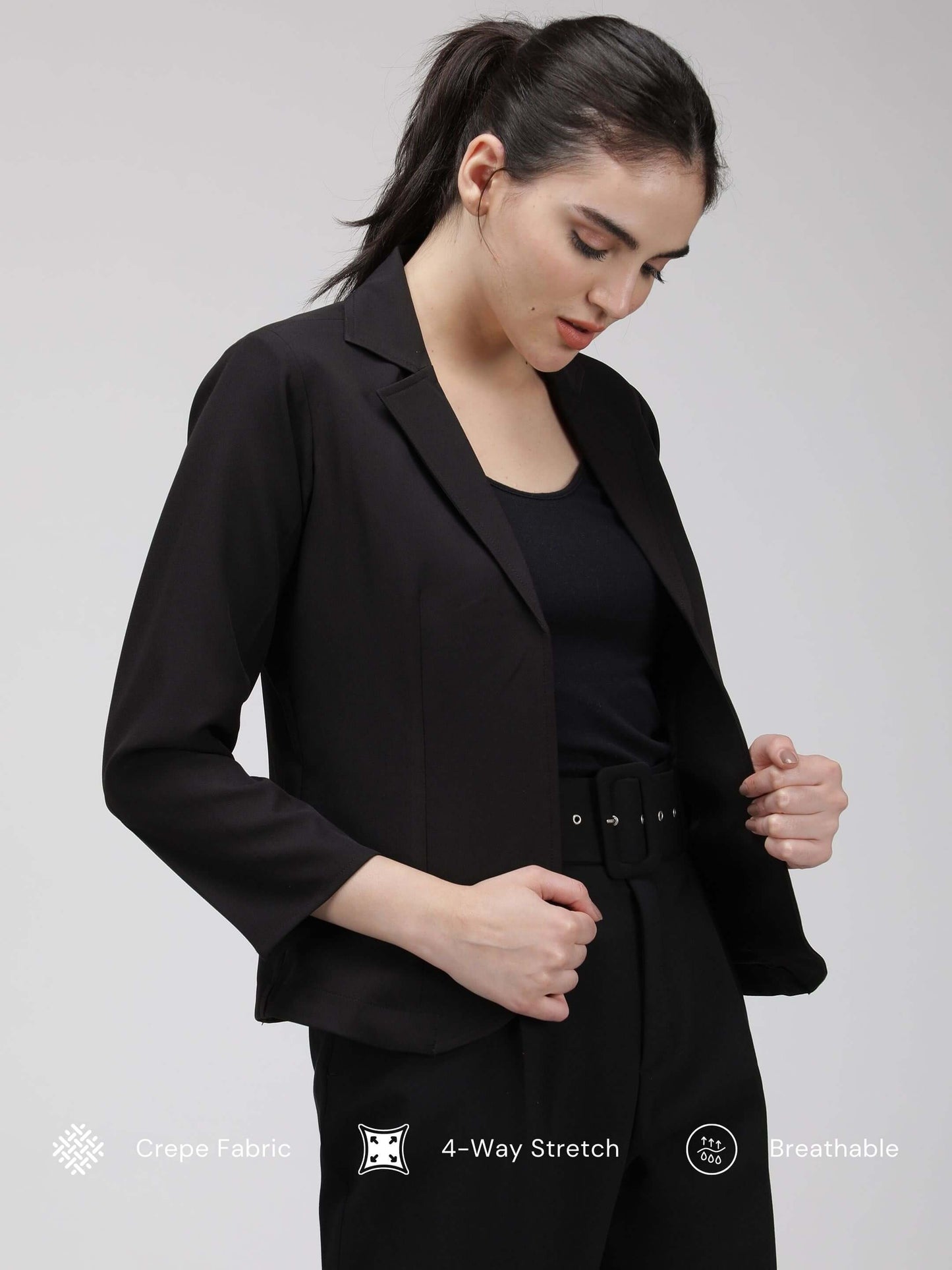 This stylish Black blazer is crafted from a polyester crepe fabric with a 4-way stretch for comfort and flexibility. It features a classic notched lapel and a satin lining for a formal look..