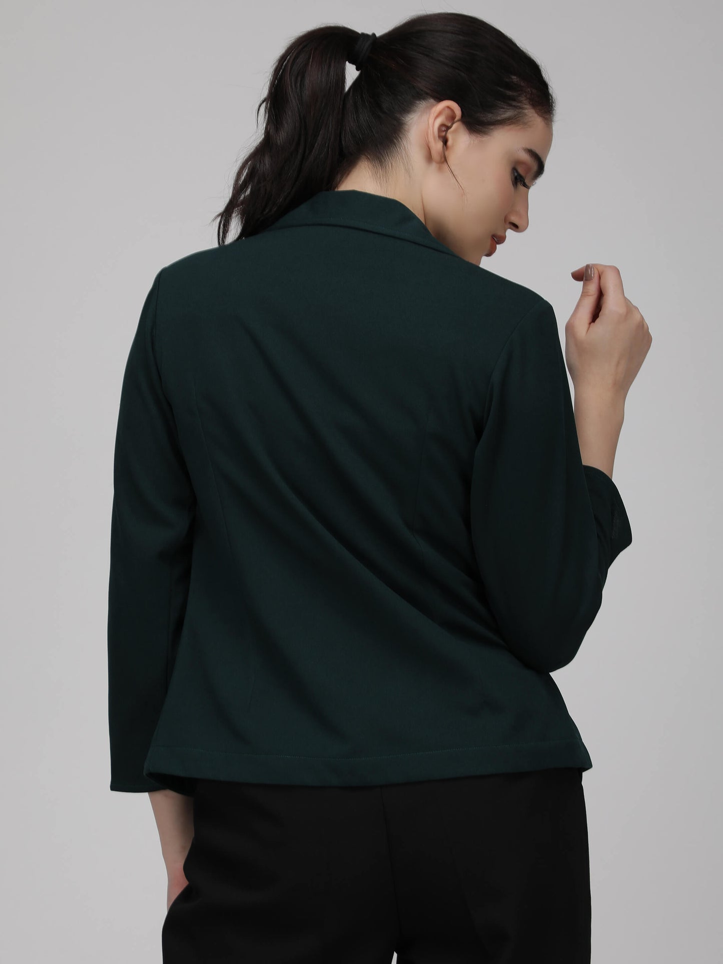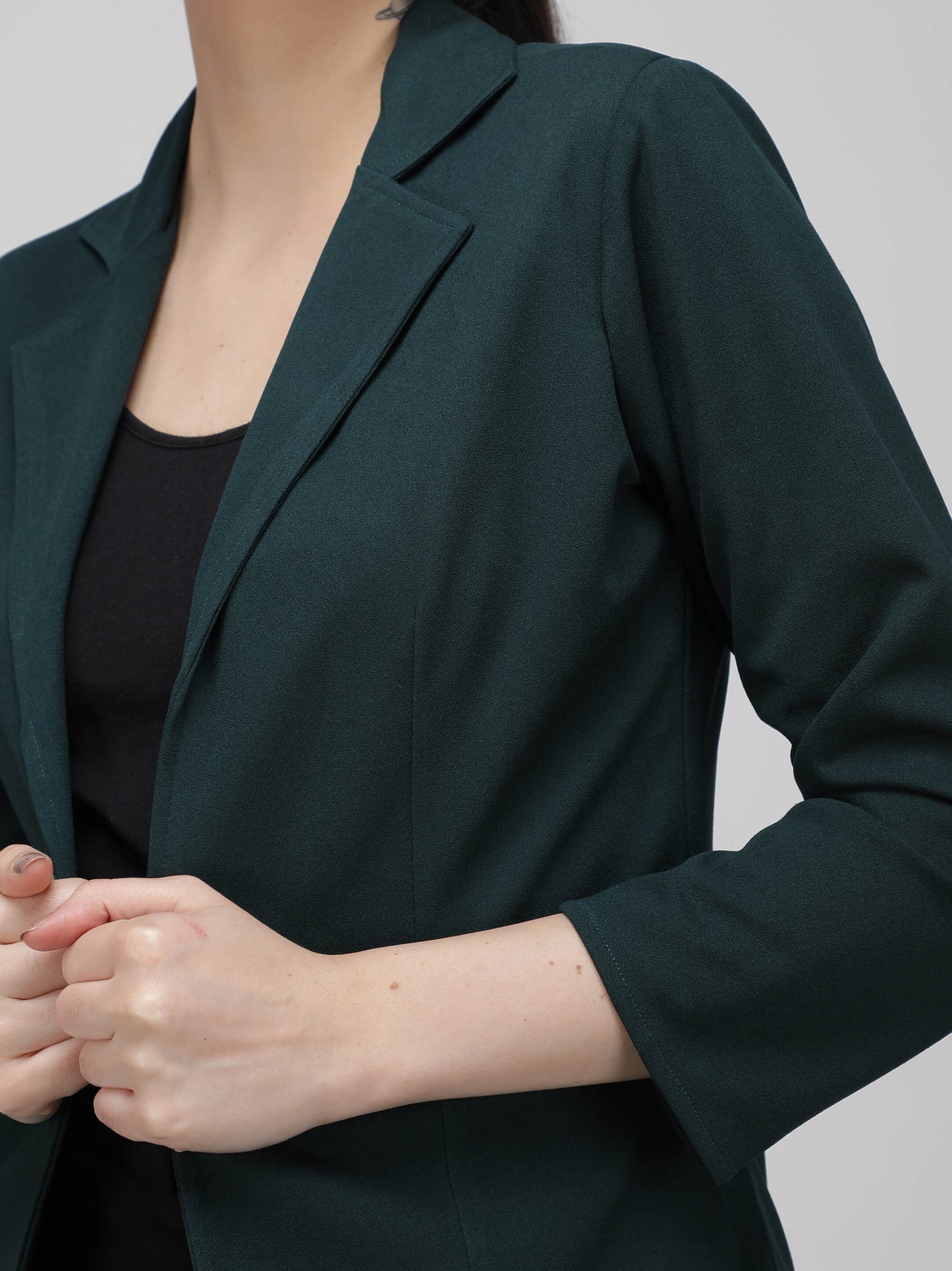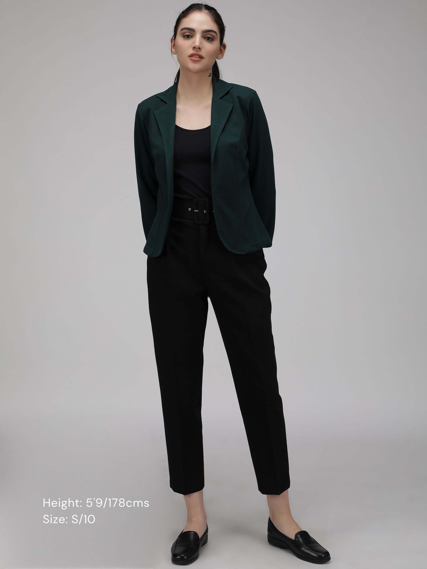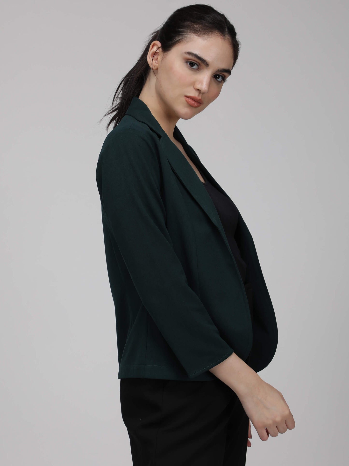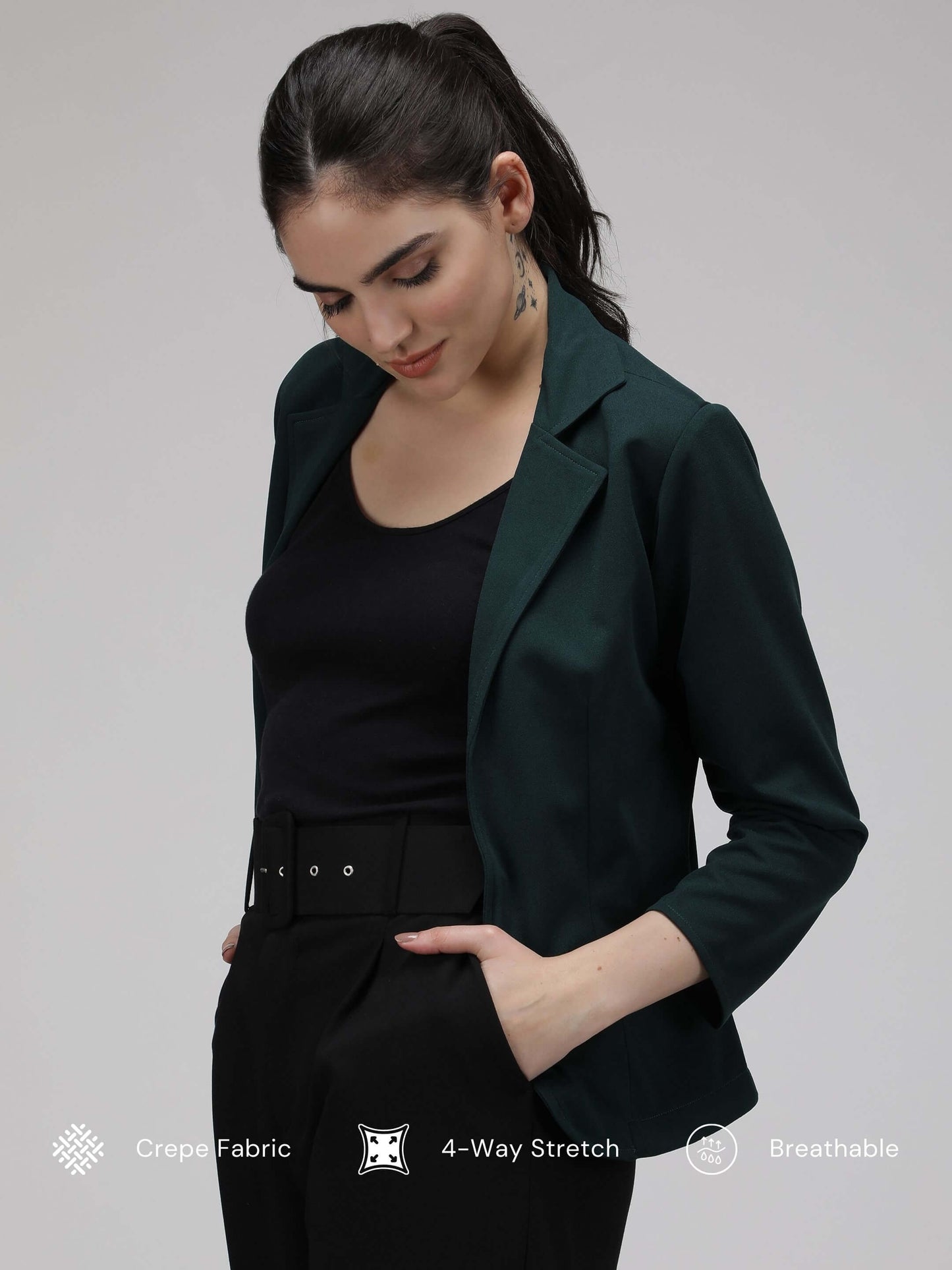 This green open-front blazer is made from thick polyester crepe, with 4 way stretch and anti-crease fibers for long-lasting elegance. Perfect for formal and casual wear, it combines sophistication and comfort to elevate any outfit. Comes with satin lining.