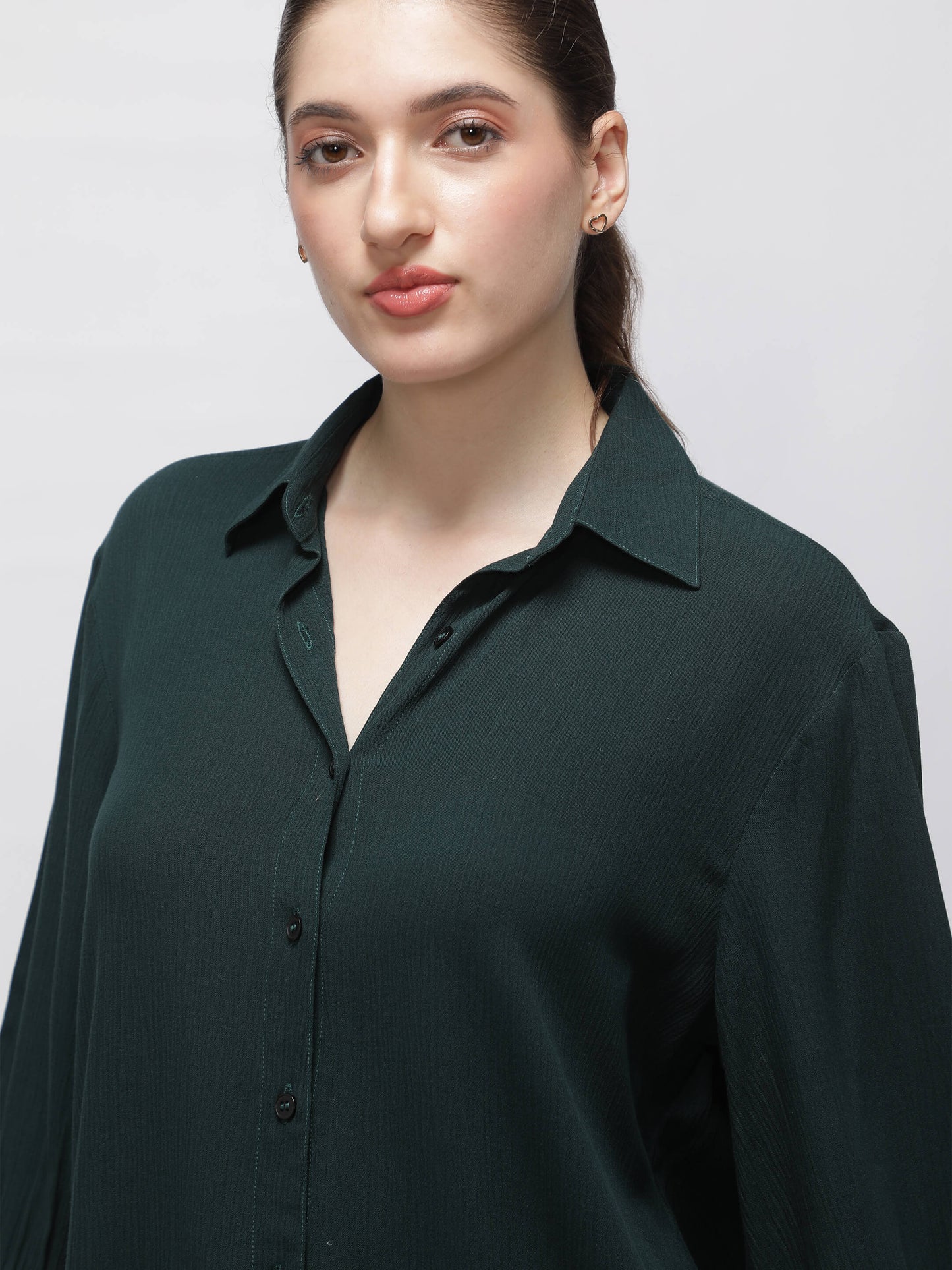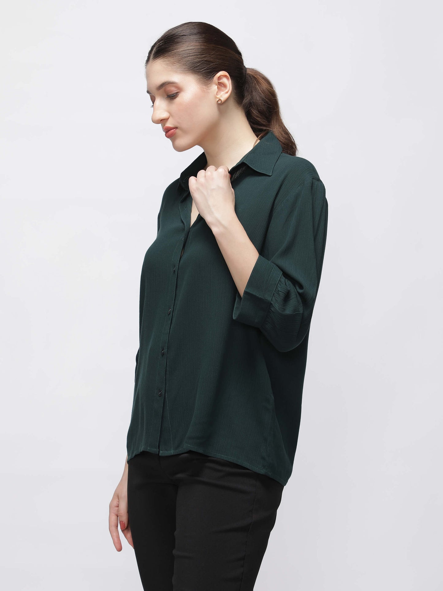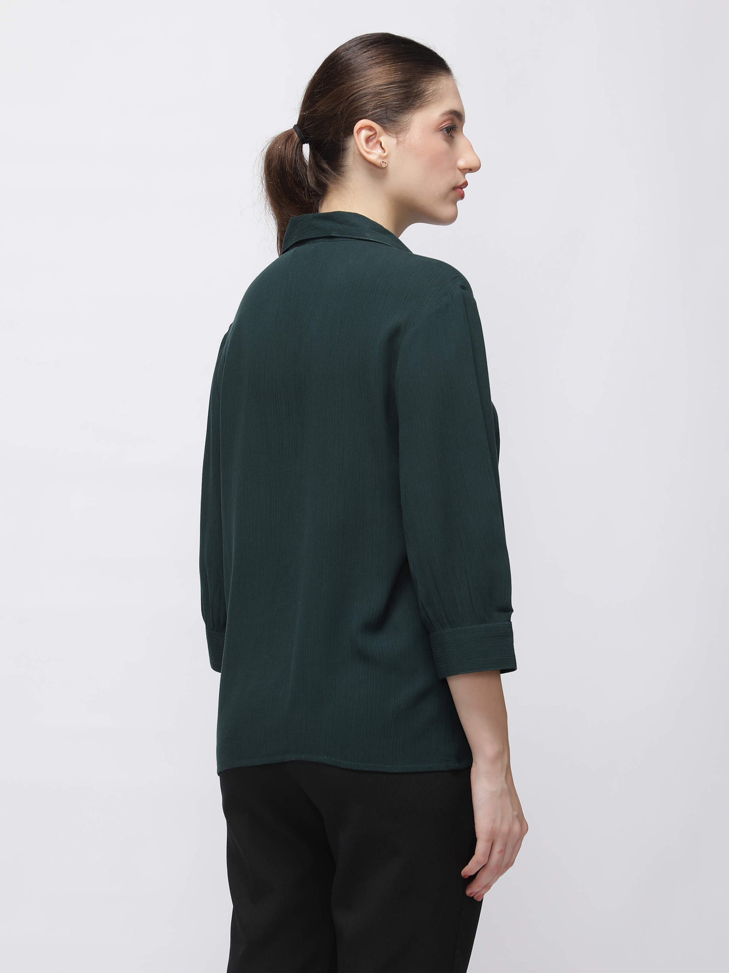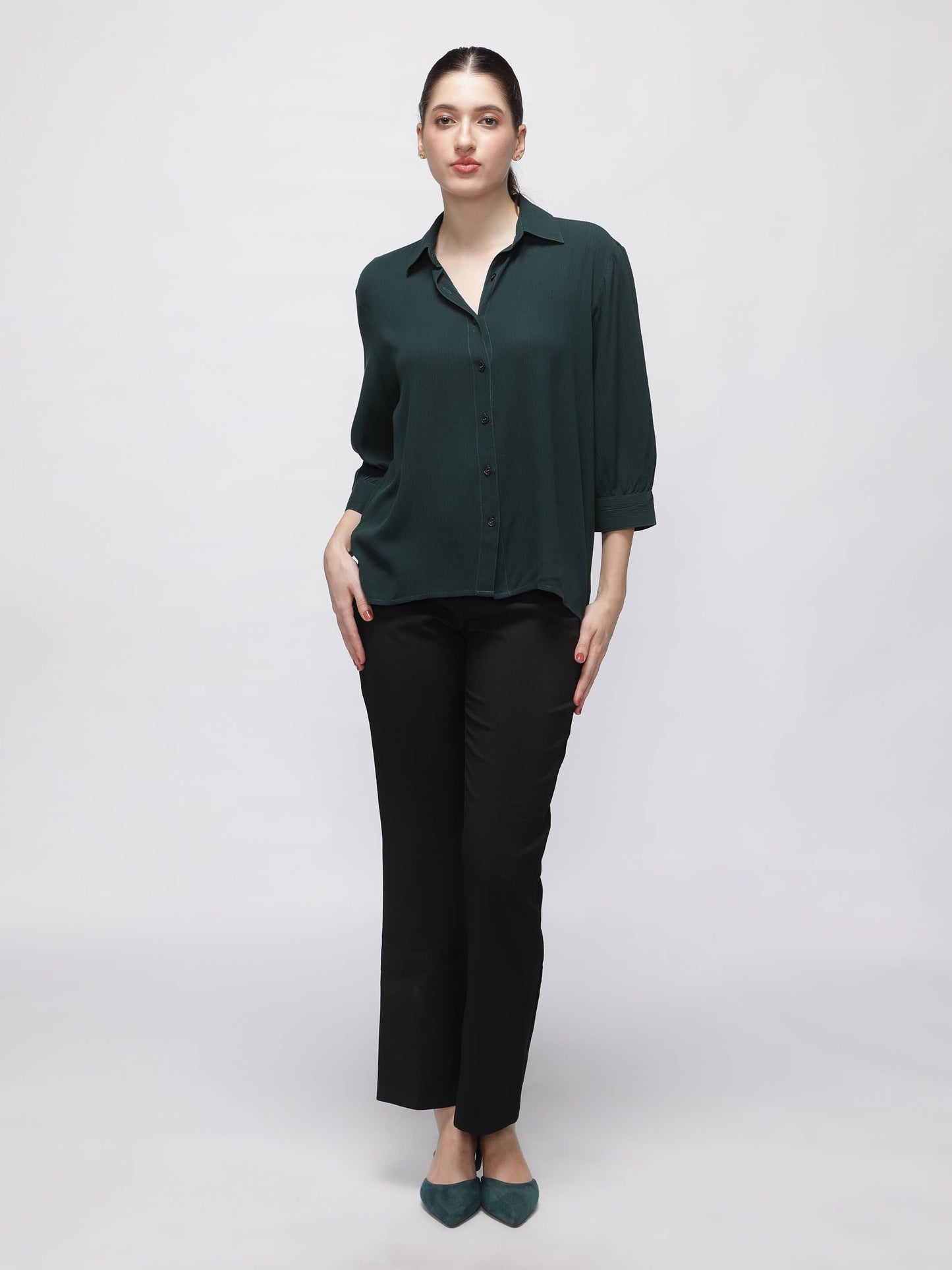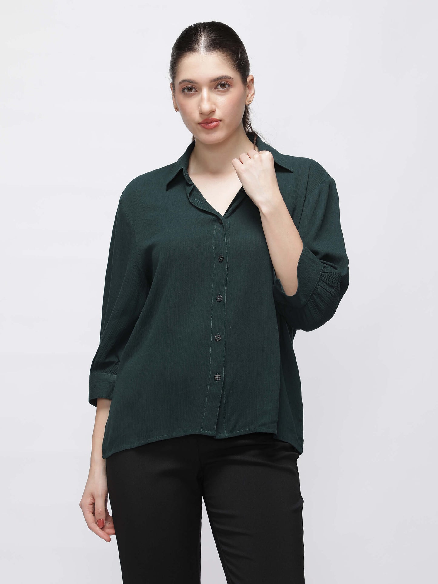 Regular price Rs. 849.00This women’s green crush fabric shirt offers timeless style with modern ease. The 3/4 sleeves and regular fit make it ideal for everyday dressing. Lightweight and breathable, it’s great for work and beyond.
