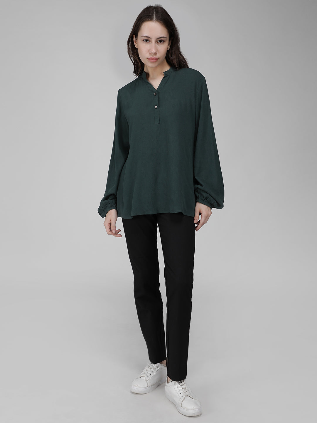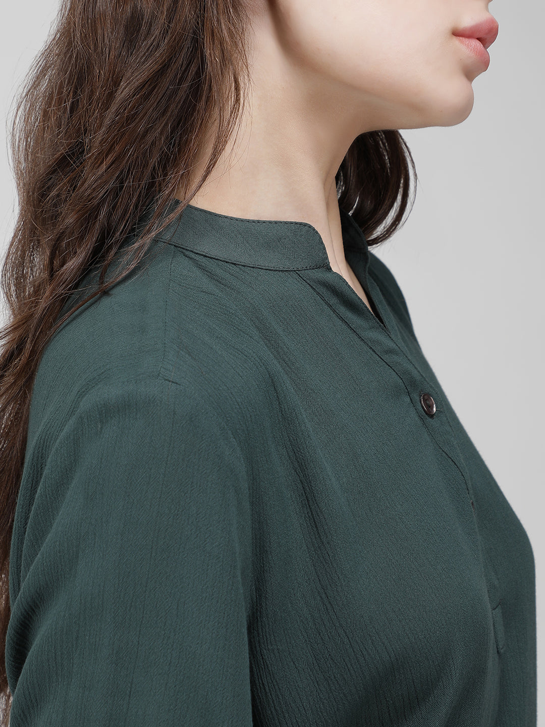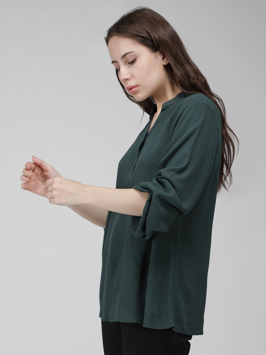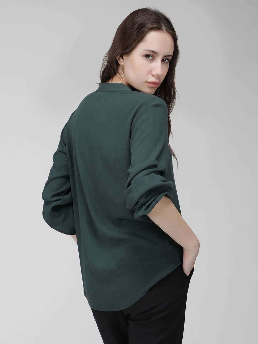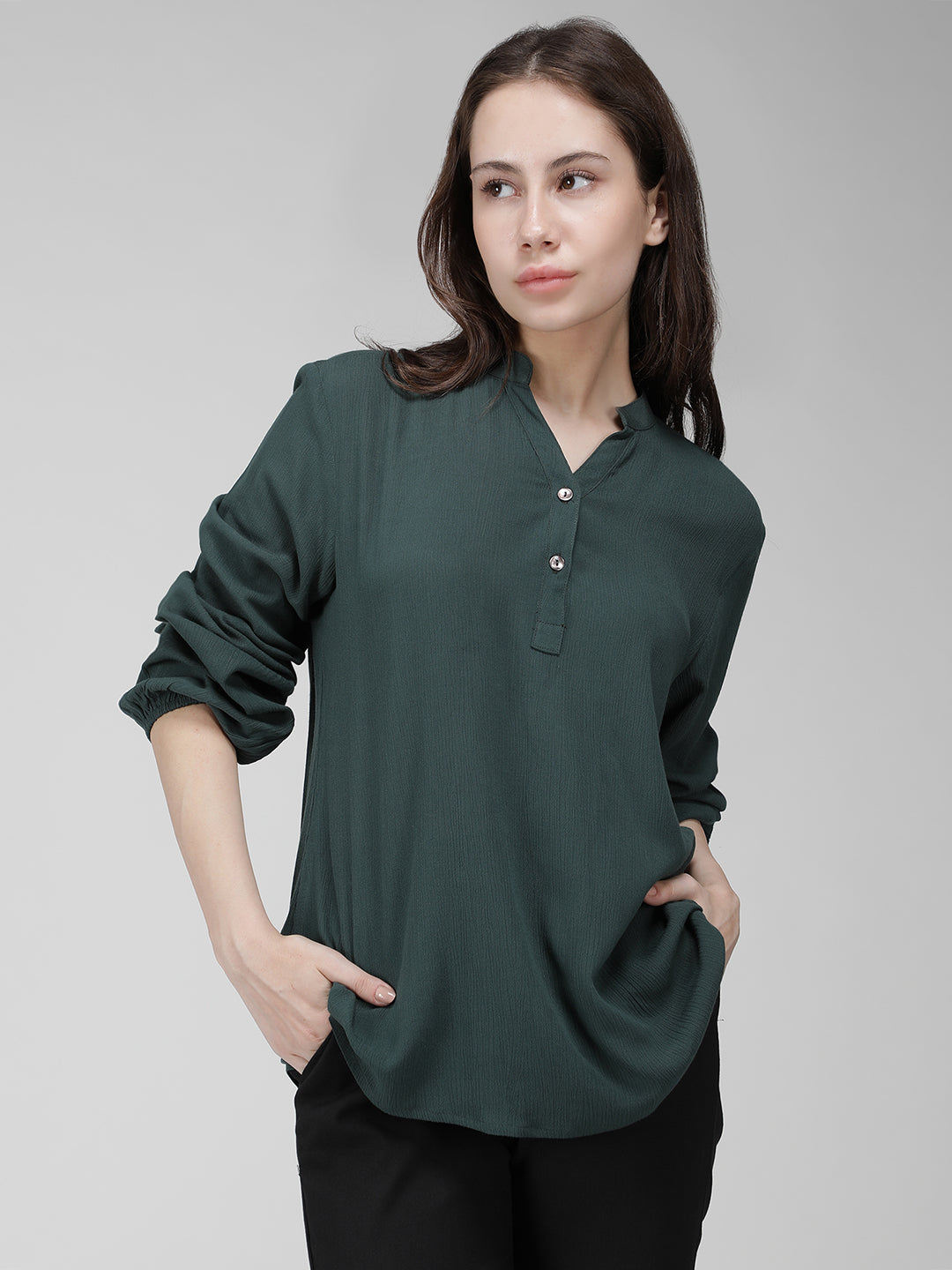 This mandarin-collared, full-sleeved top is crafted from luxuriously soft and breathable crush rayon, perfect for days when you want to stay comfortable and stylish.