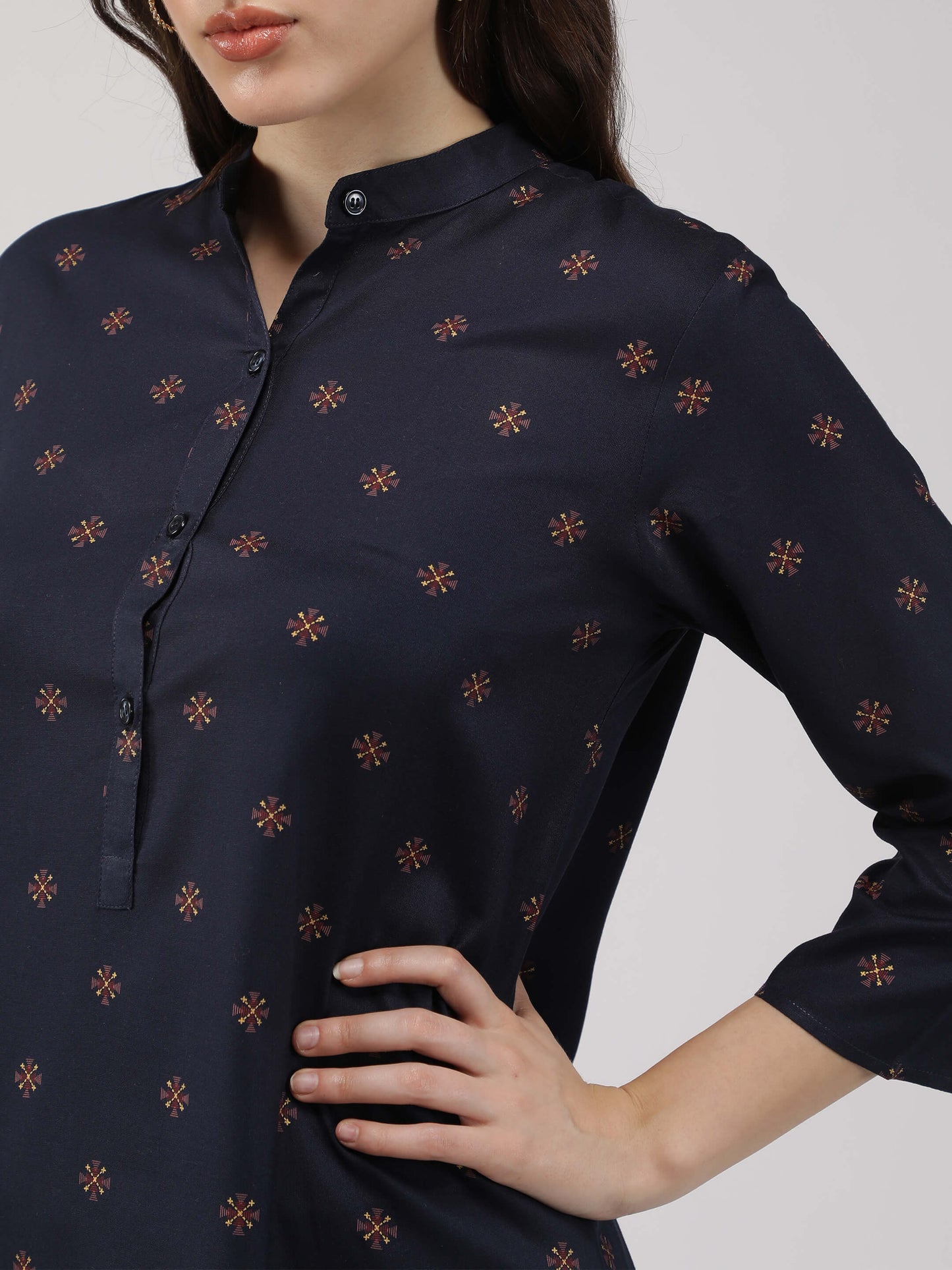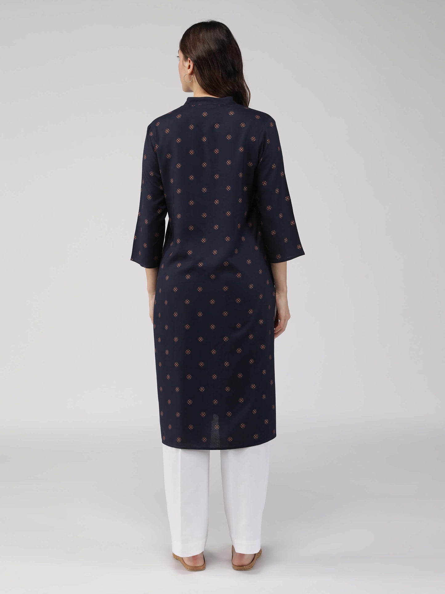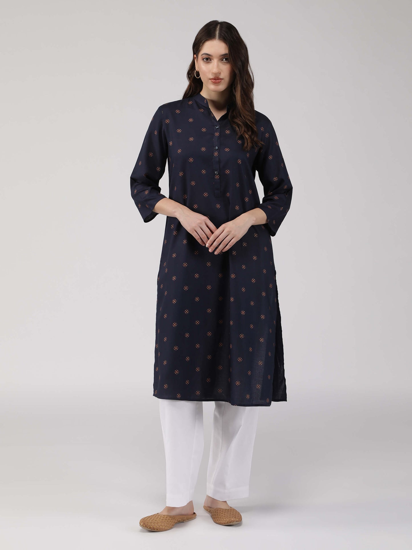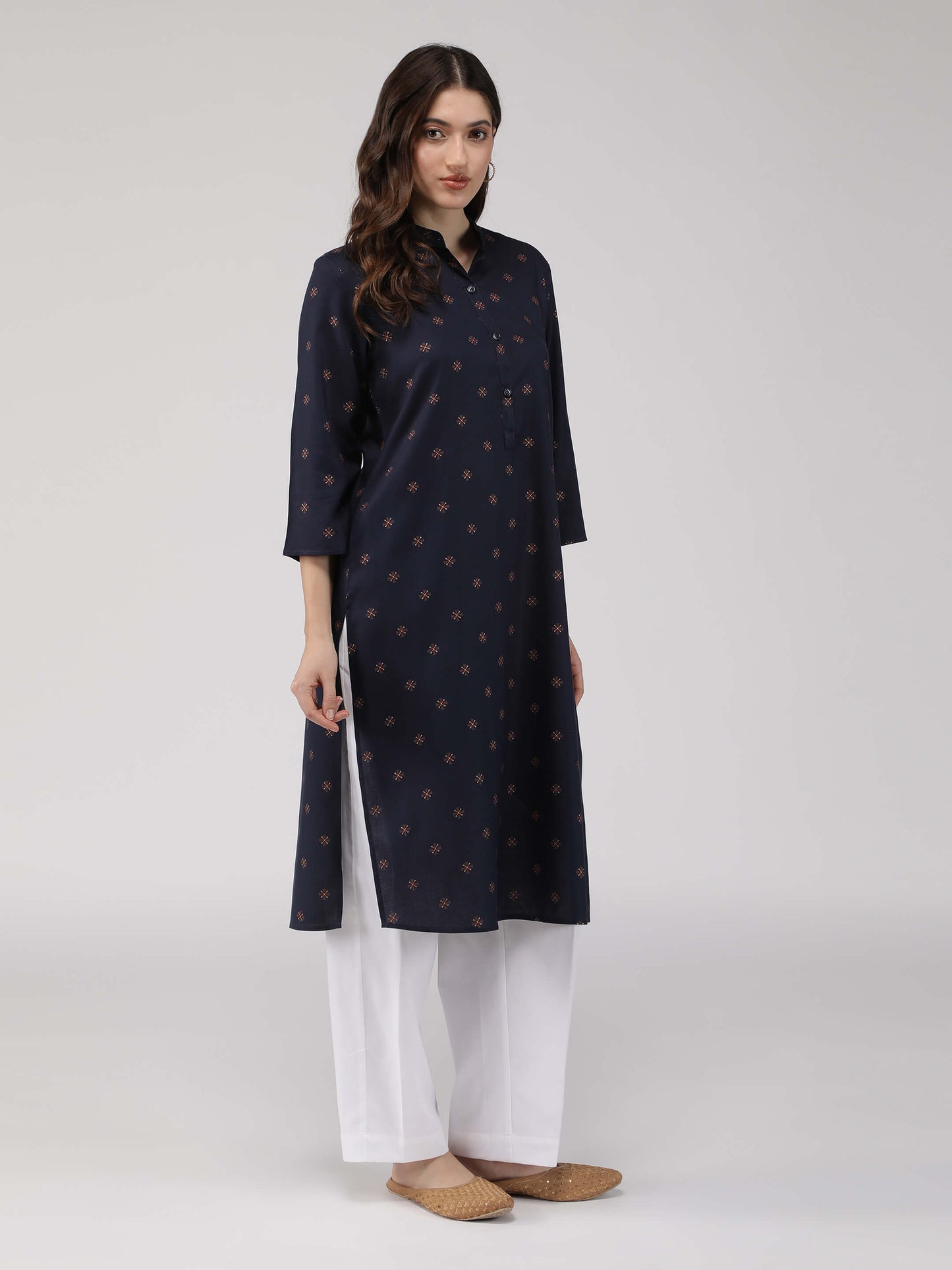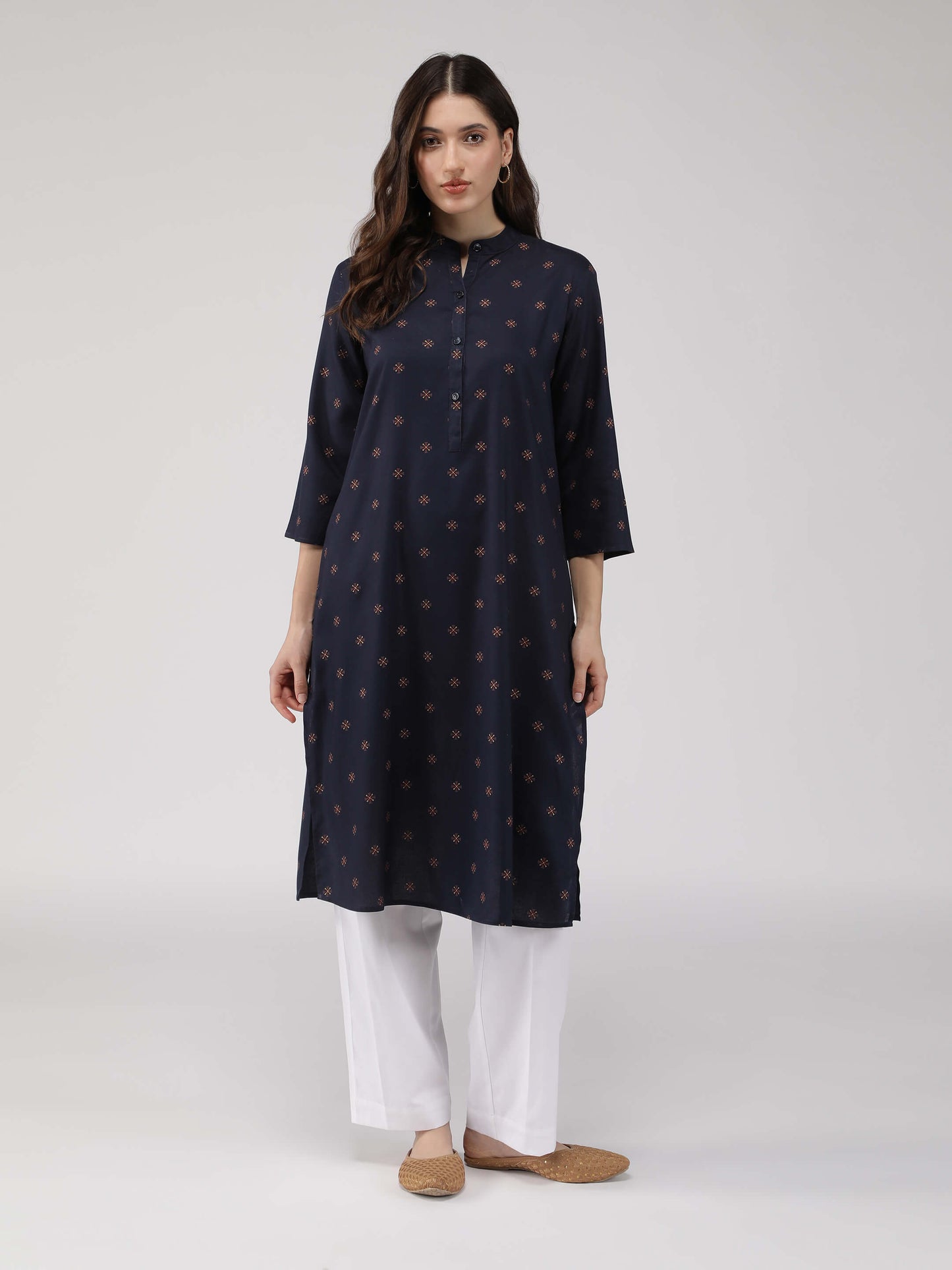 Regular price Rs. 899.00This blue printed kurta features a refined mandarin collar and elegant 3/4 sleeves, combining comfort with understated style. Designed with side slits for ease of movement, it offers a sophisticated silhouette suitable for both casual and formal occasions.