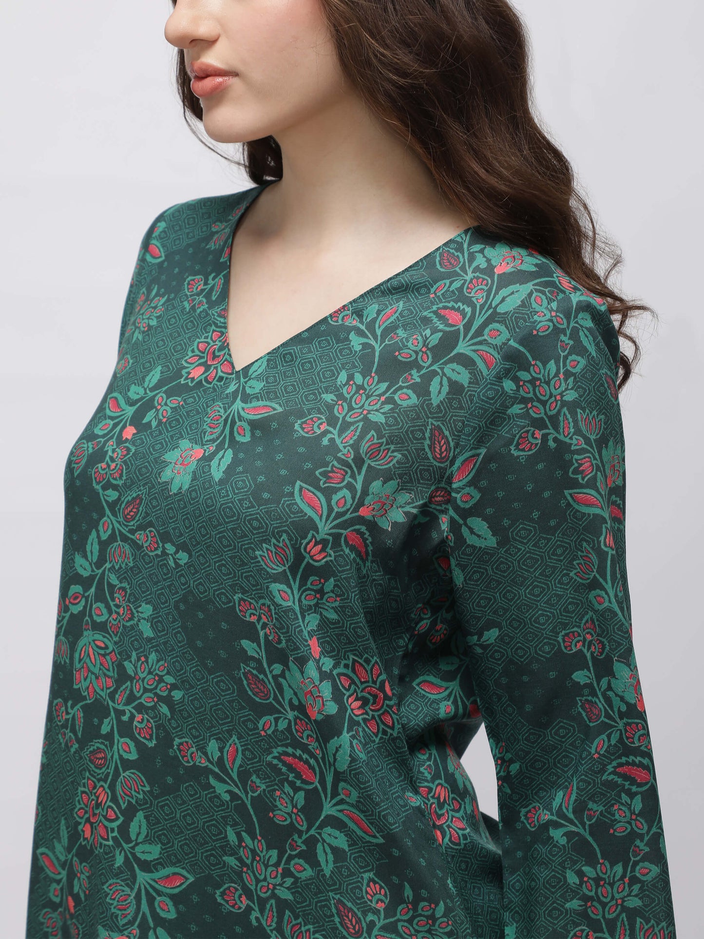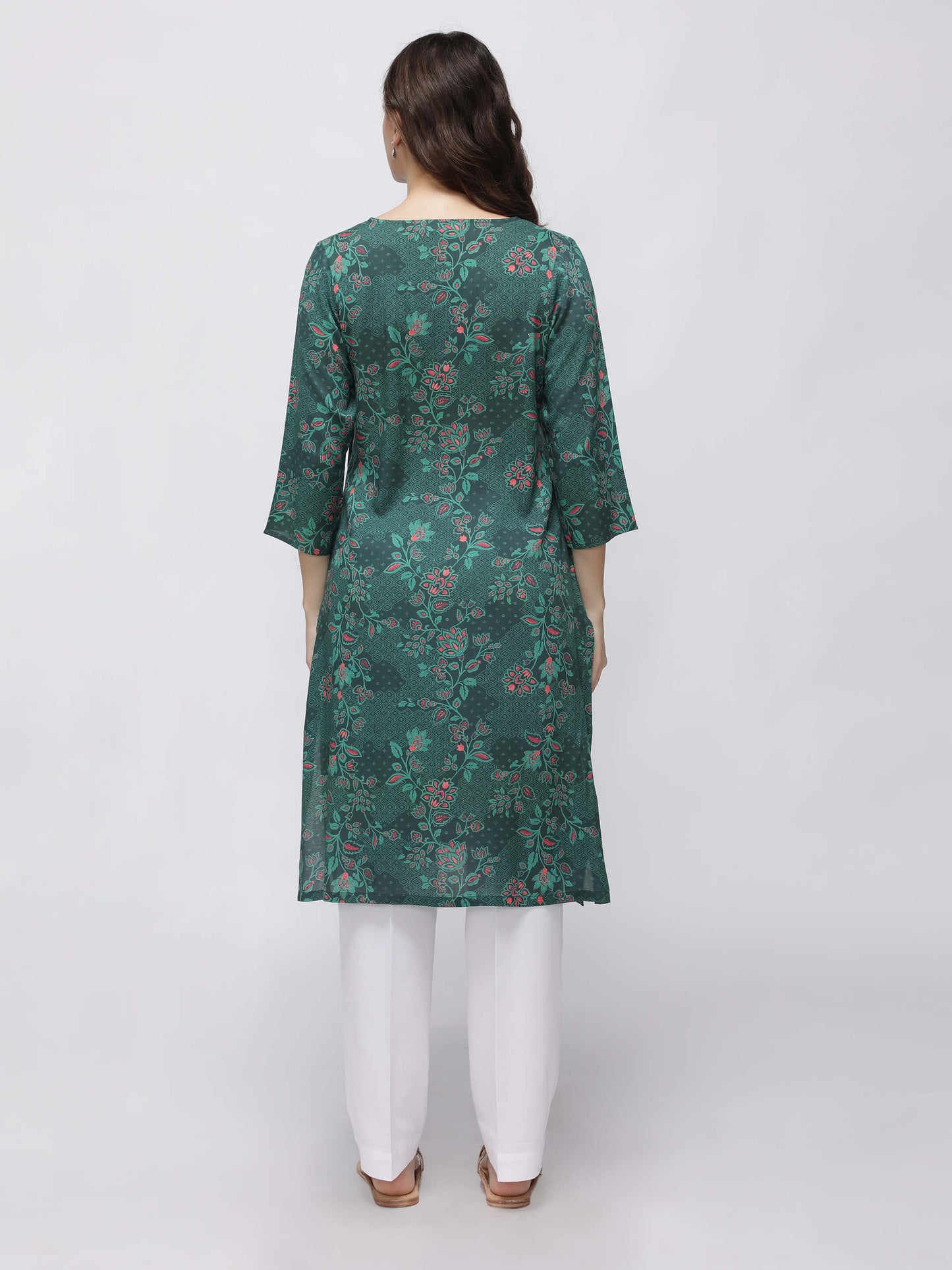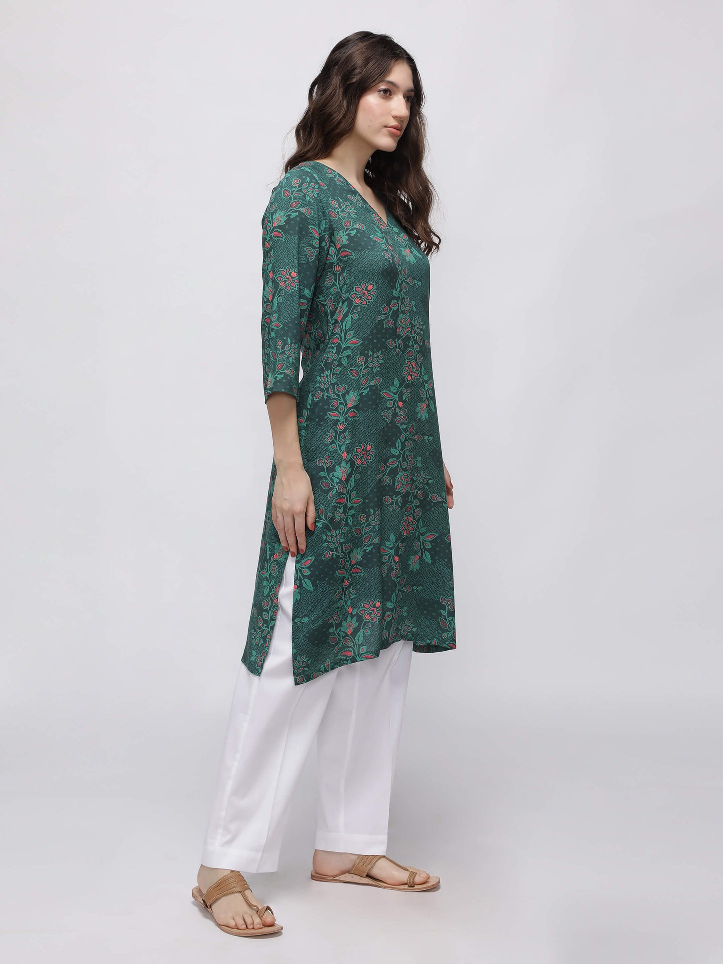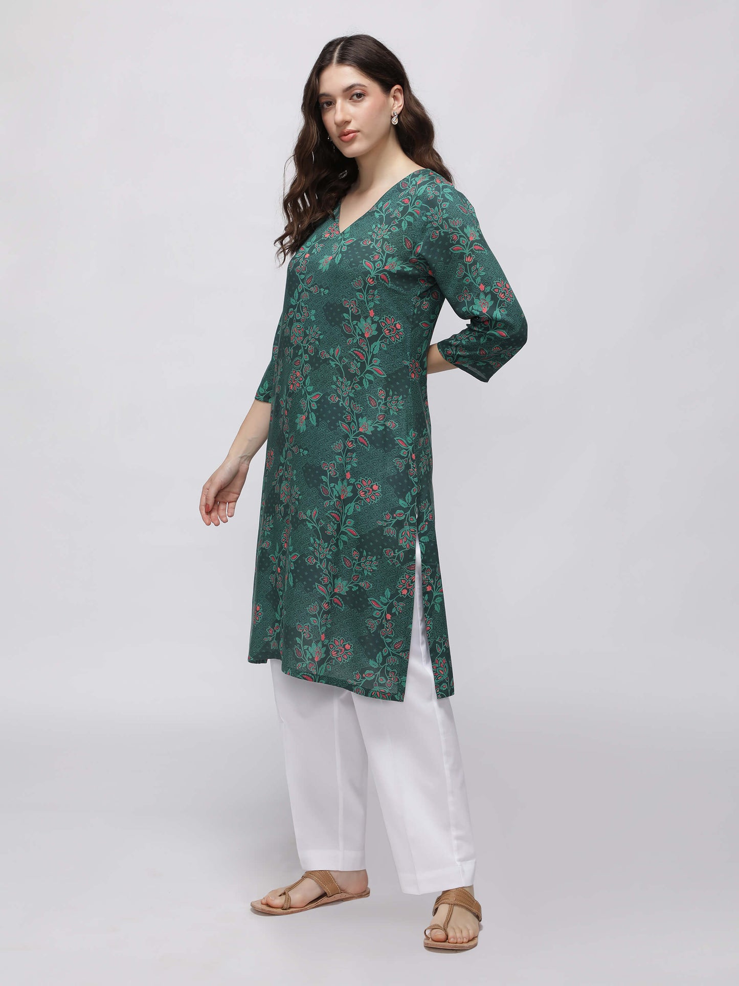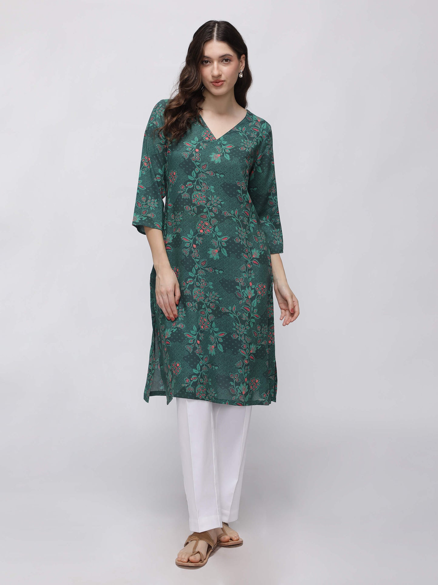 Regular price Rs. 899.00This green printed kurta features a flattering A-line silhouette with a comfortable V-neck and stylish side slits. Made from soft rayon, it offers breathable wear perfect for everyday comfort with a touch of elegance.