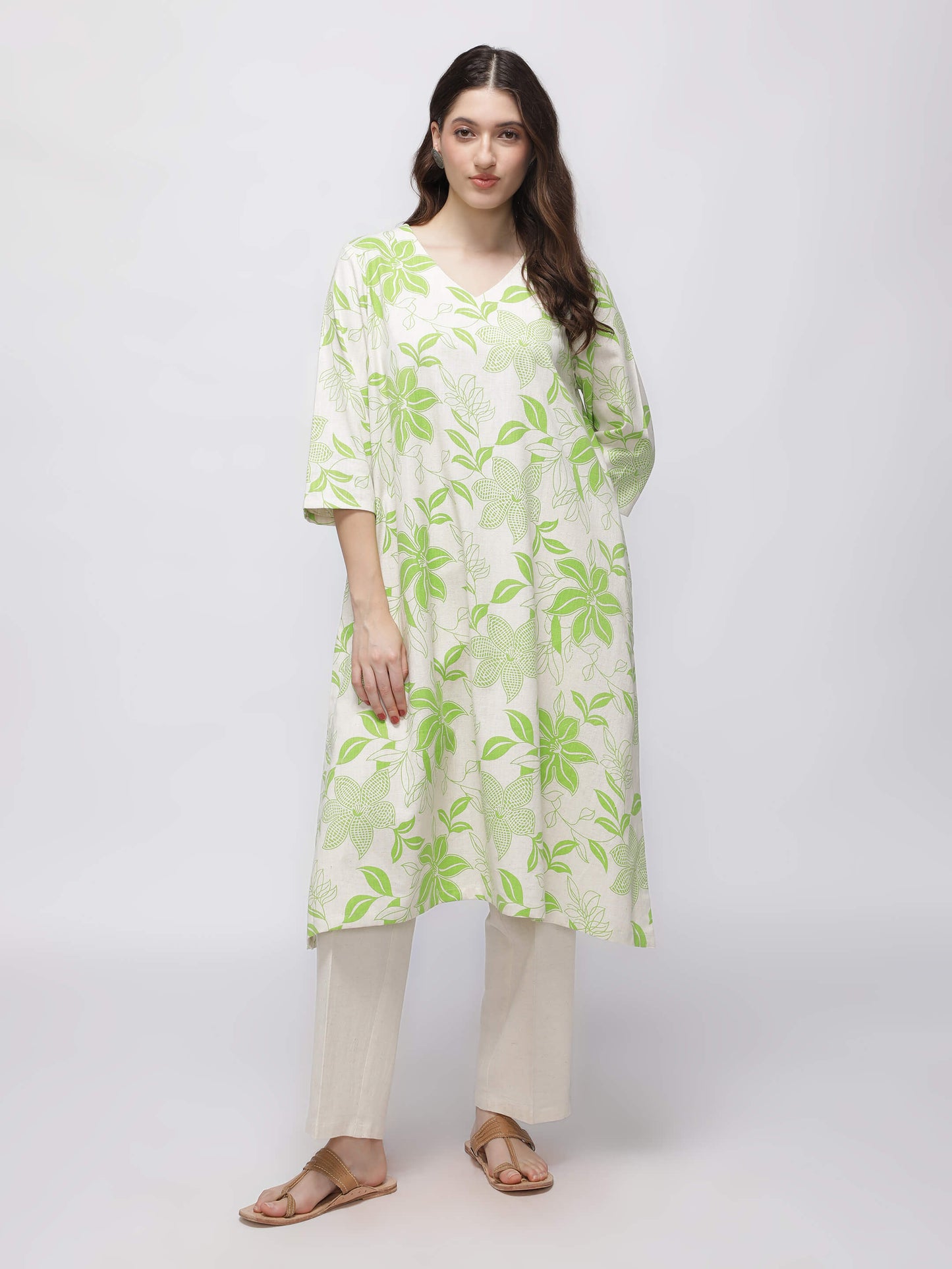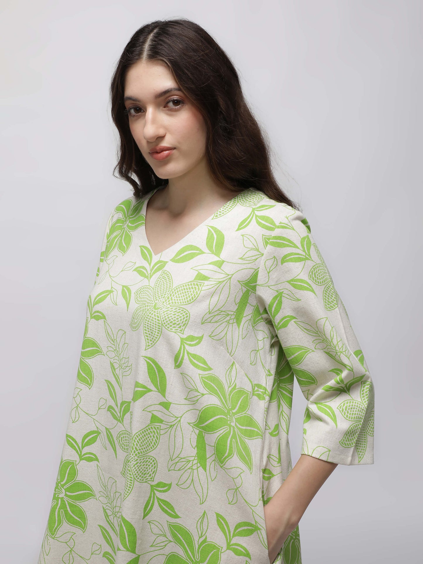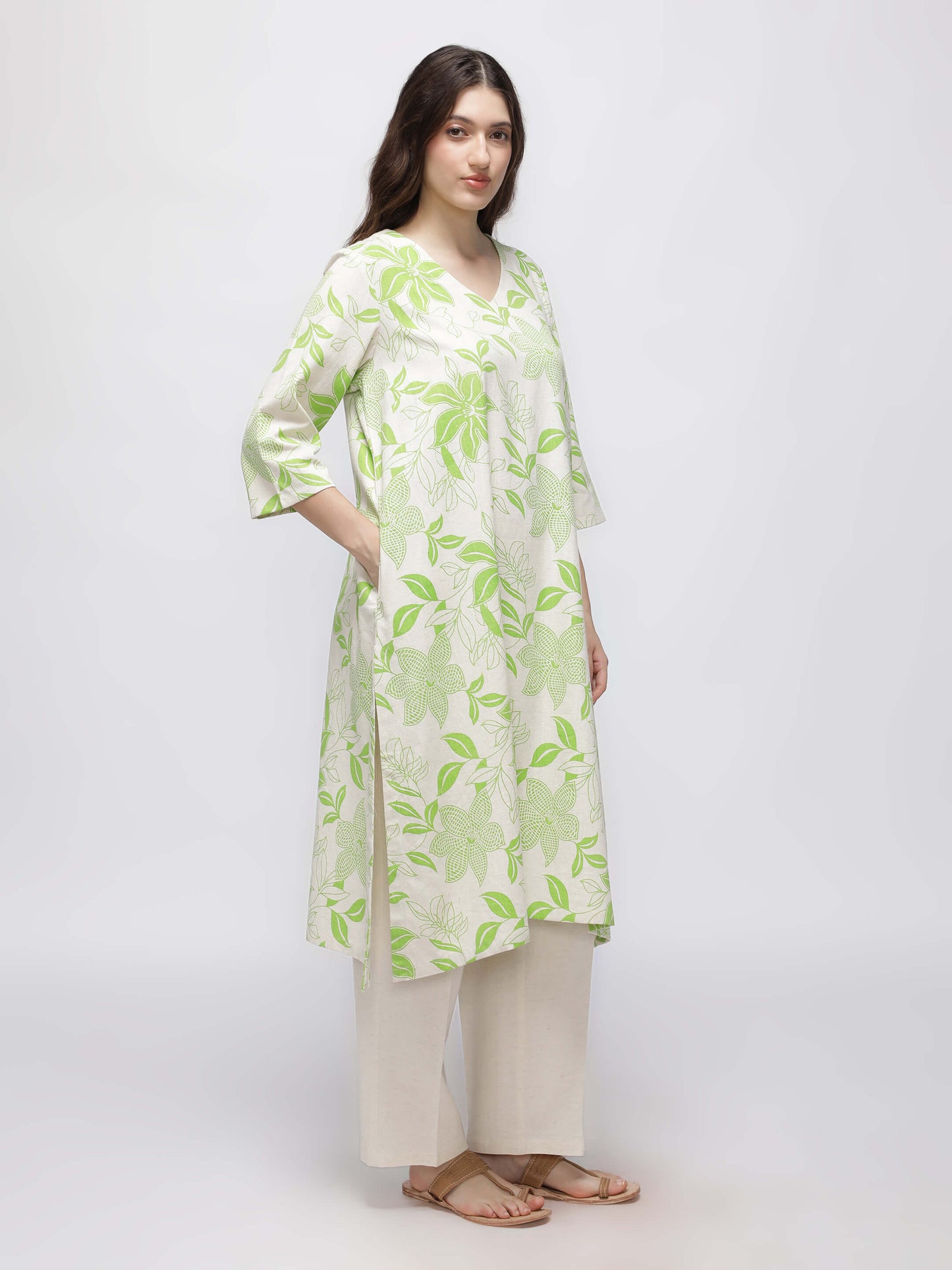 This Green Printed Kurta offers a relaxed fit with a subtle beige and green tropical design and practical pockets for added convenience.