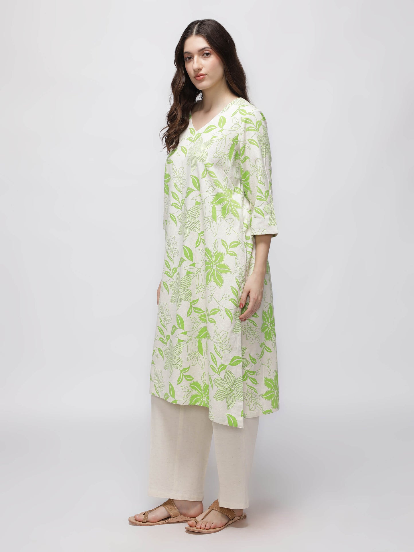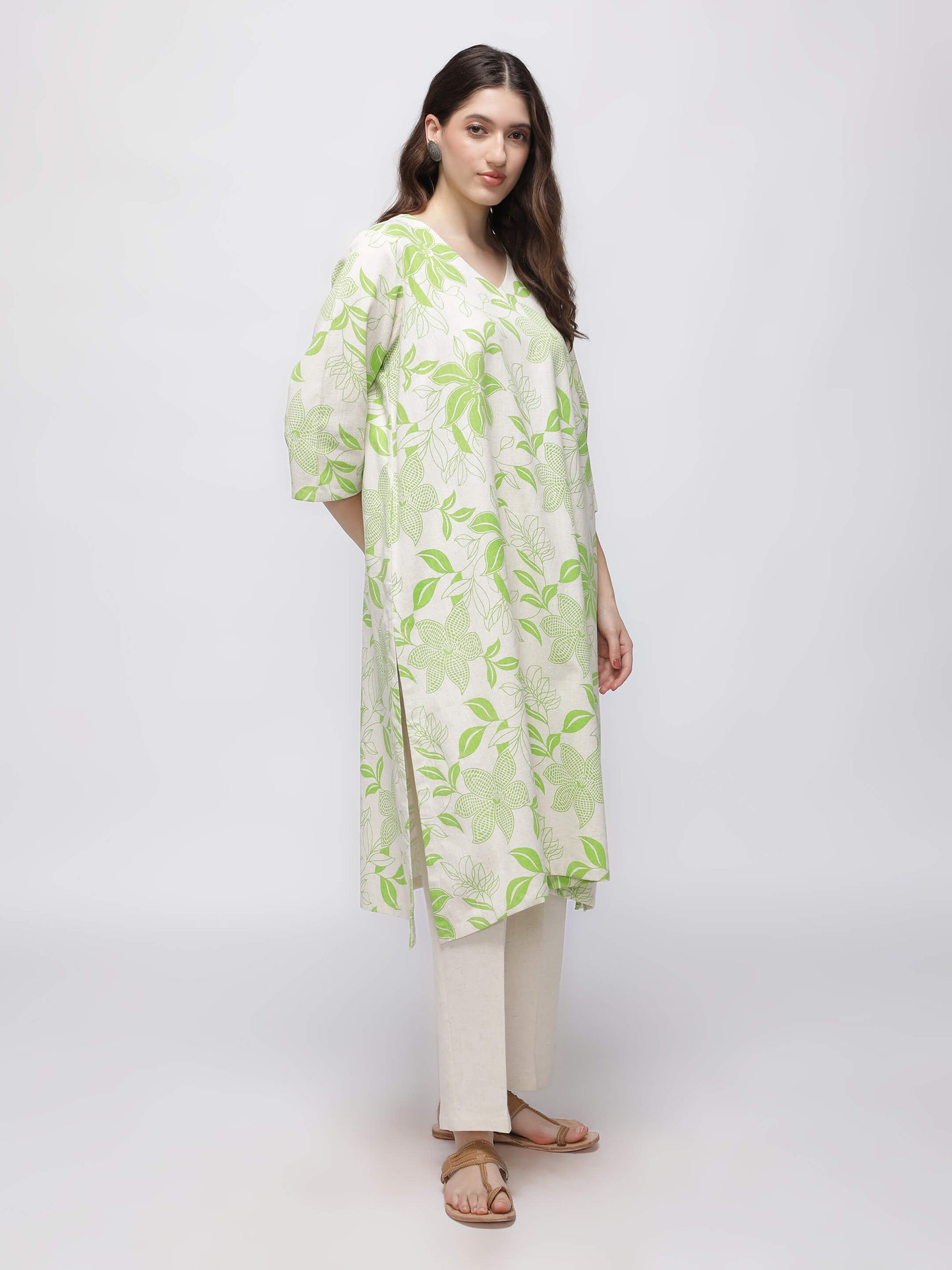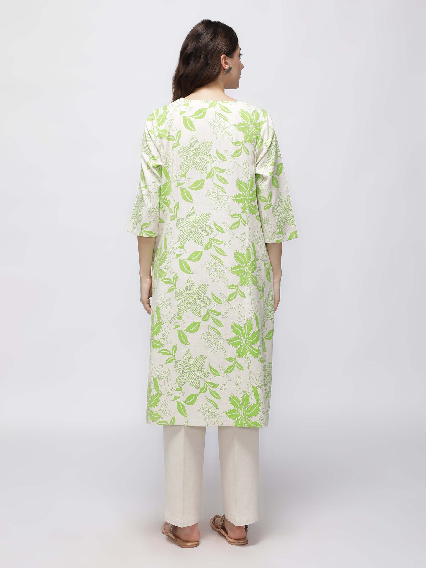 This Green Printed Kurta offers a relaxed fit with a subtle beige and green tropical design and practical pockets for added convenience.
