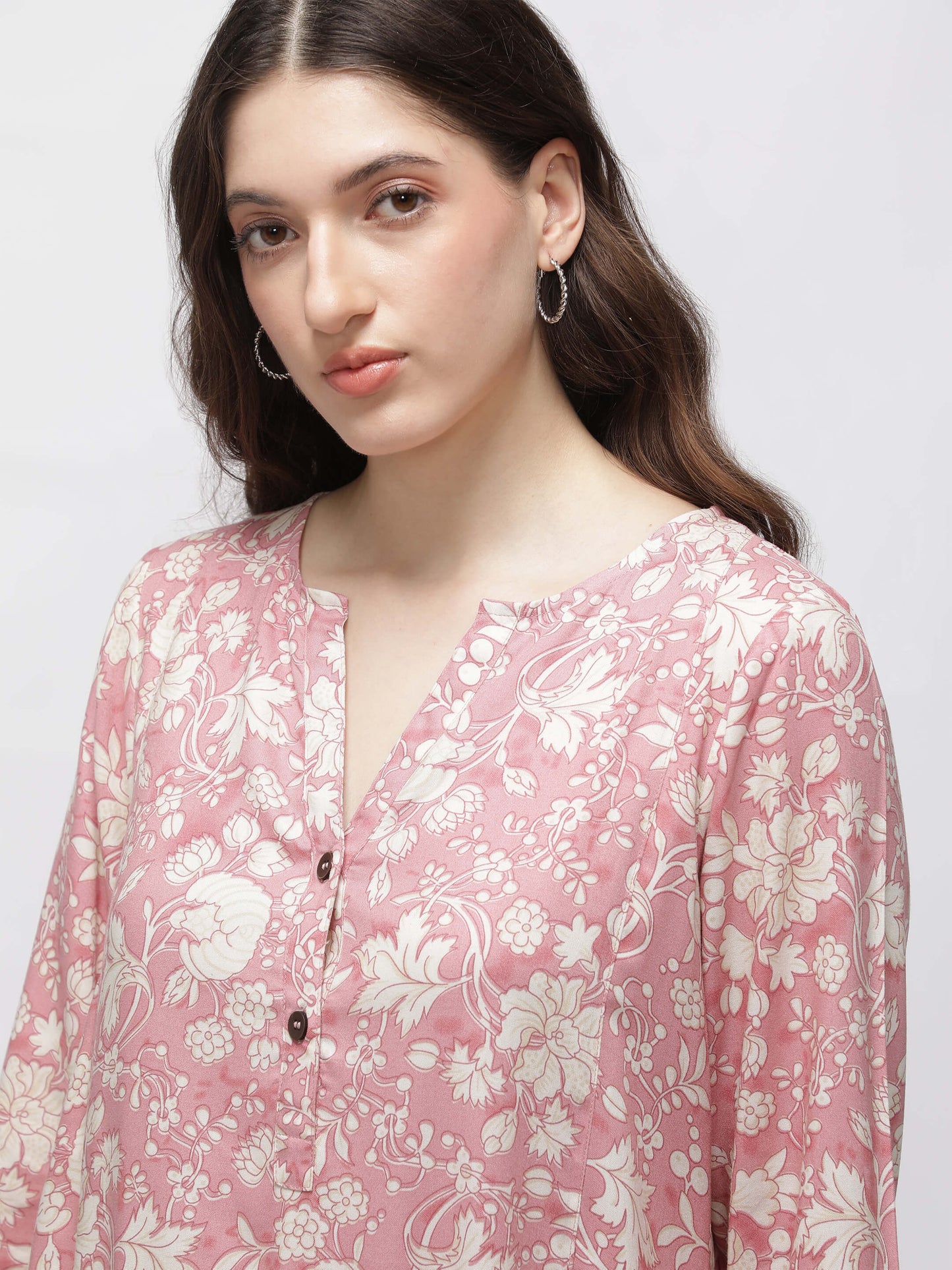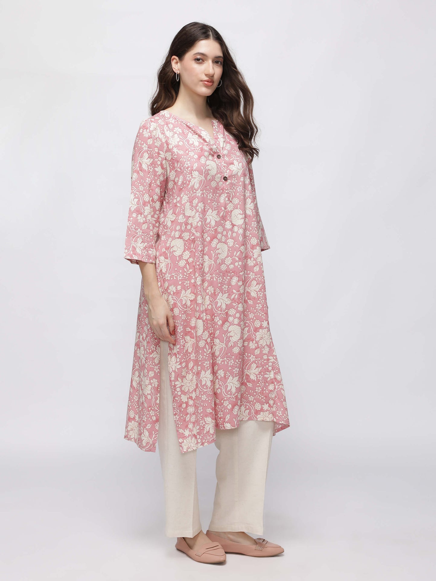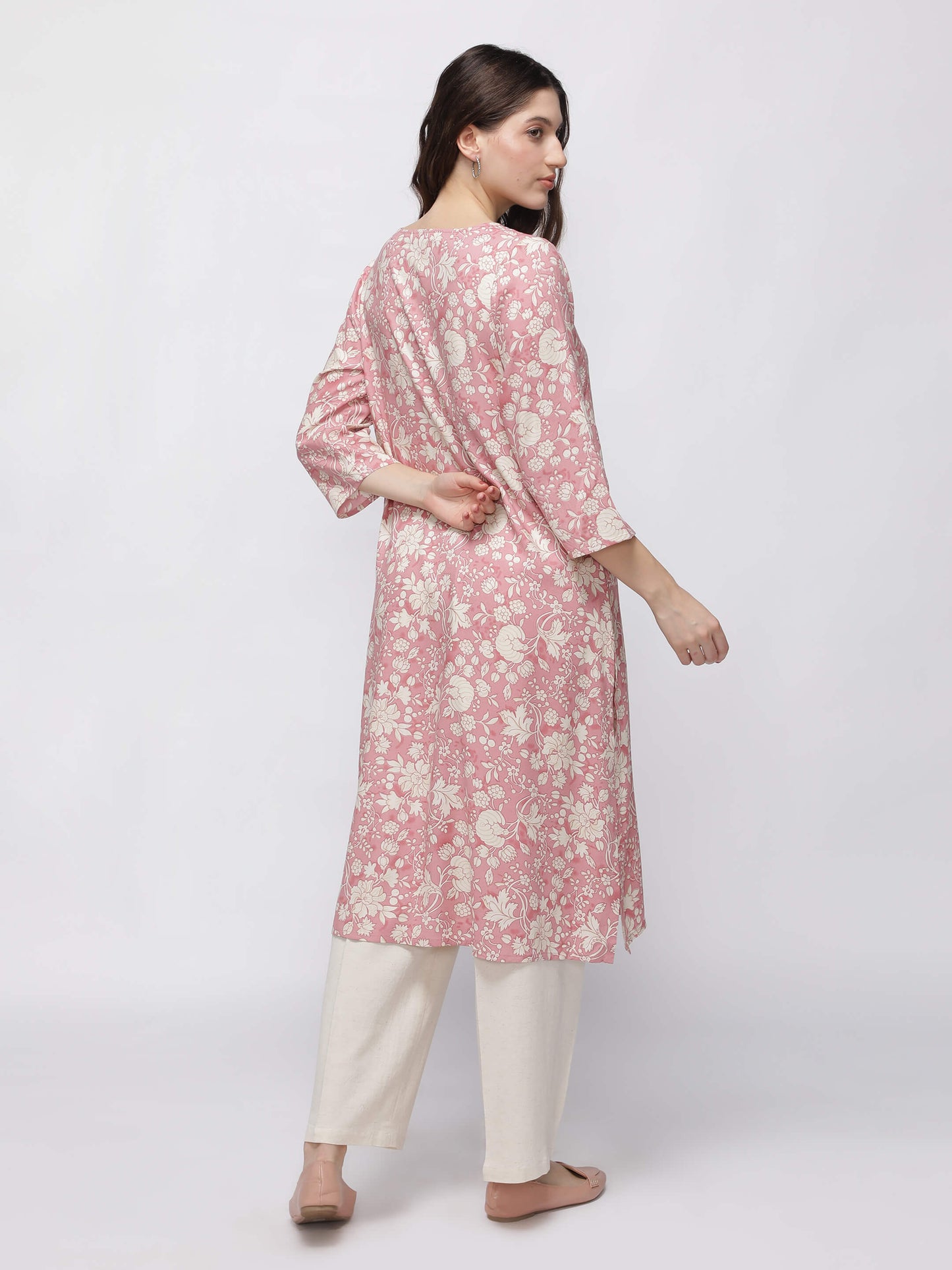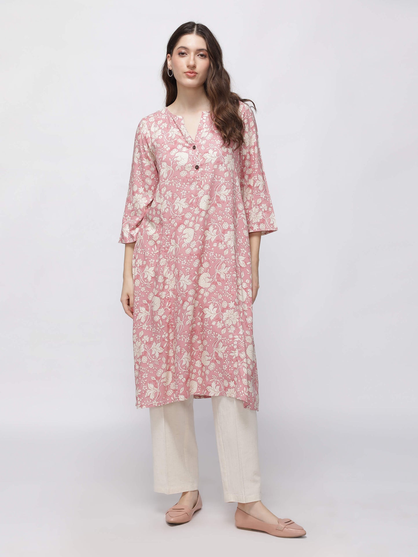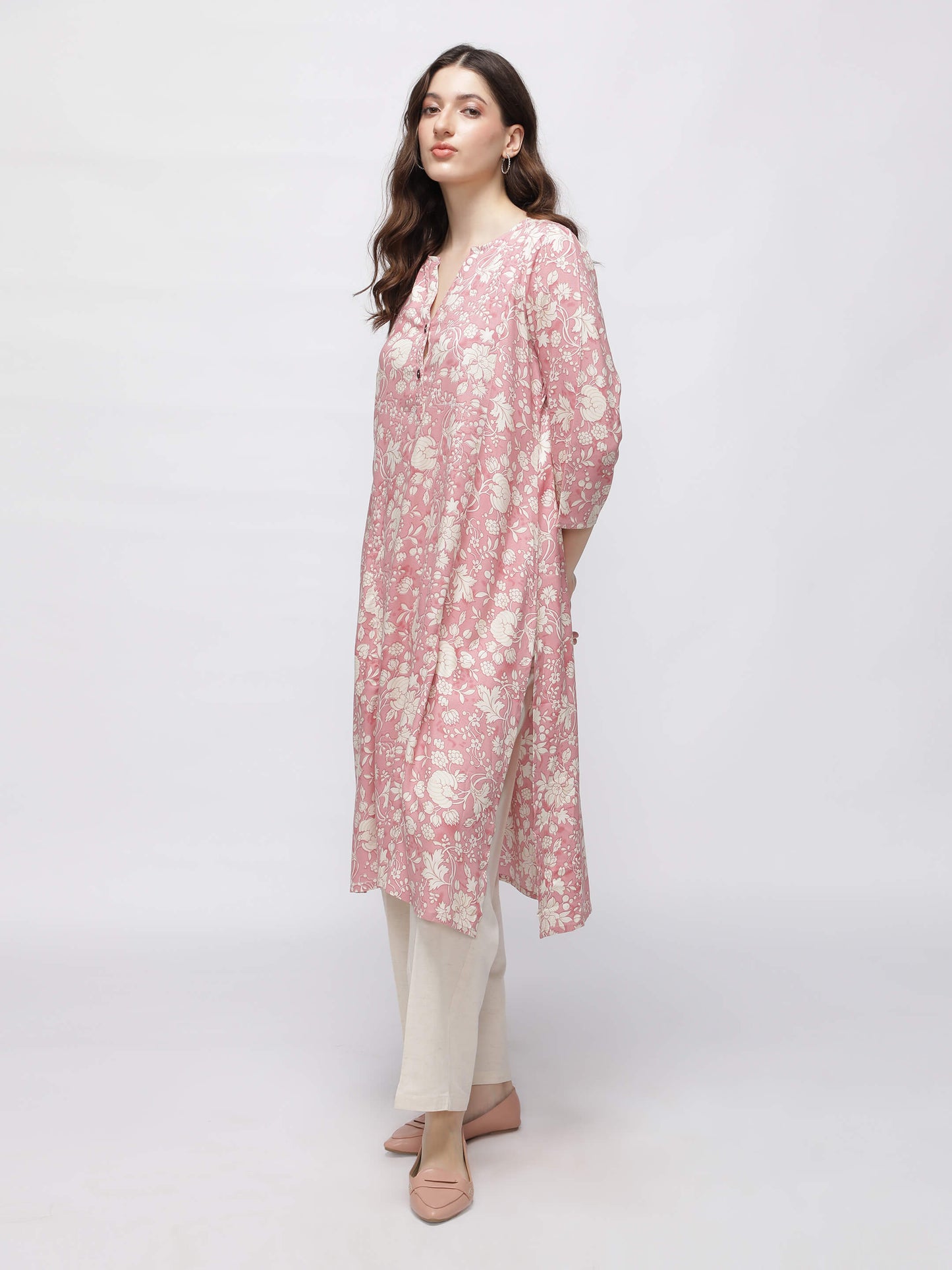 Regular price Rs. 899.00This Pink Floral Kurta features a delicate light pink fabric with an elegant floral print. Its A-line silhouette provides a flattering, comfortable fit, while the side slit adds a modern detail that enhances mobility and style.