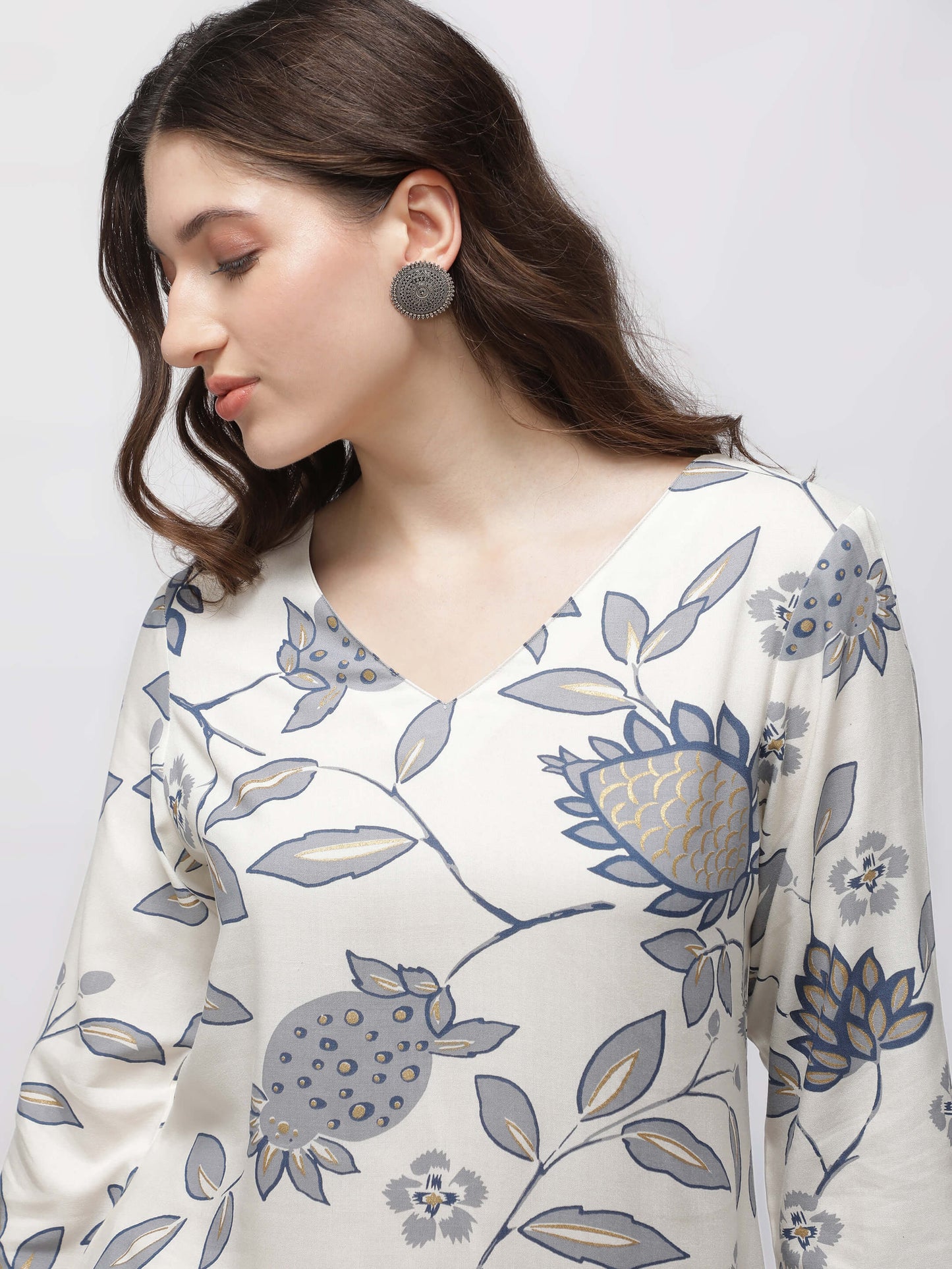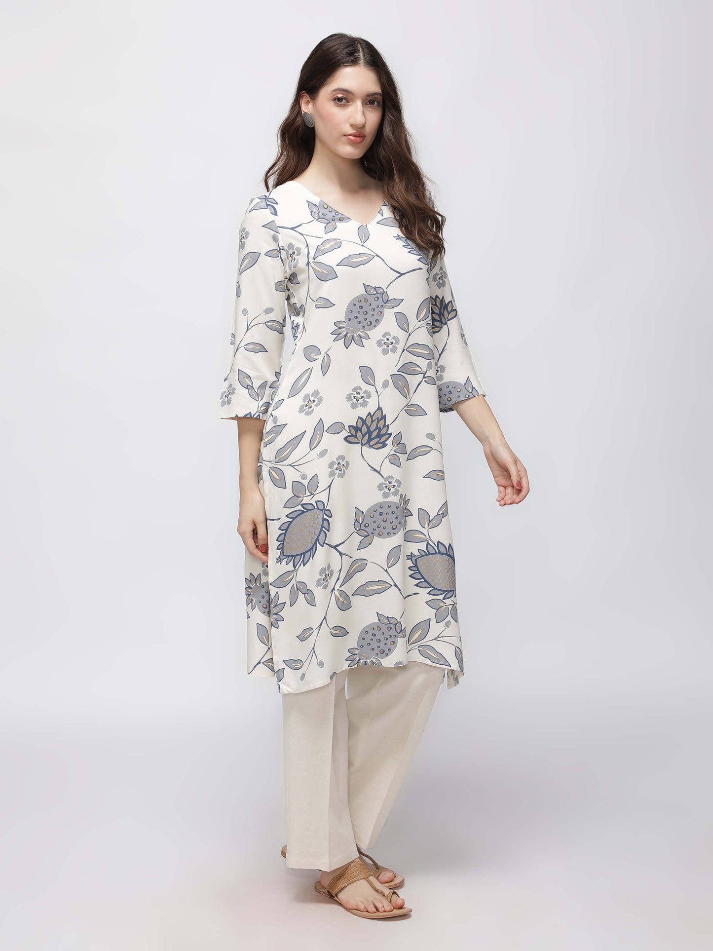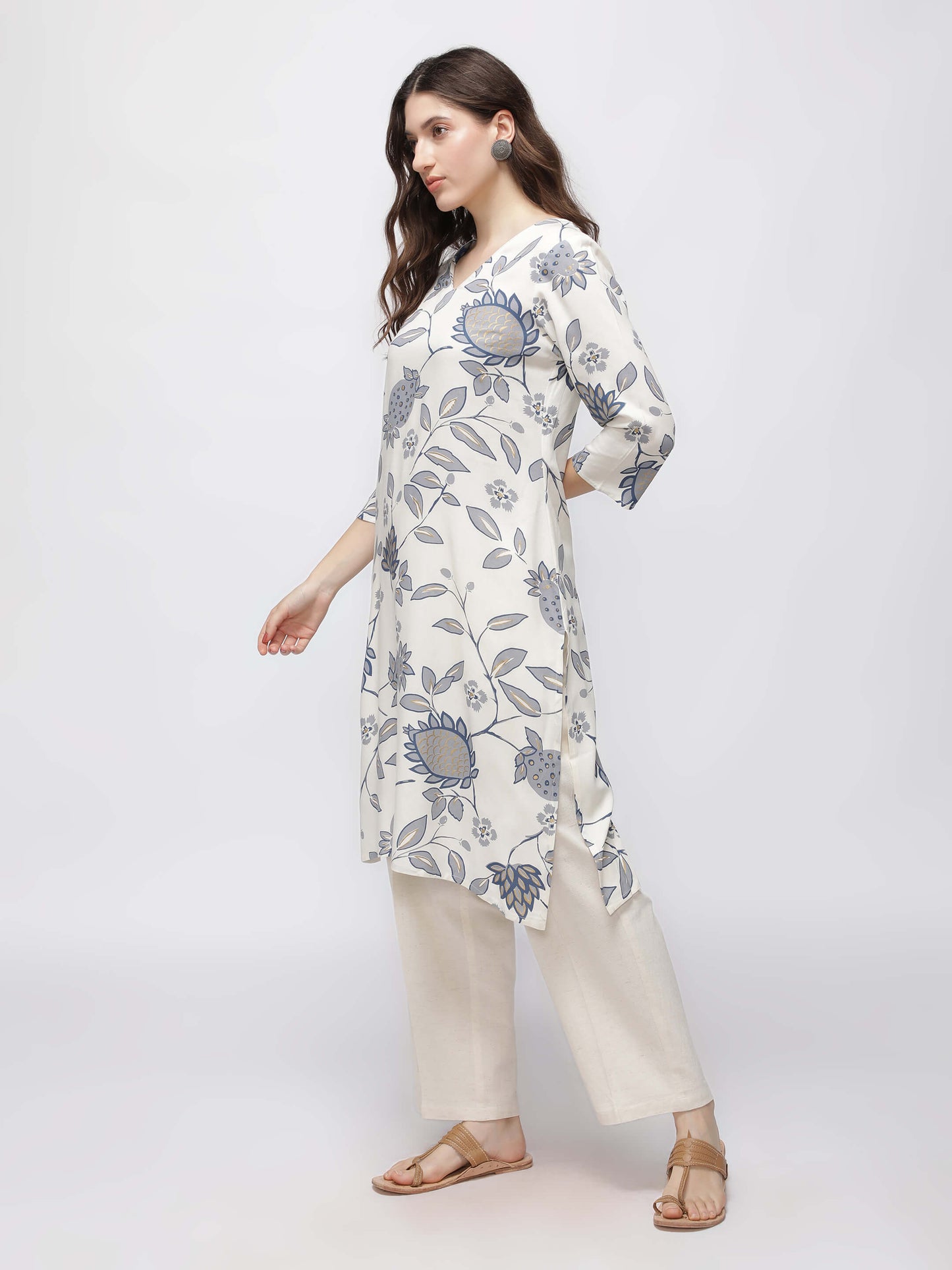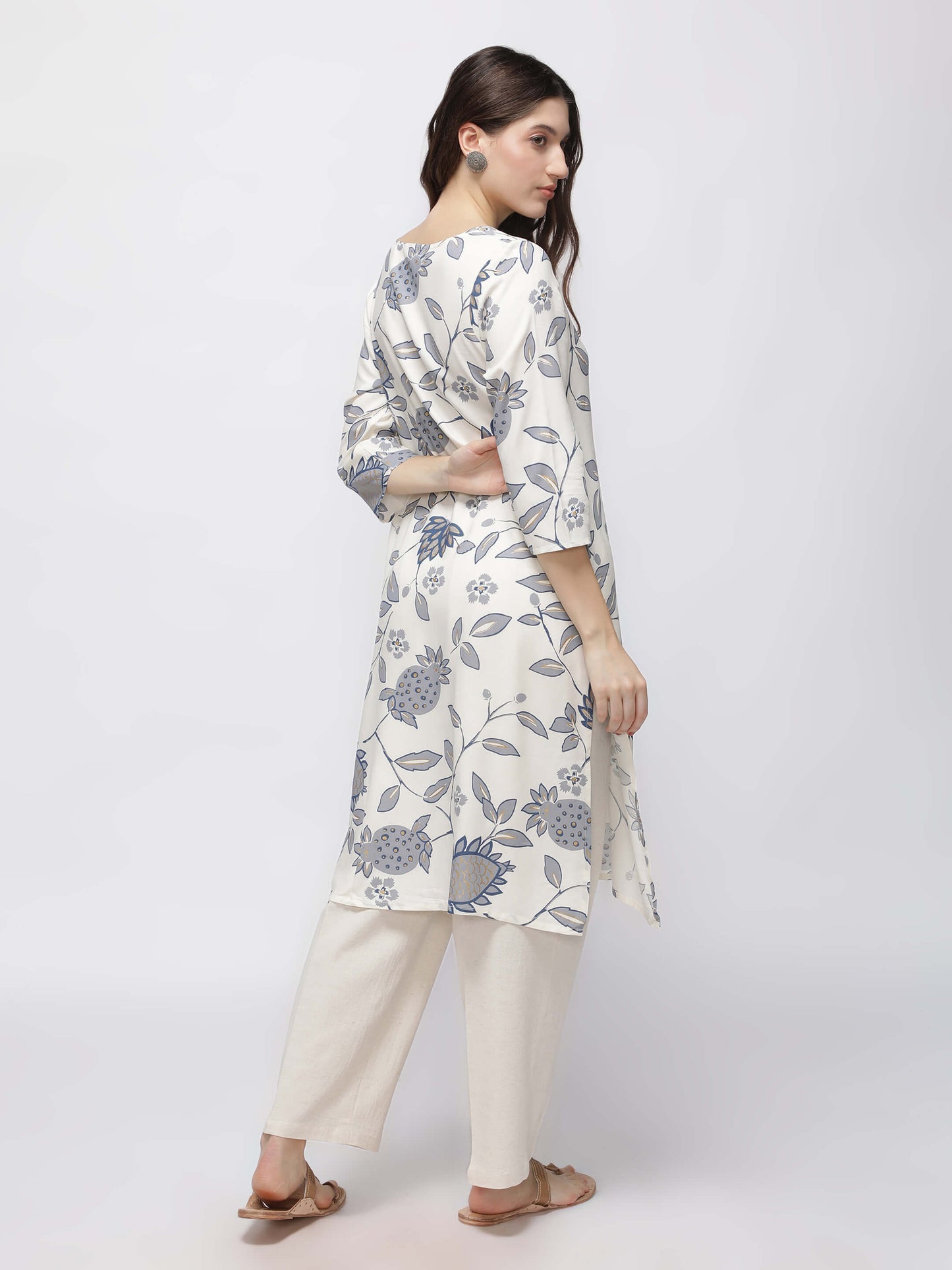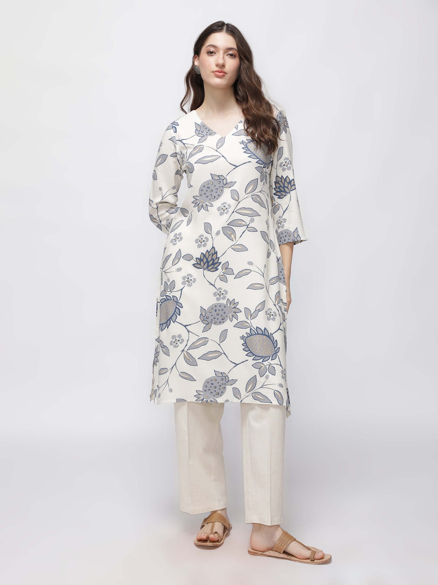Regular price Rs. 899.00This White Tropical Kurta features a stylish V-neck and side slit for comfort and ease. Its elegant tropical print adds a refined touch, perfect for casual or semi-formal wear in warm weather.