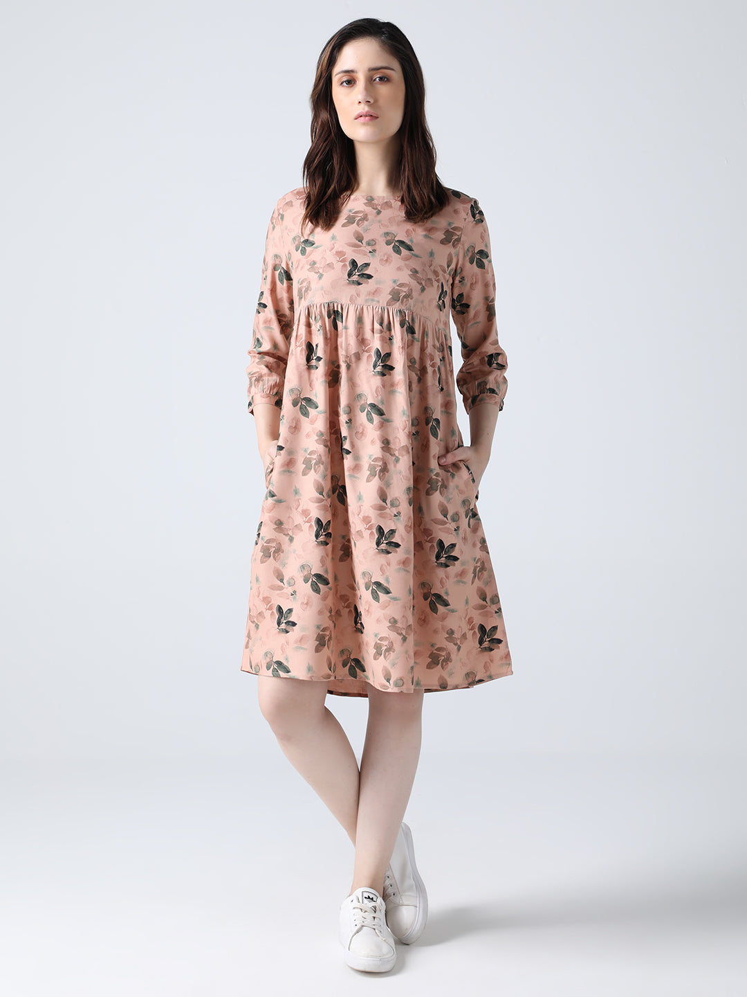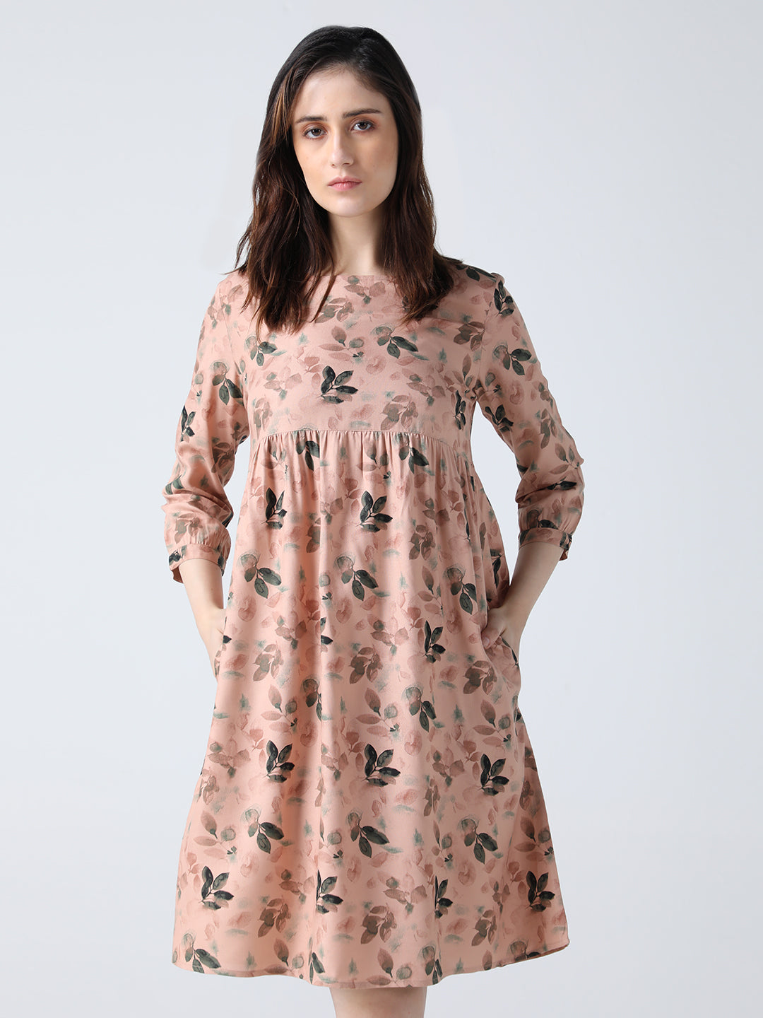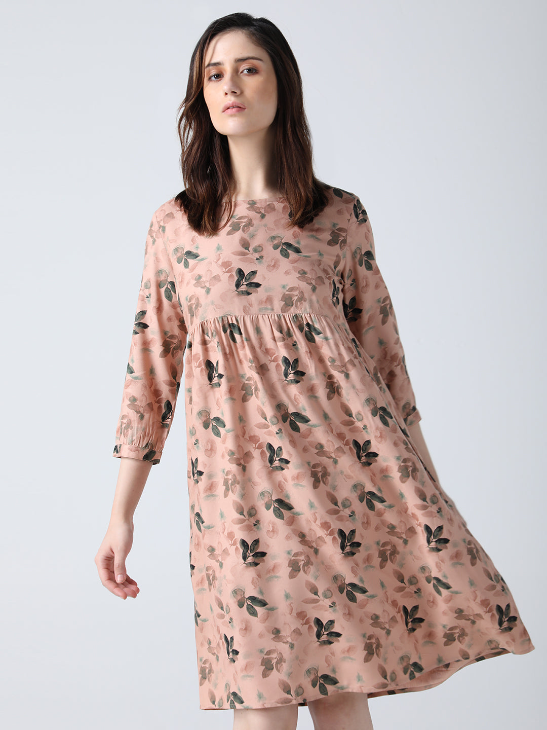 This midi dress in beige features a floral print and is made from soft rayon fabric. A stylish and comfortable choice for various occasions.