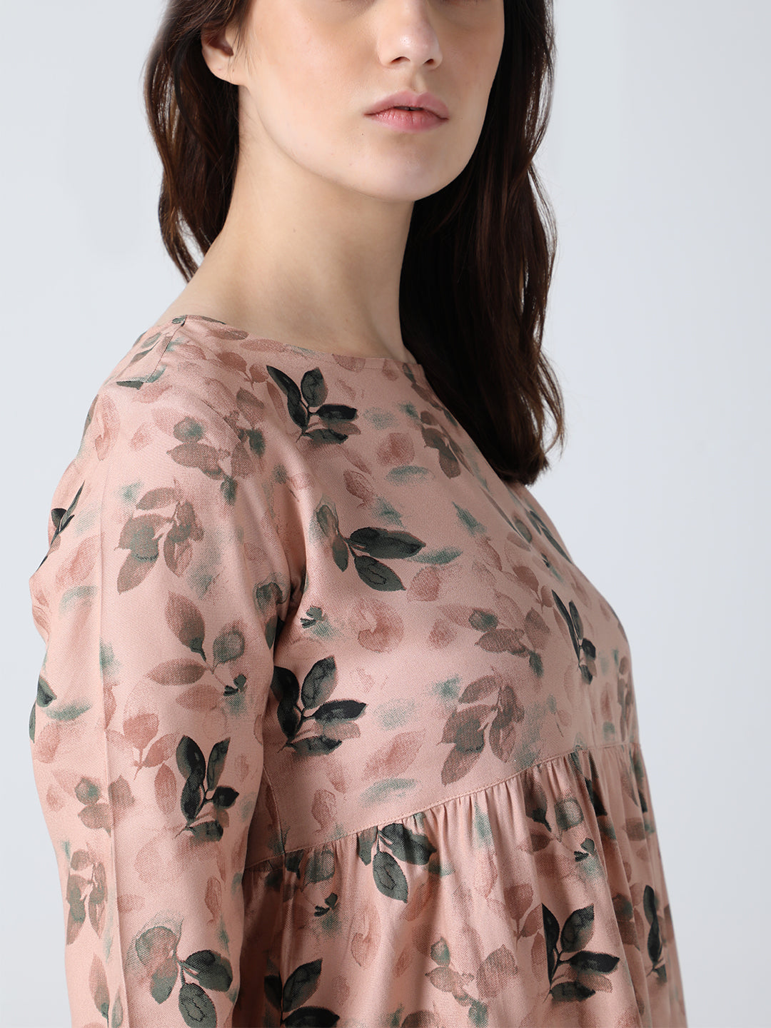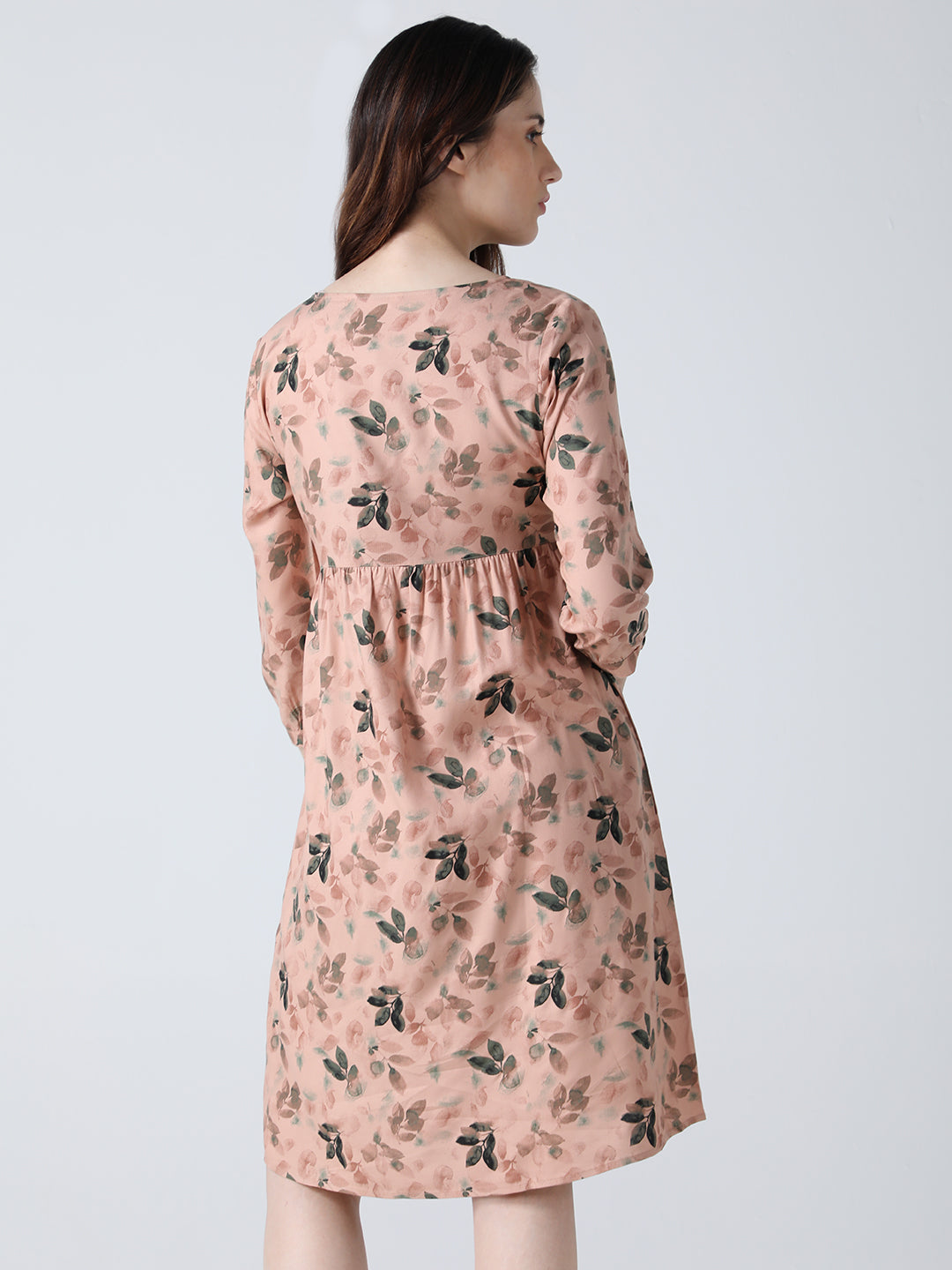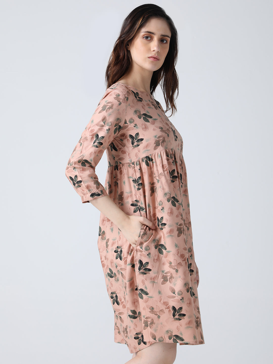 This midi dress in beige features a floral print and is made from soft rayon fabric. A stylish and comfortable choice for various occasions.