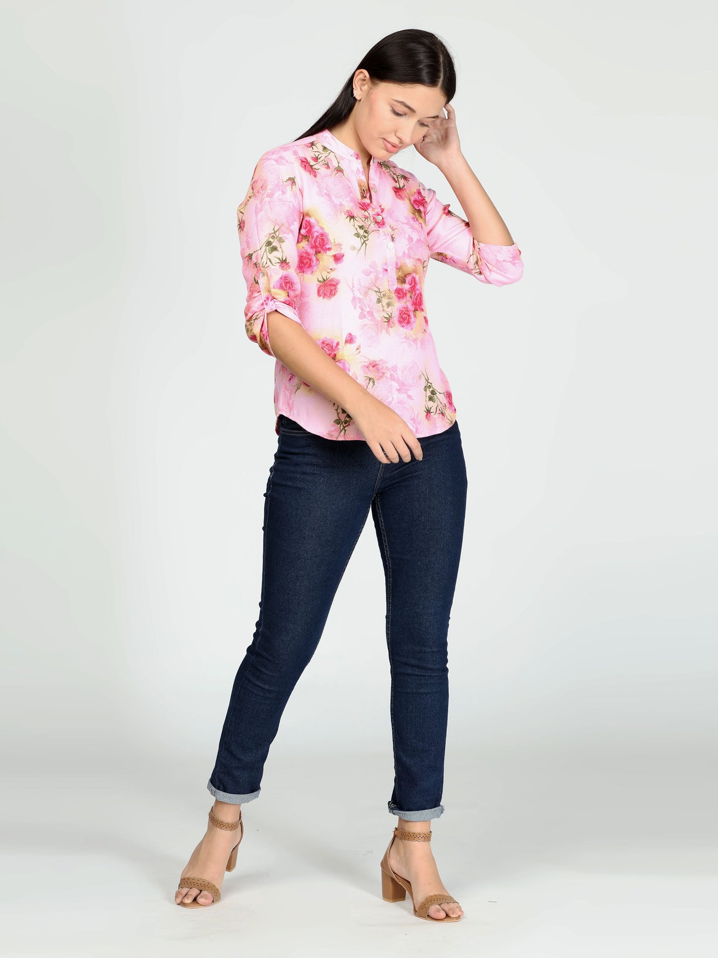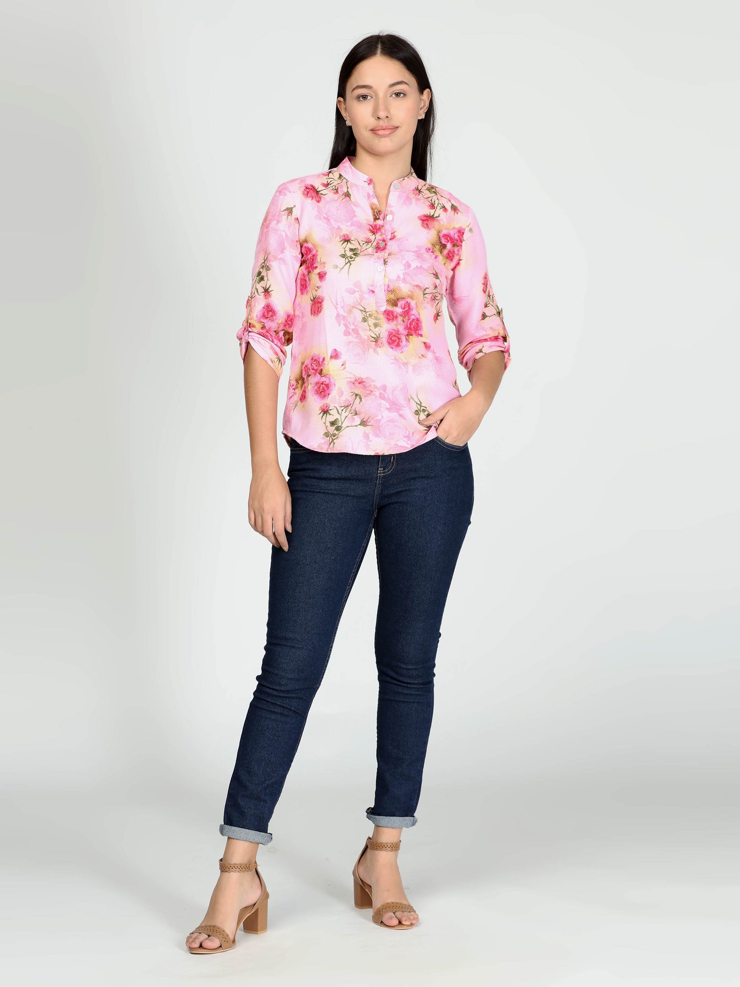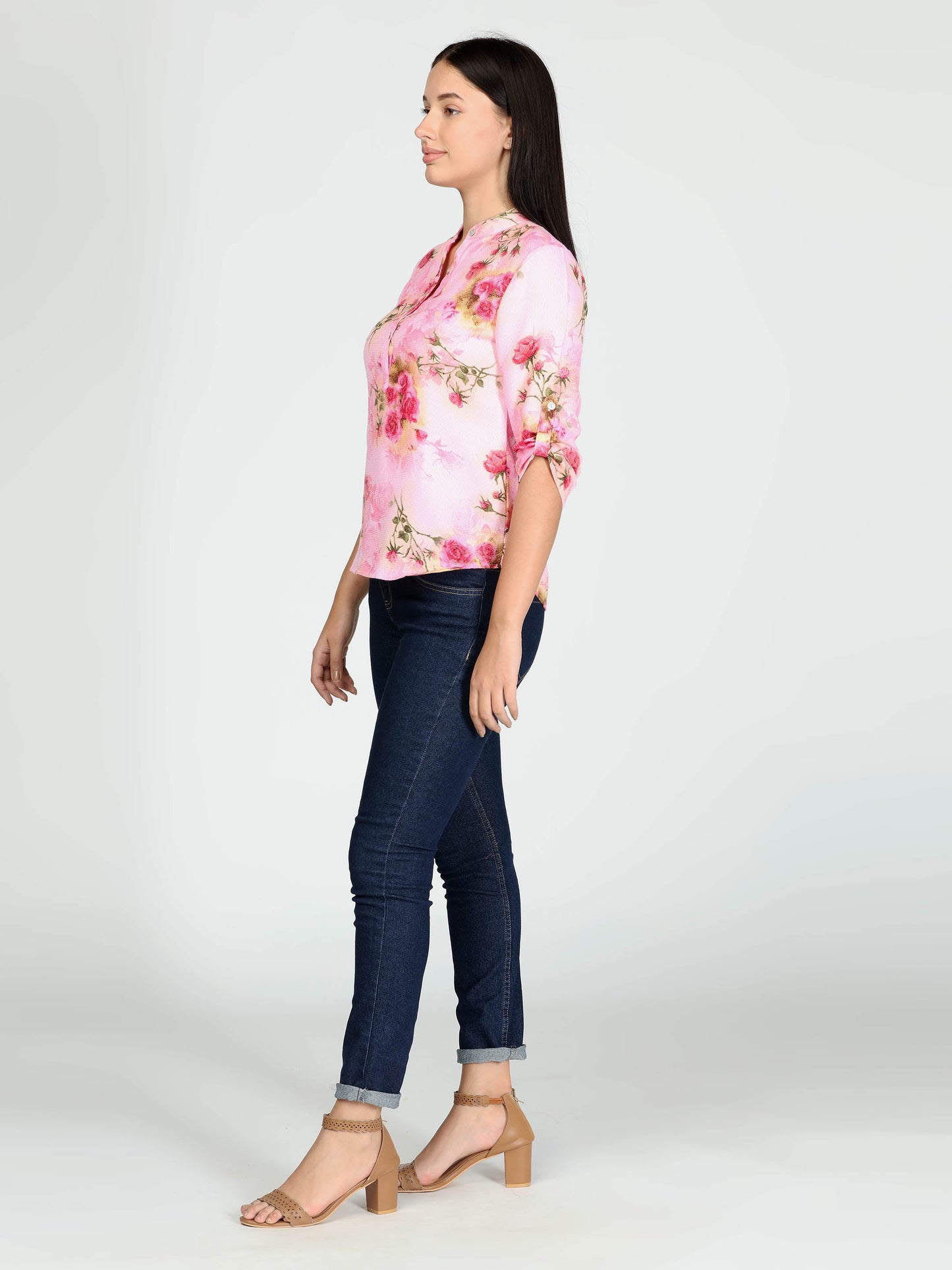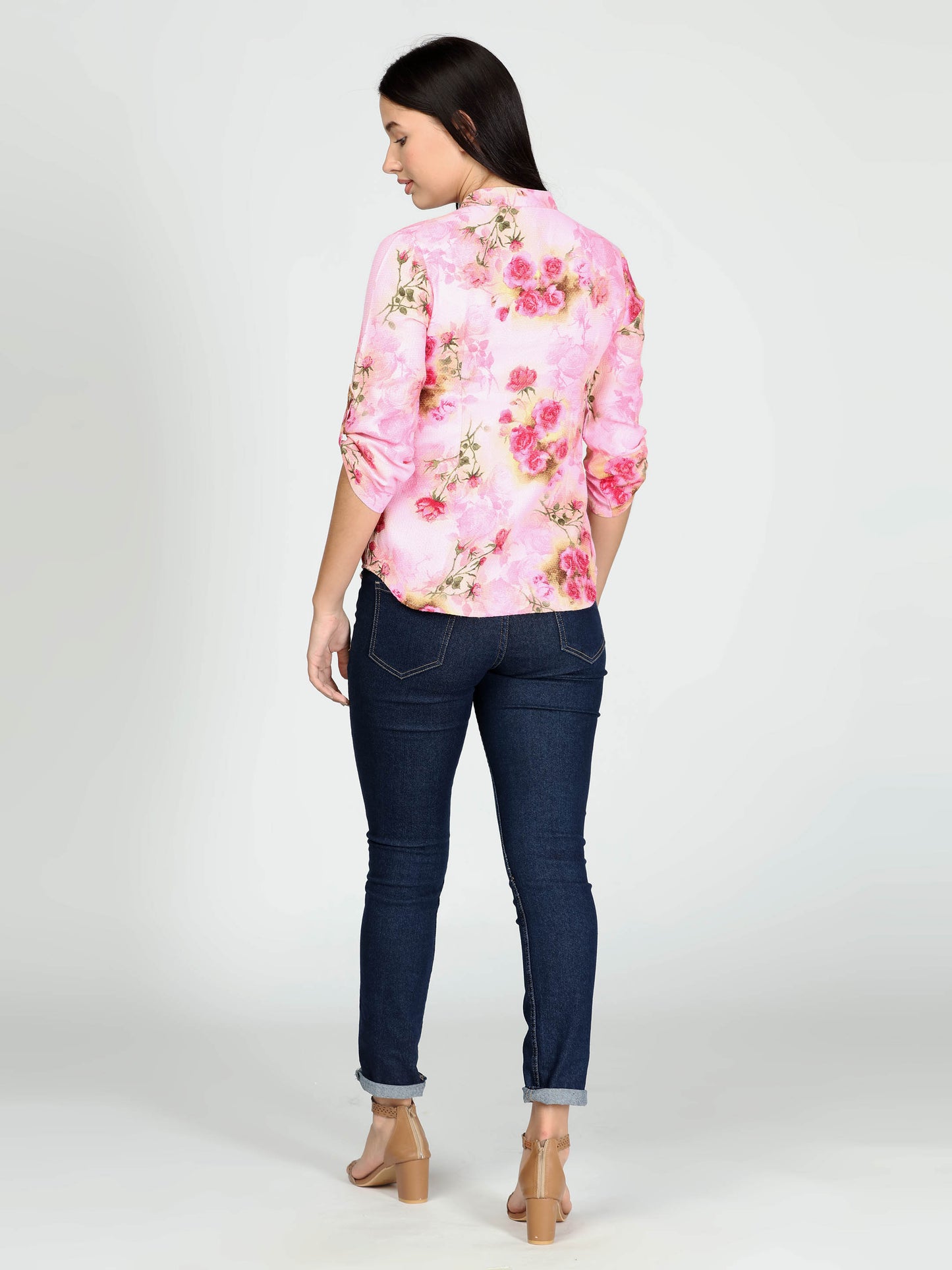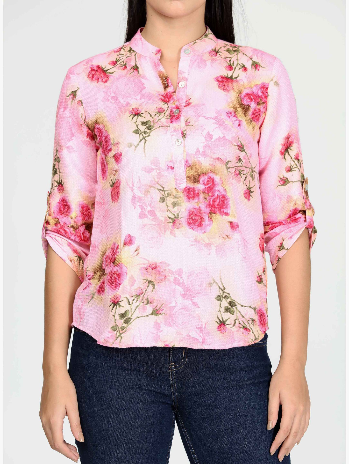 Pink floral stand collar top, three quarter sleeves.