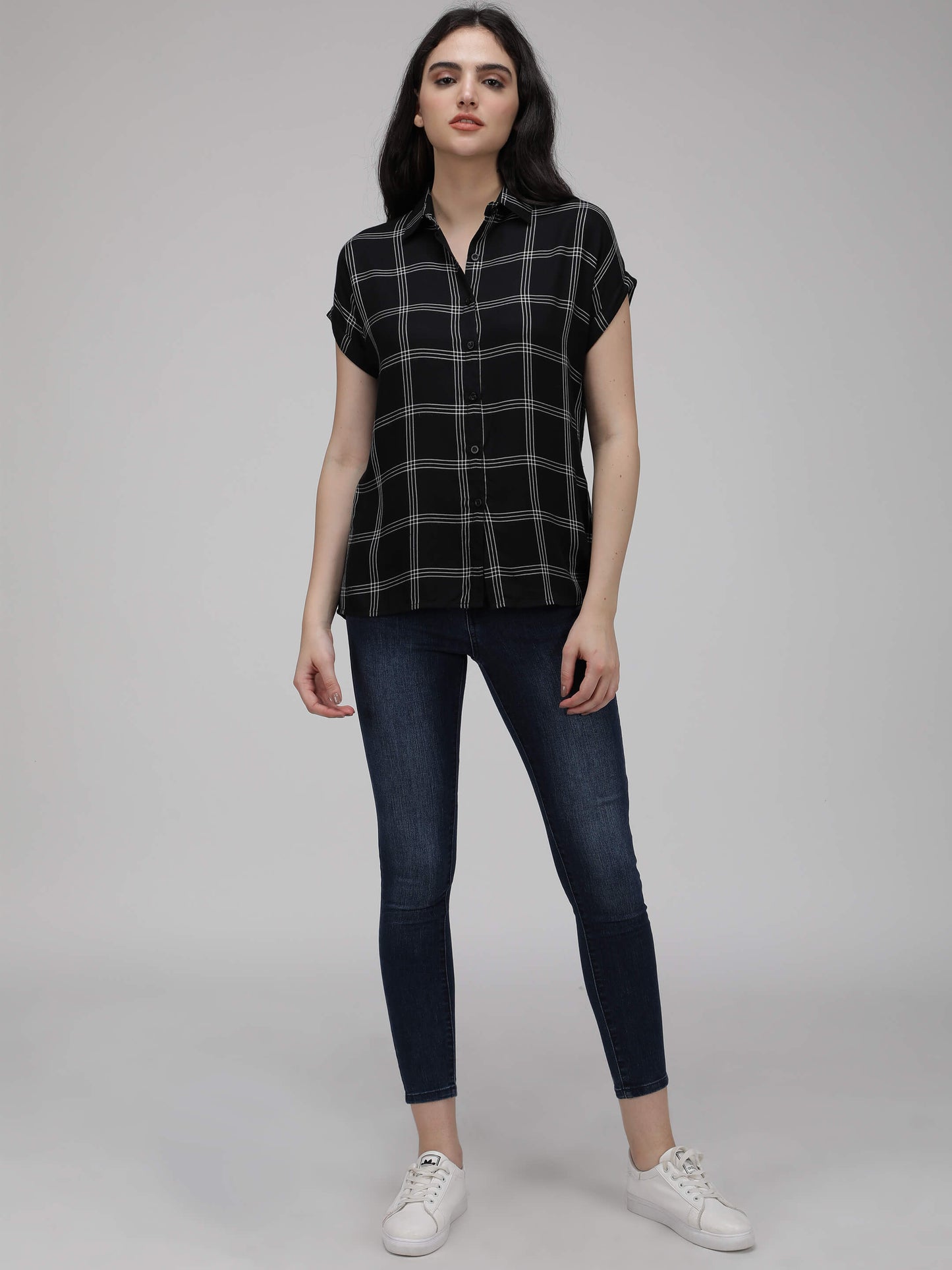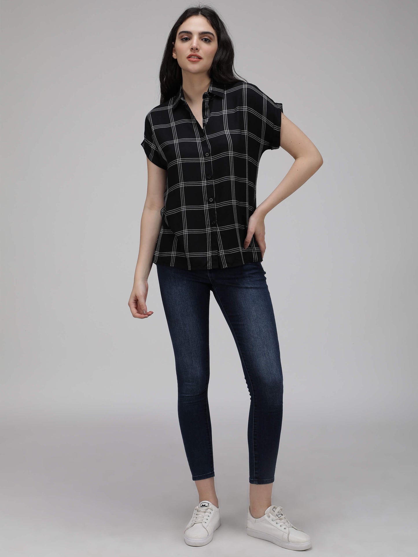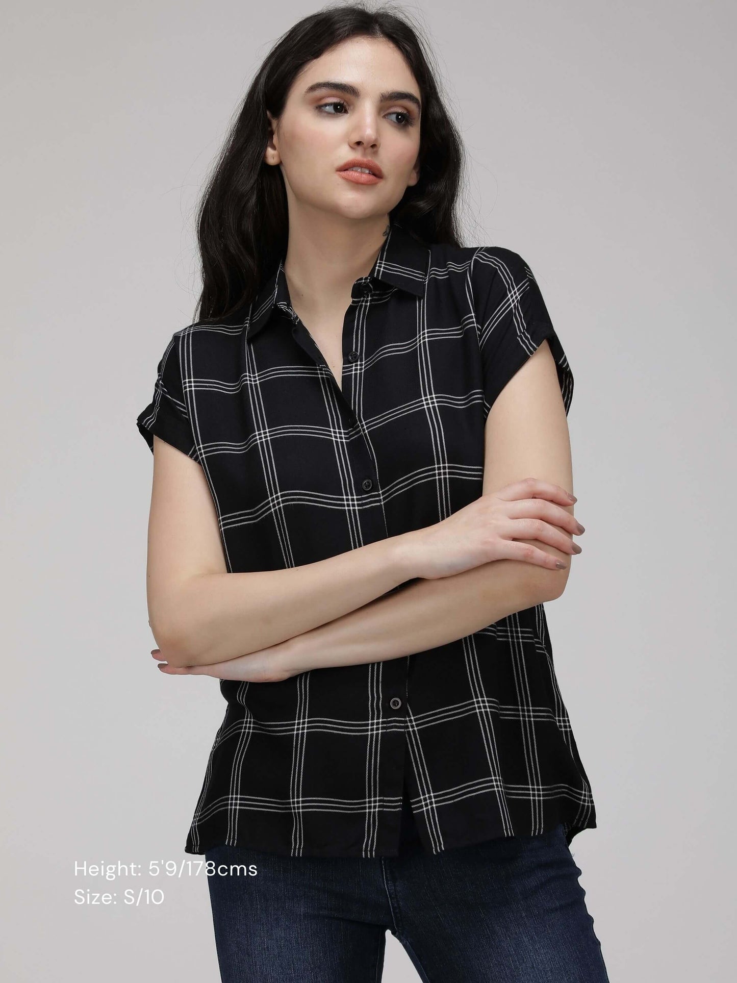 Regular price Rs. 690.00This regular fit black checkered top is crafted from lightweight rayon twill fabric and features extended shoulder sleeves for a stylish and modern fit. The fabric is lightweight and breathable, perfect for day to day wear.