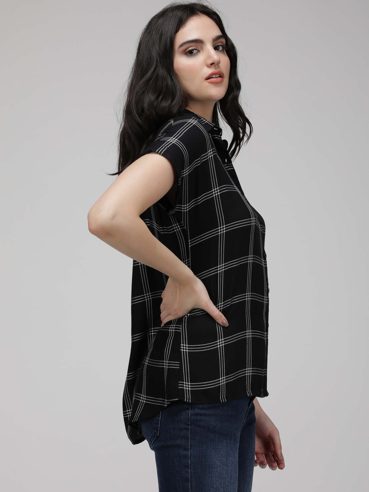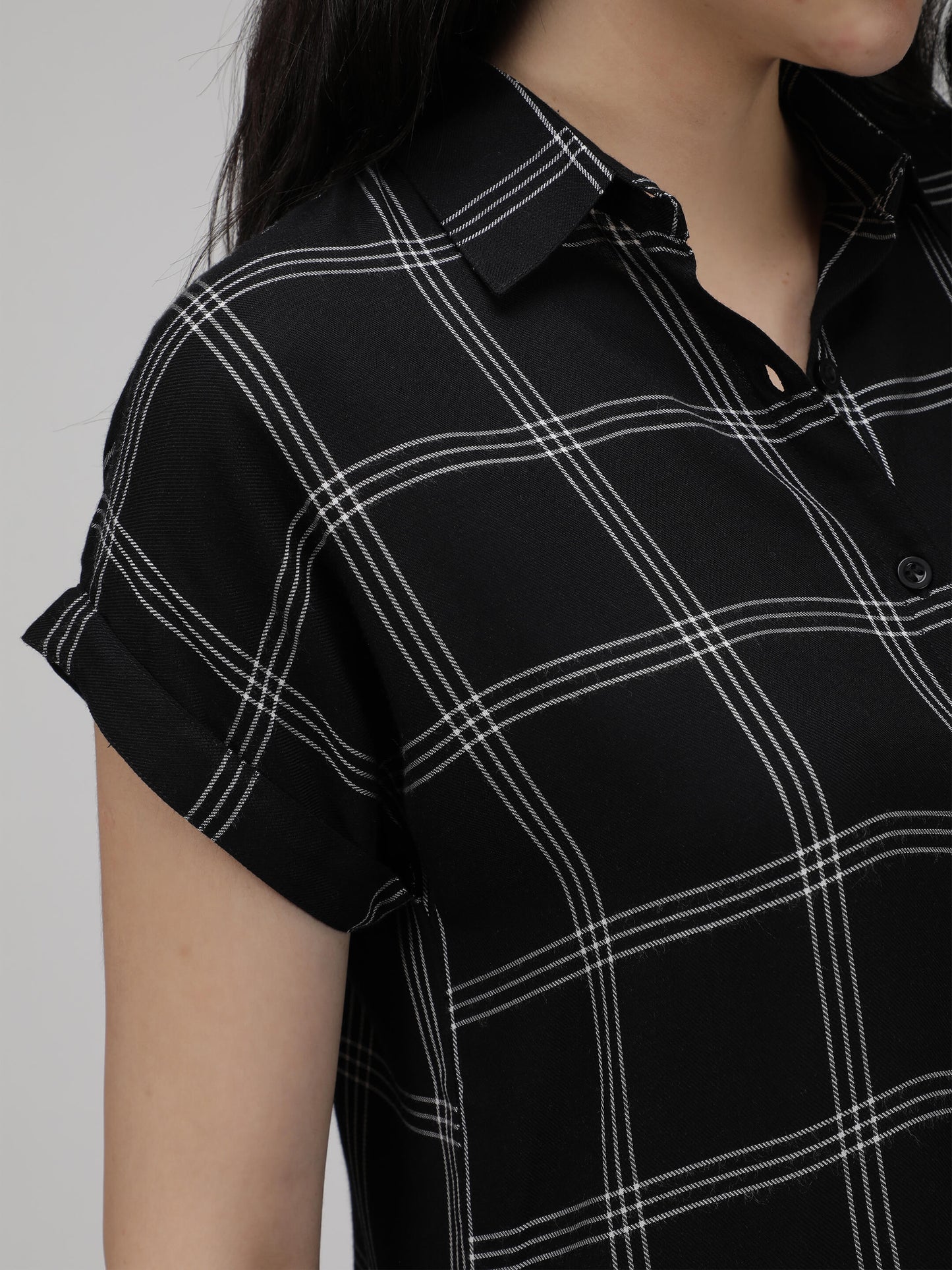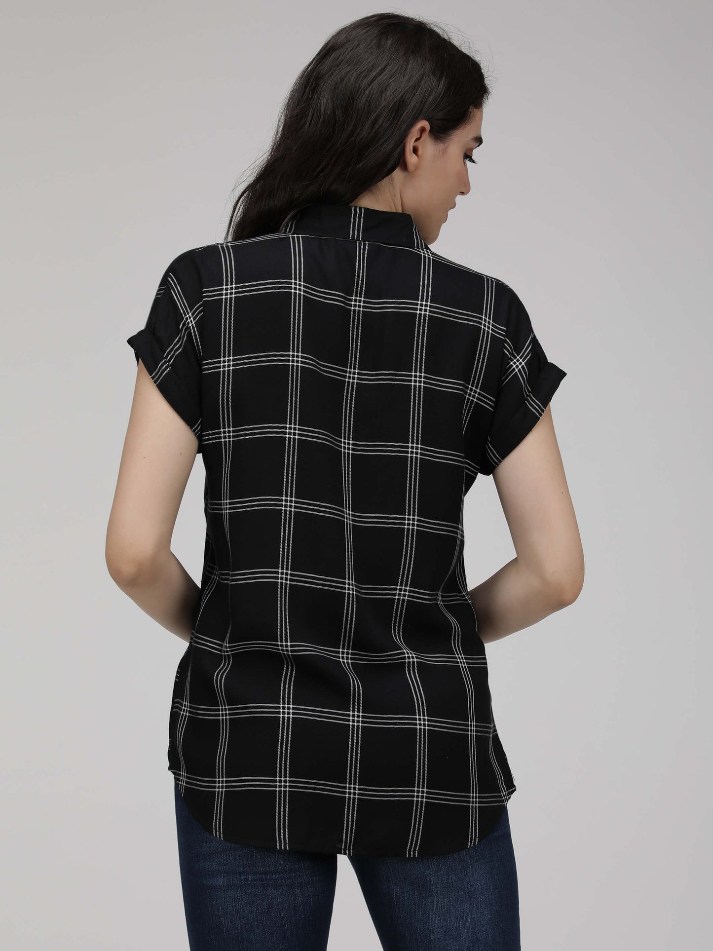 Regular price Rs. 690.00This regular fit black checkered top is crafted from lightweight rayon twill fabric and features extended shoulder sleeves for a stylish and modern fit. The fabric is lightweight and breathable, perfect for day to day wear.