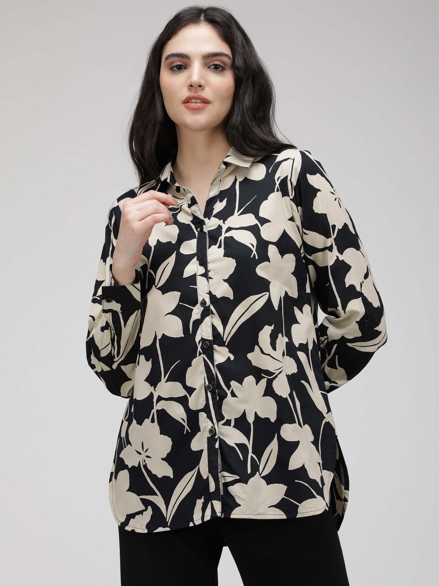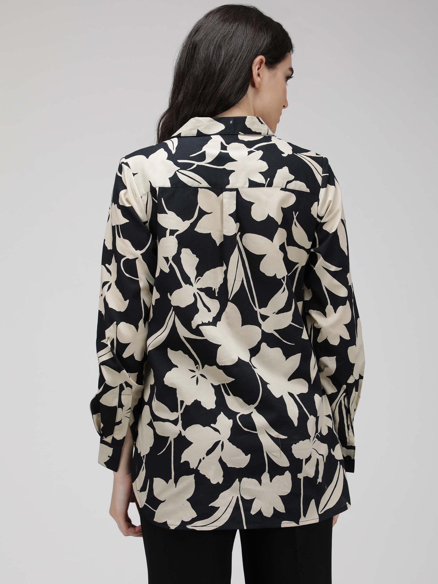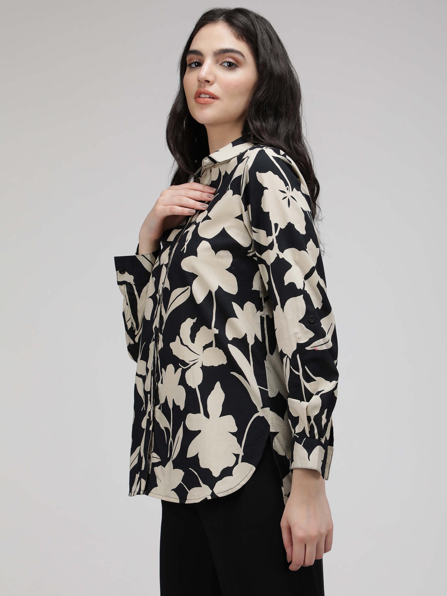 Regular price Rs. 720.00Crafted from classic cotton poplin, featuring a beautiful floral print in beige and black color. It has a regular fit for comfort, full sleeves and an uneven hem for a unique look. Perfect for any occasion.