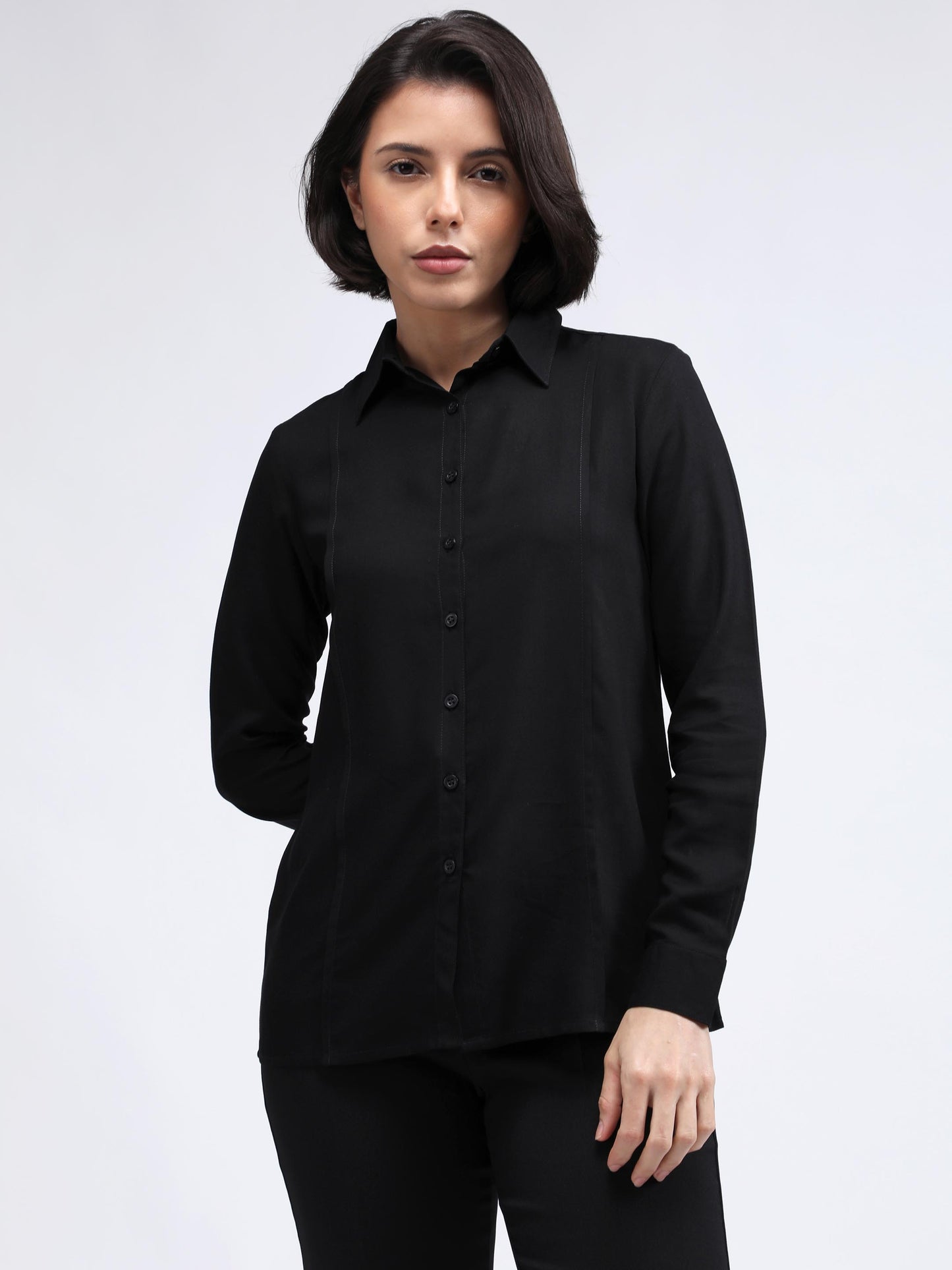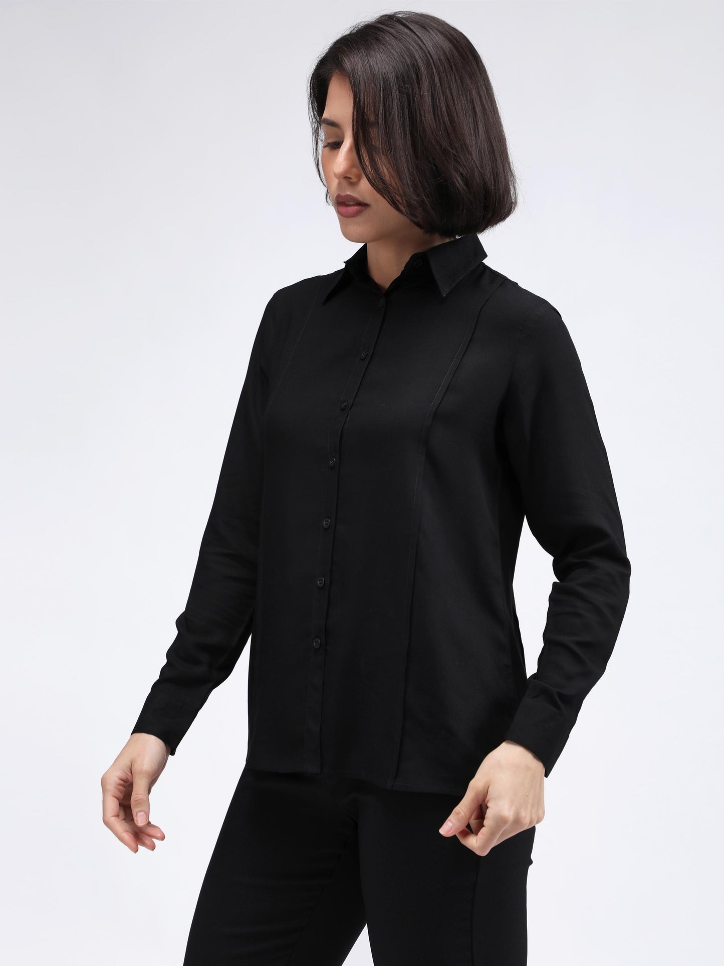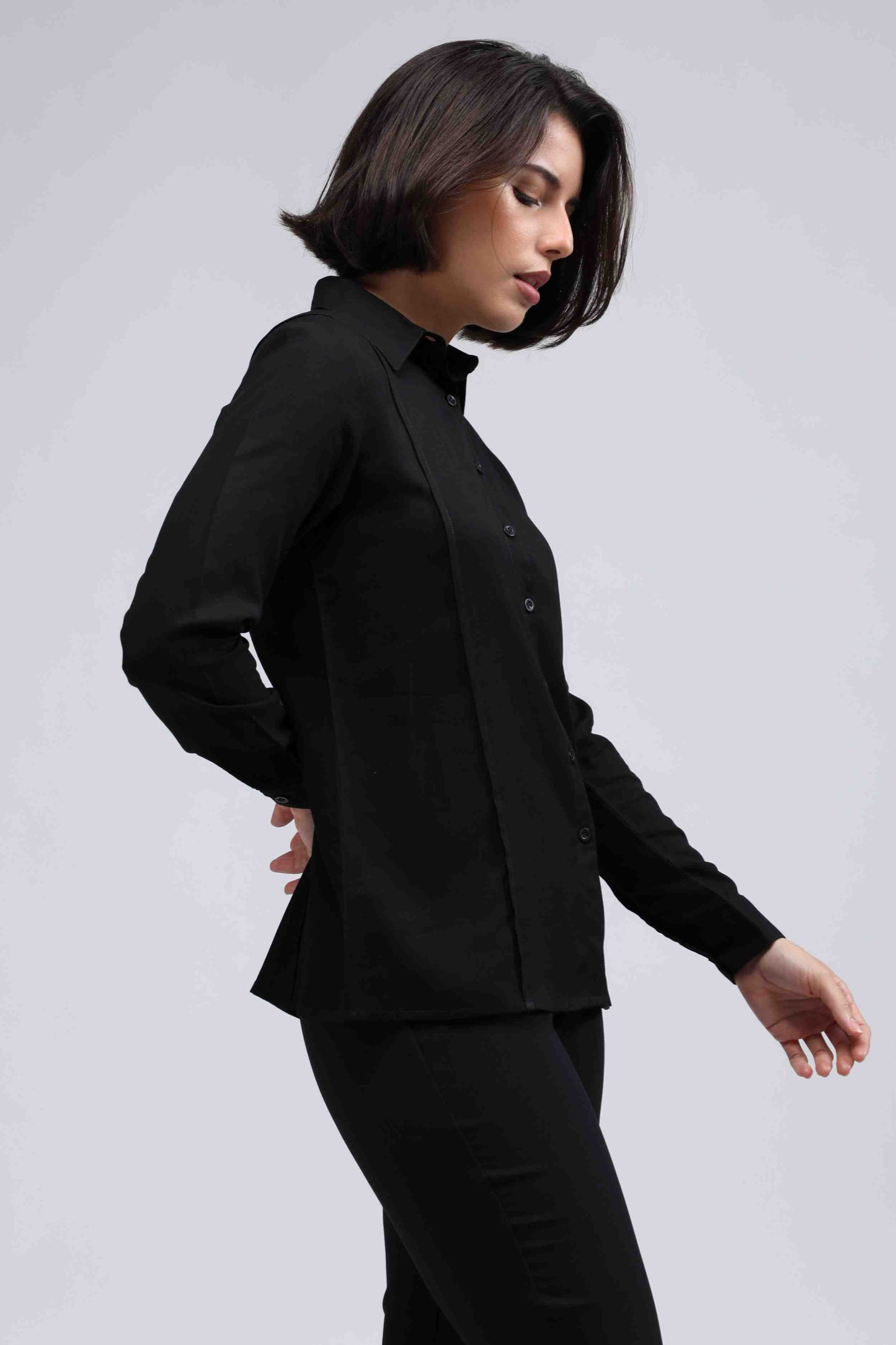 Black office wear shirt with symmetric single knife pleat on princess seam. Full sleeve