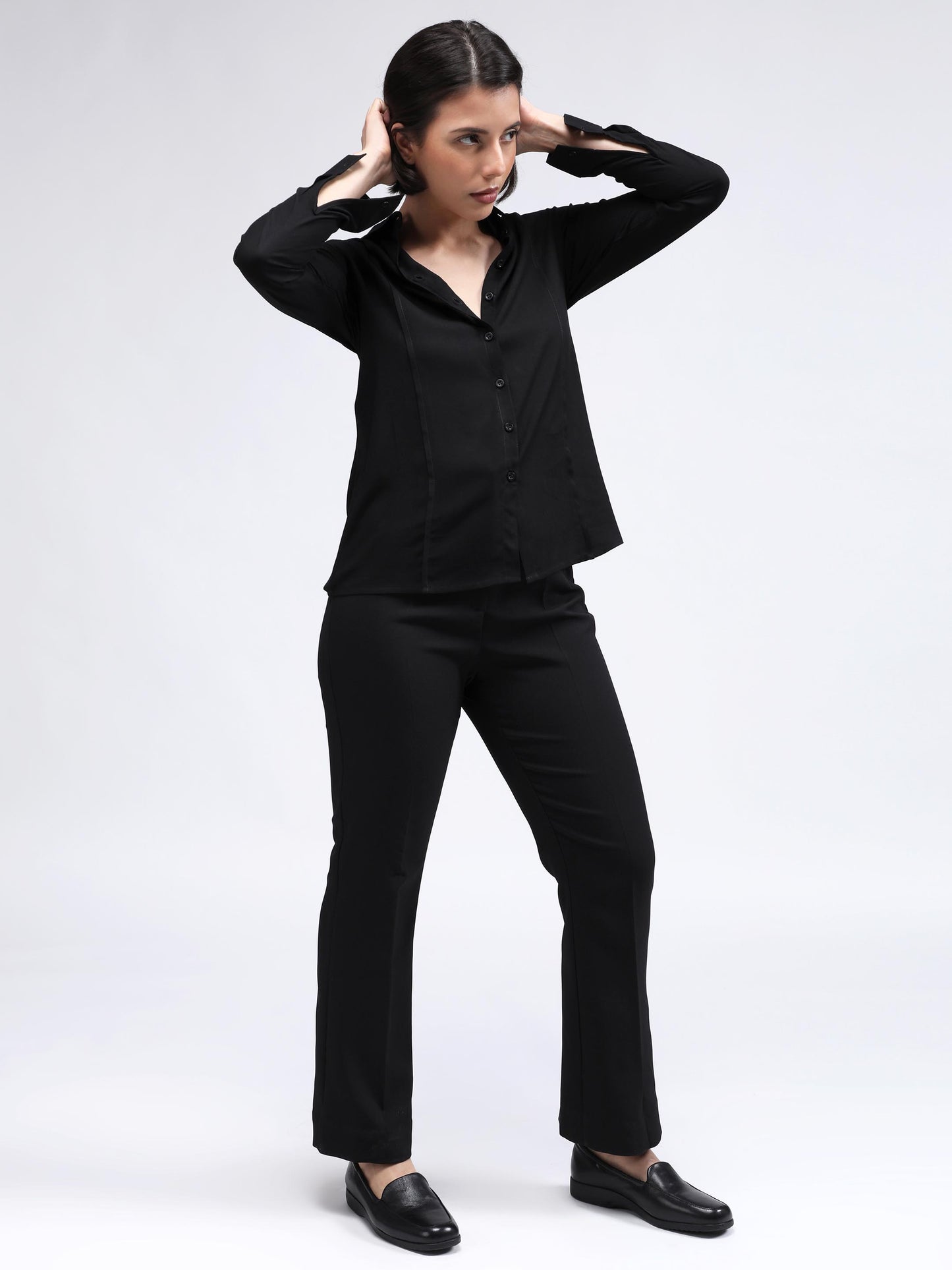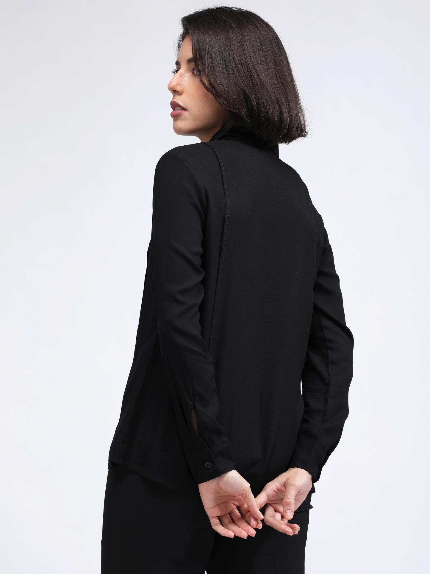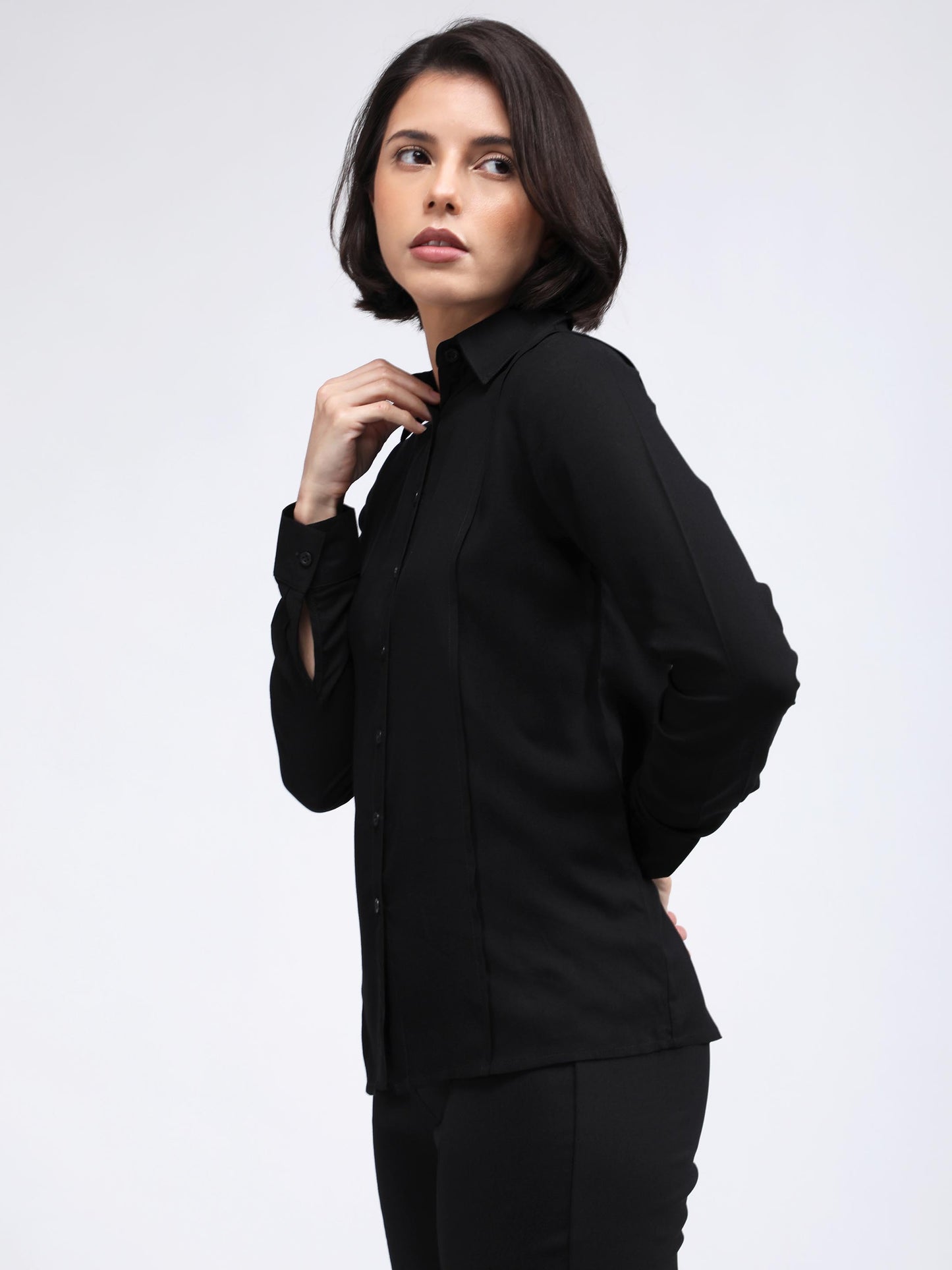 Black office wear shirt with symmetric single knife pleat on princess seam. Full sleeve