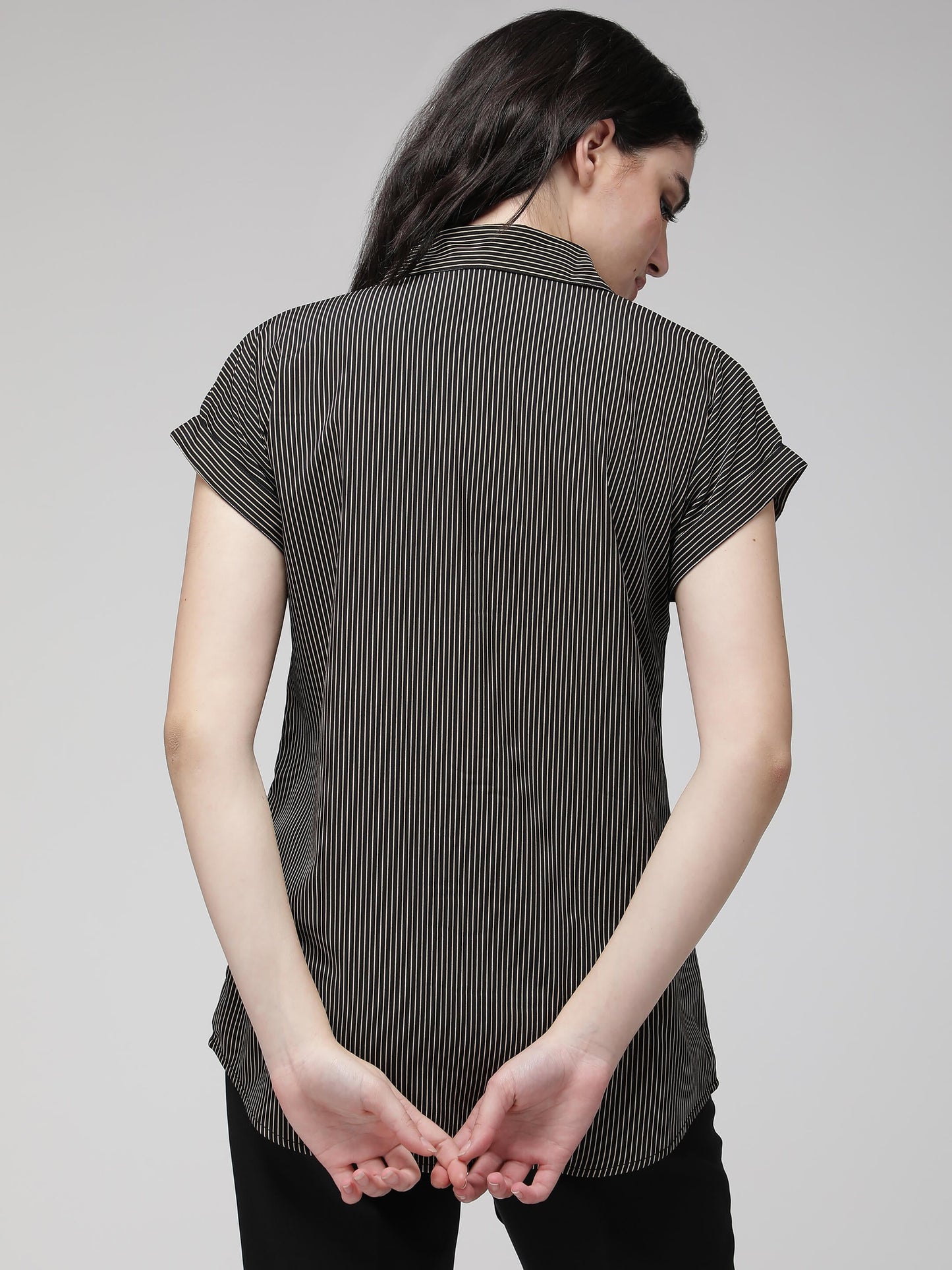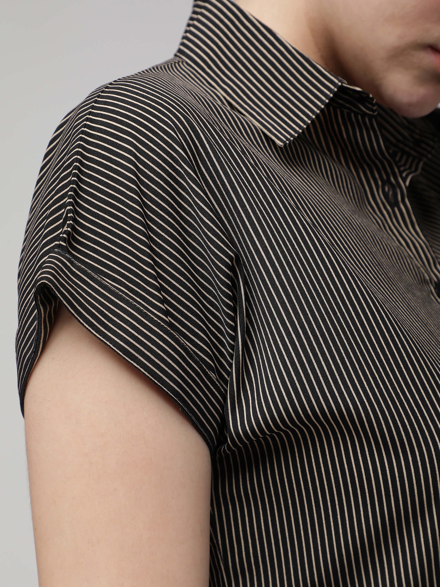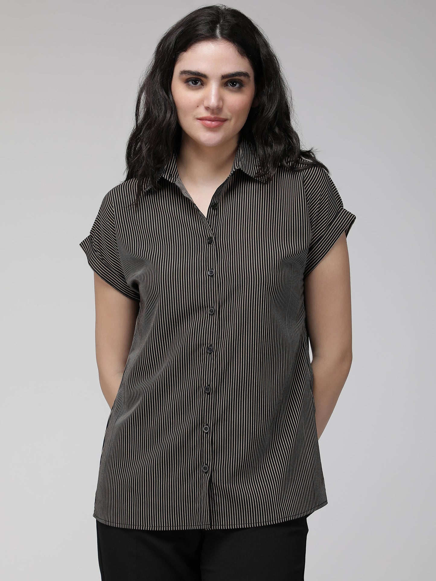 Black striped short sleeve shirt in polyester fabric, full button down and extended shoulders