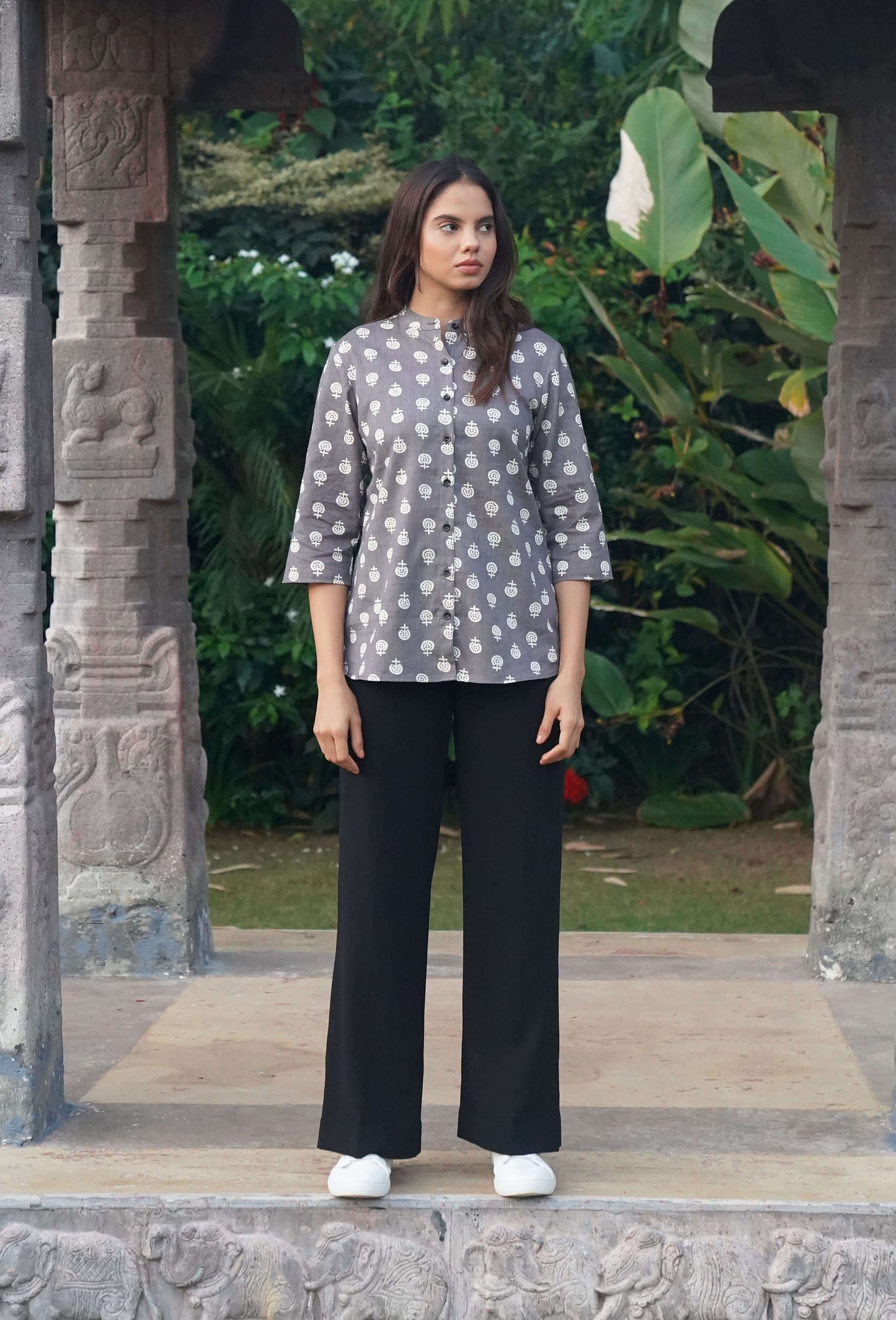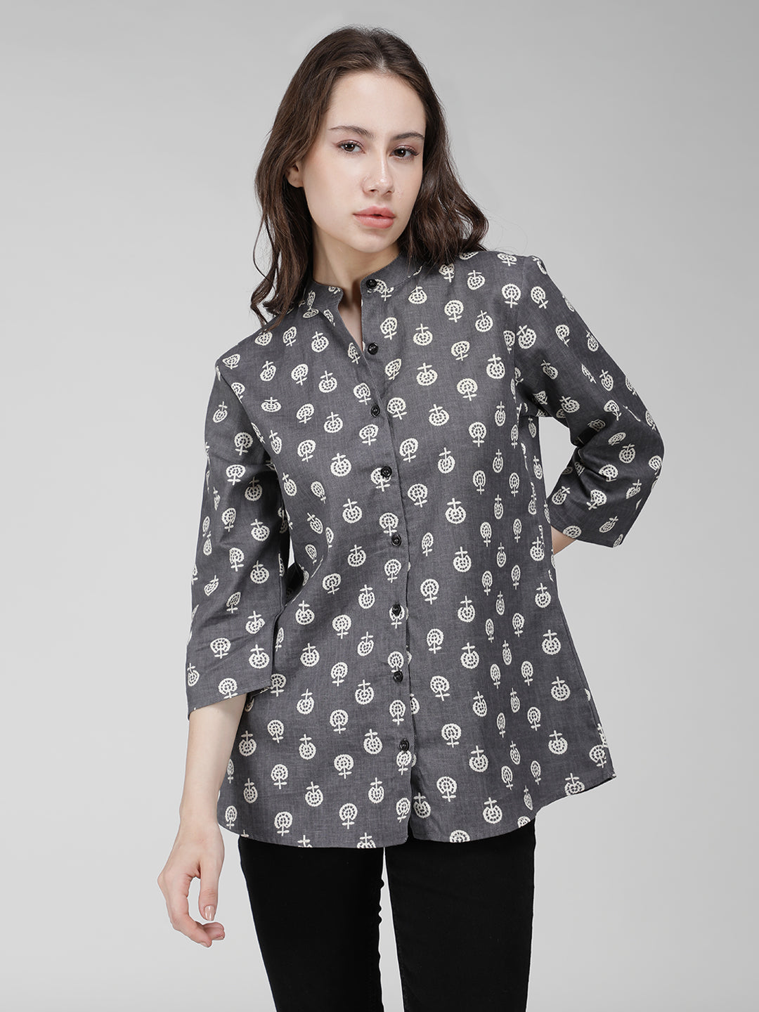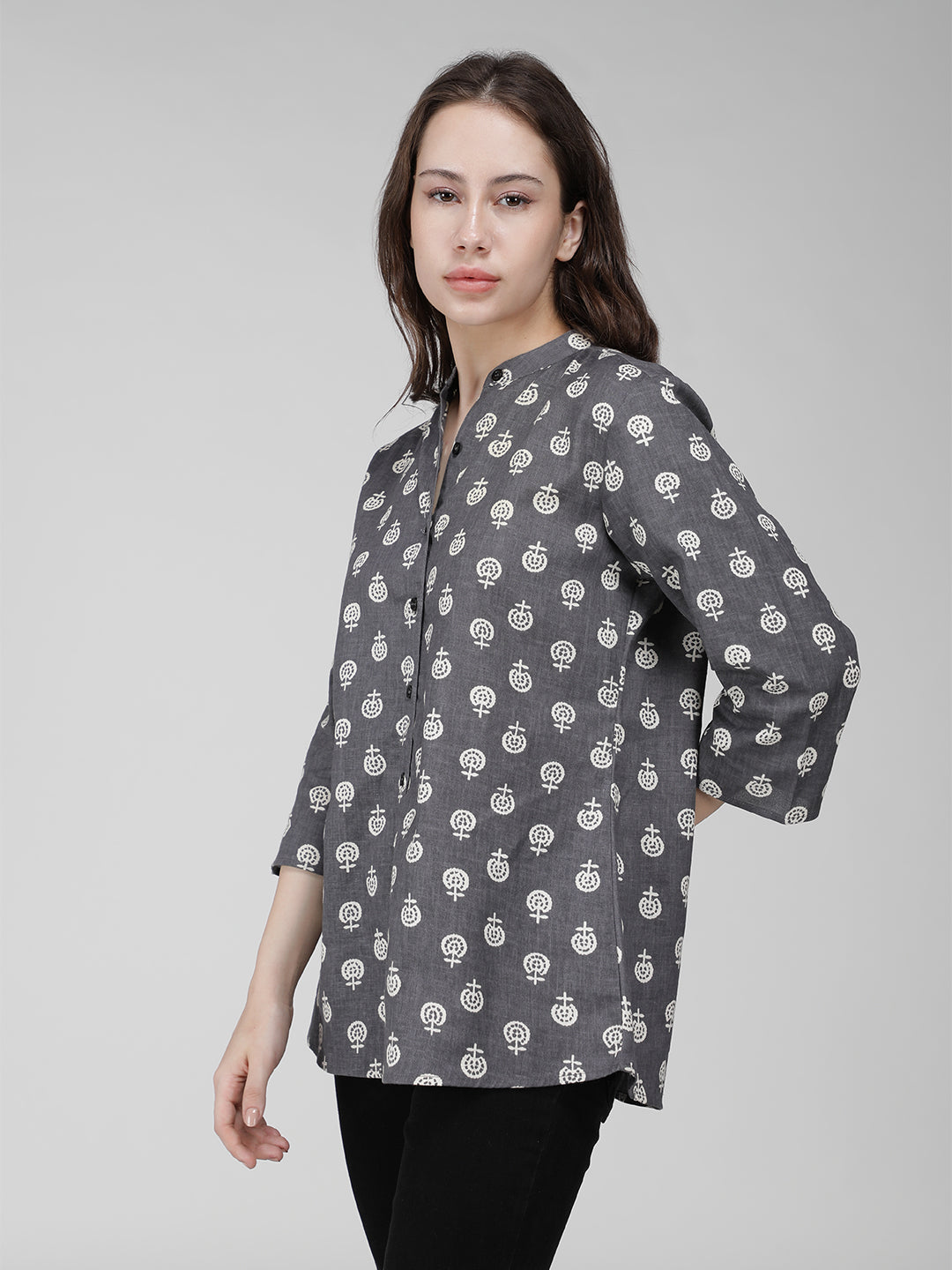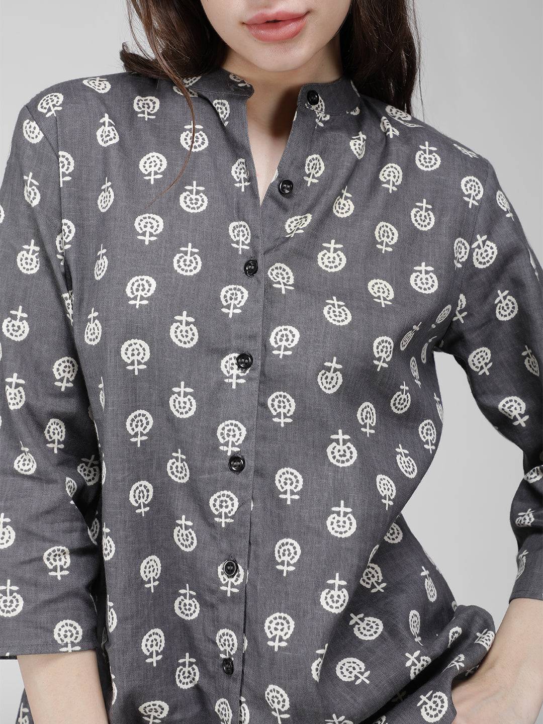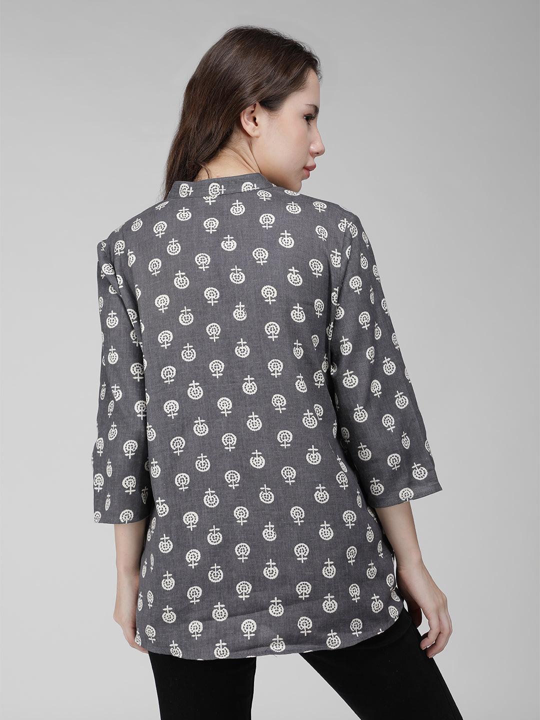 This Grey and White Block Printed Shirt features a three quarter sleeve, mandarin collar, and rayon fabric for a comfortable, elegant look. The classic colors will never go out of style.