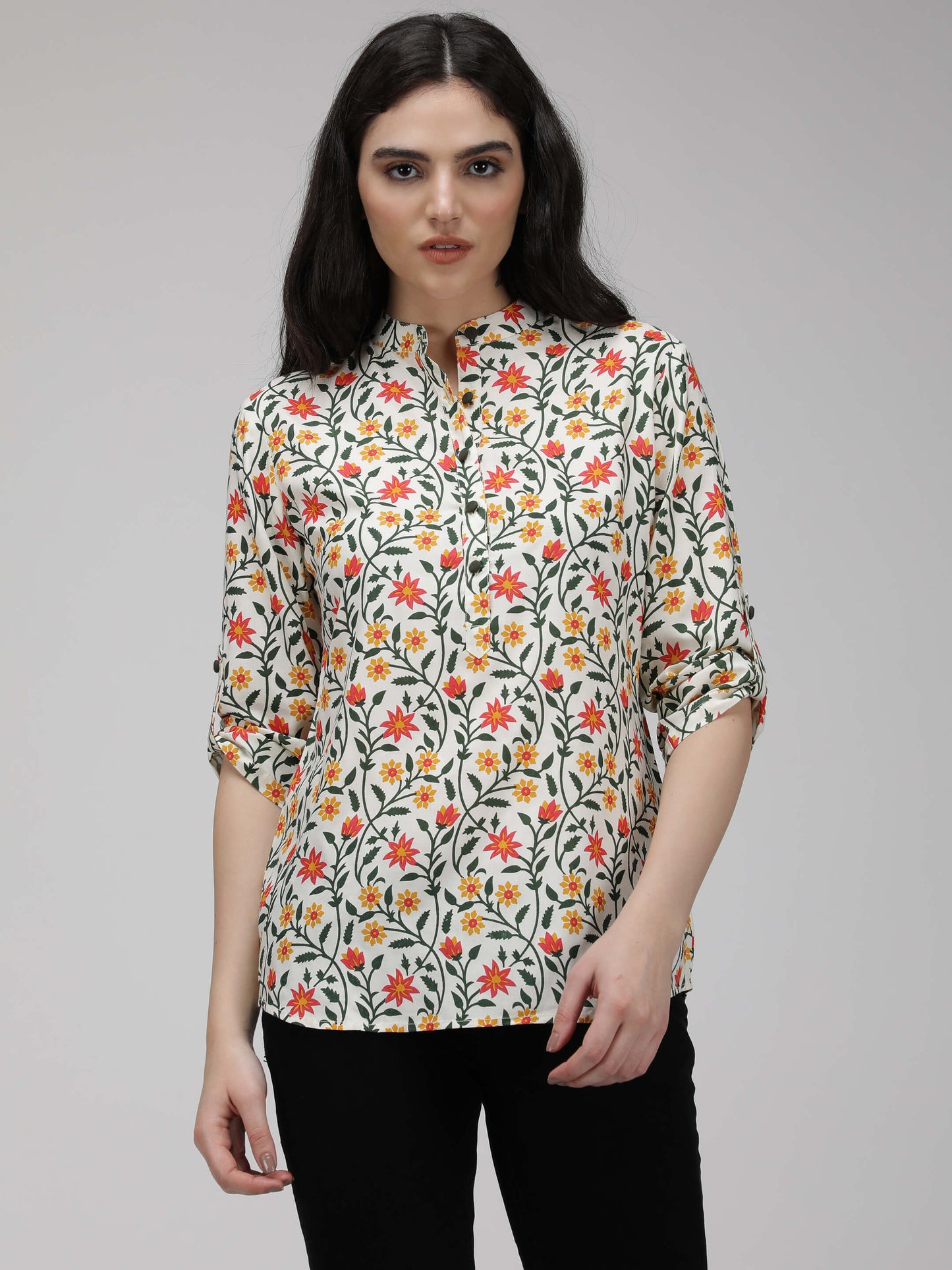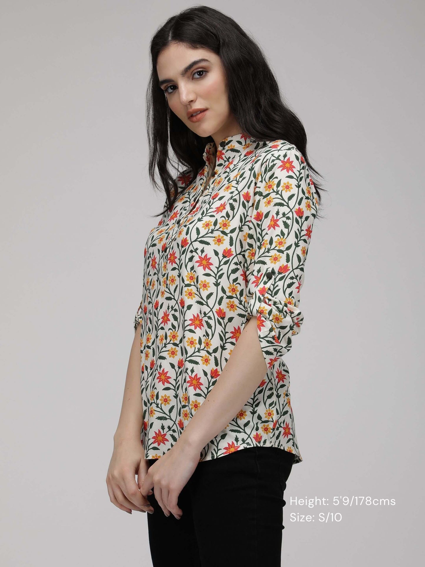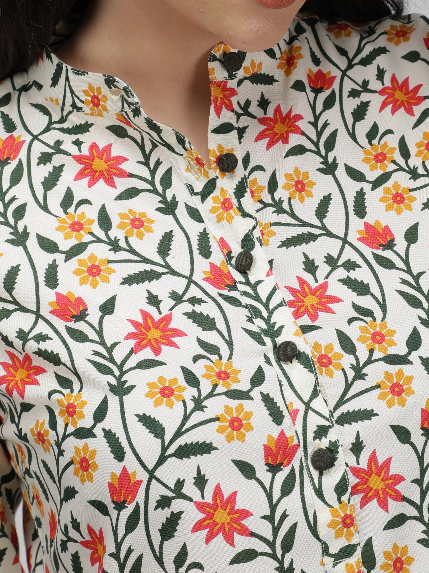 Regular price Rs. 390.00Crafted from a lightweight cotton fabric with an intricate floral pattern, it features a band collar and 3/4th sleeves