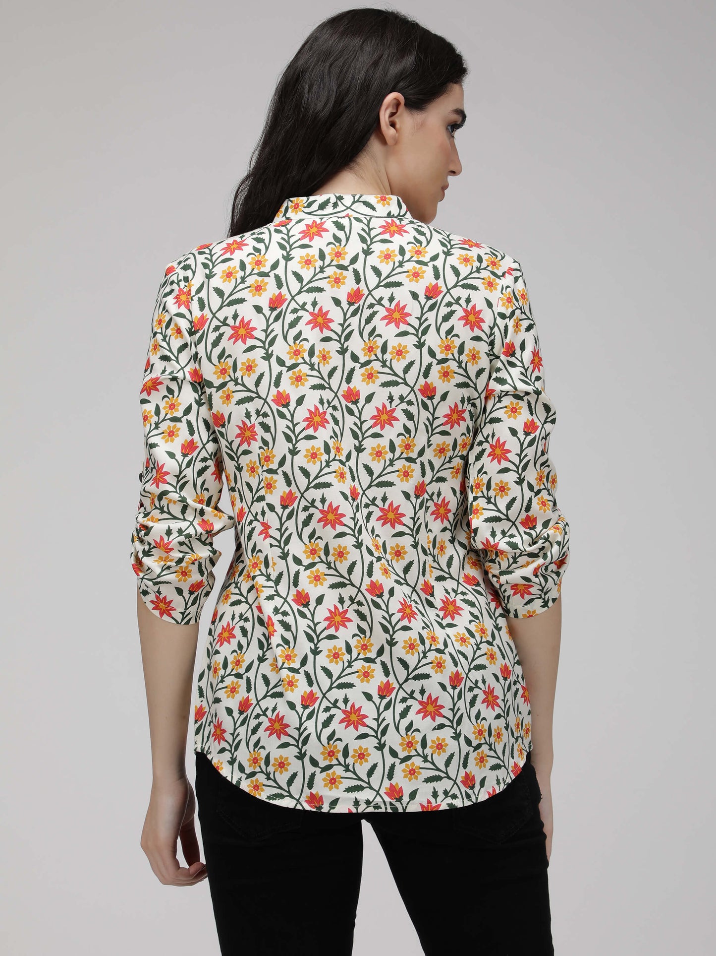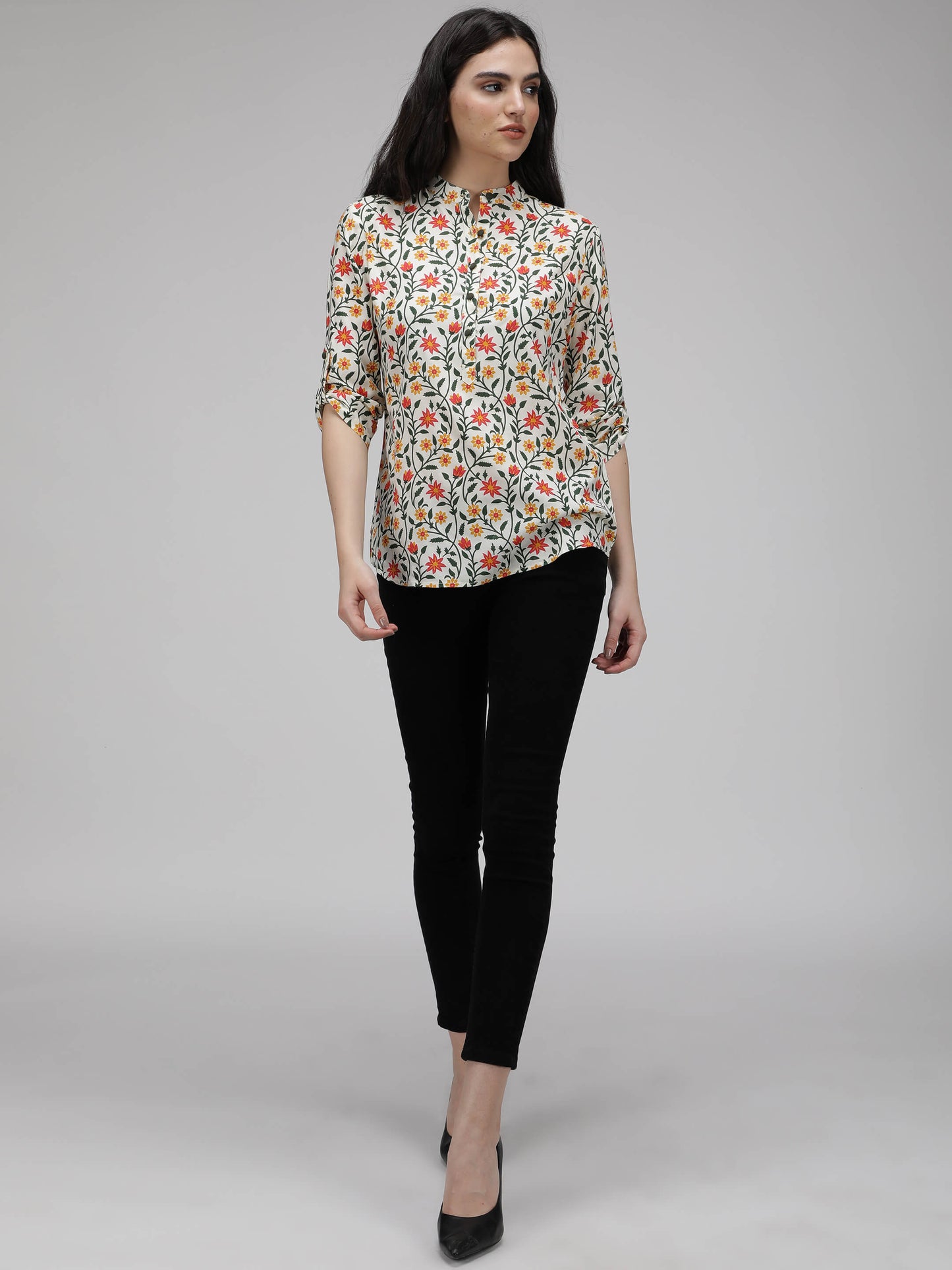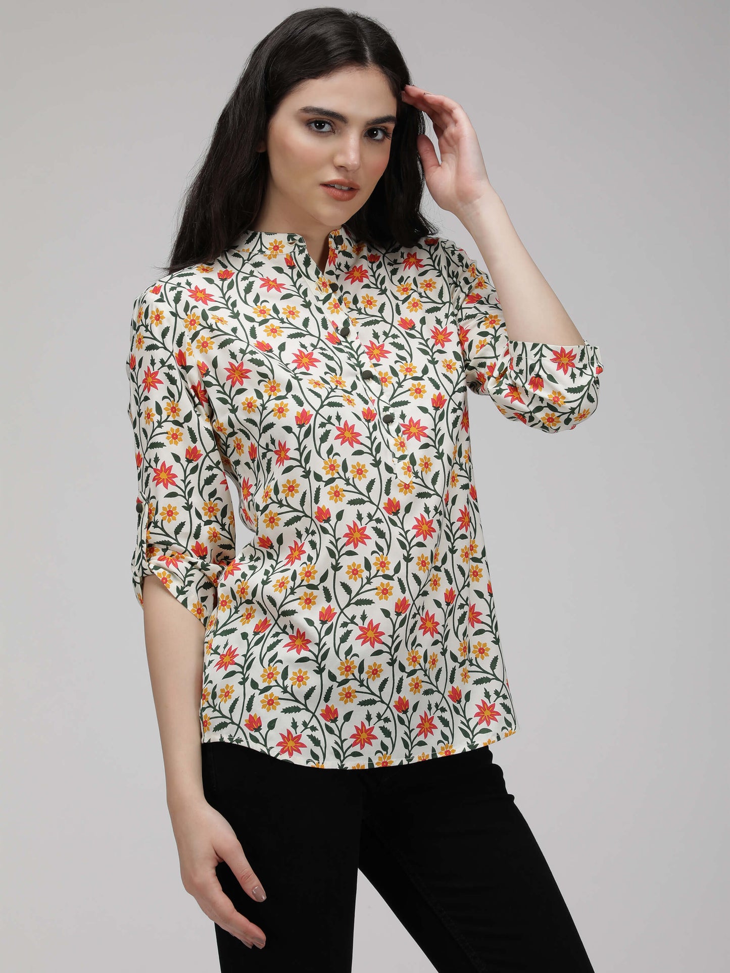Regular price Rs. 390.00Crafted from a lightweight cotton fabric with an intricate floral pattern, it features a band collar and 3/4th sleeves