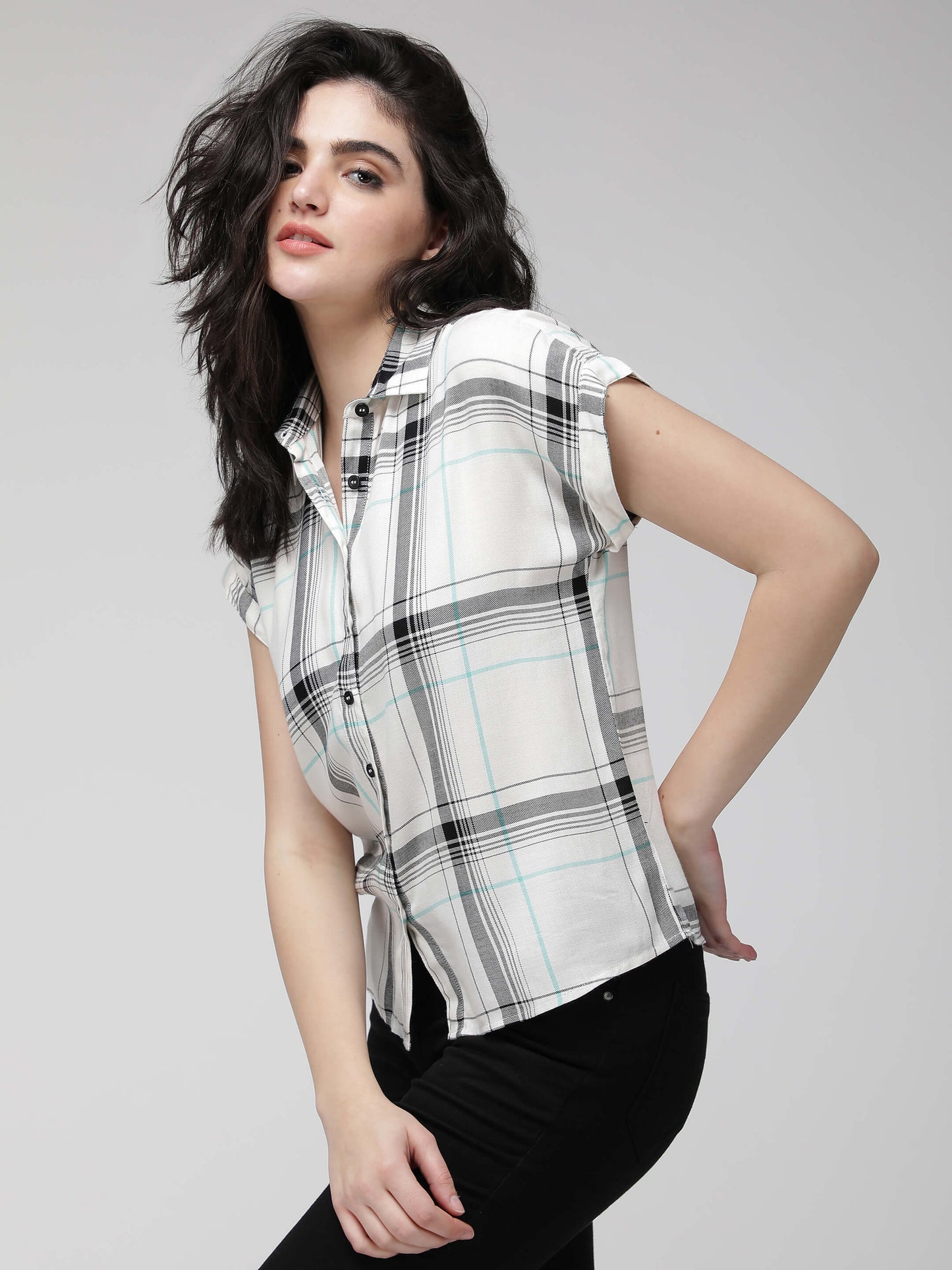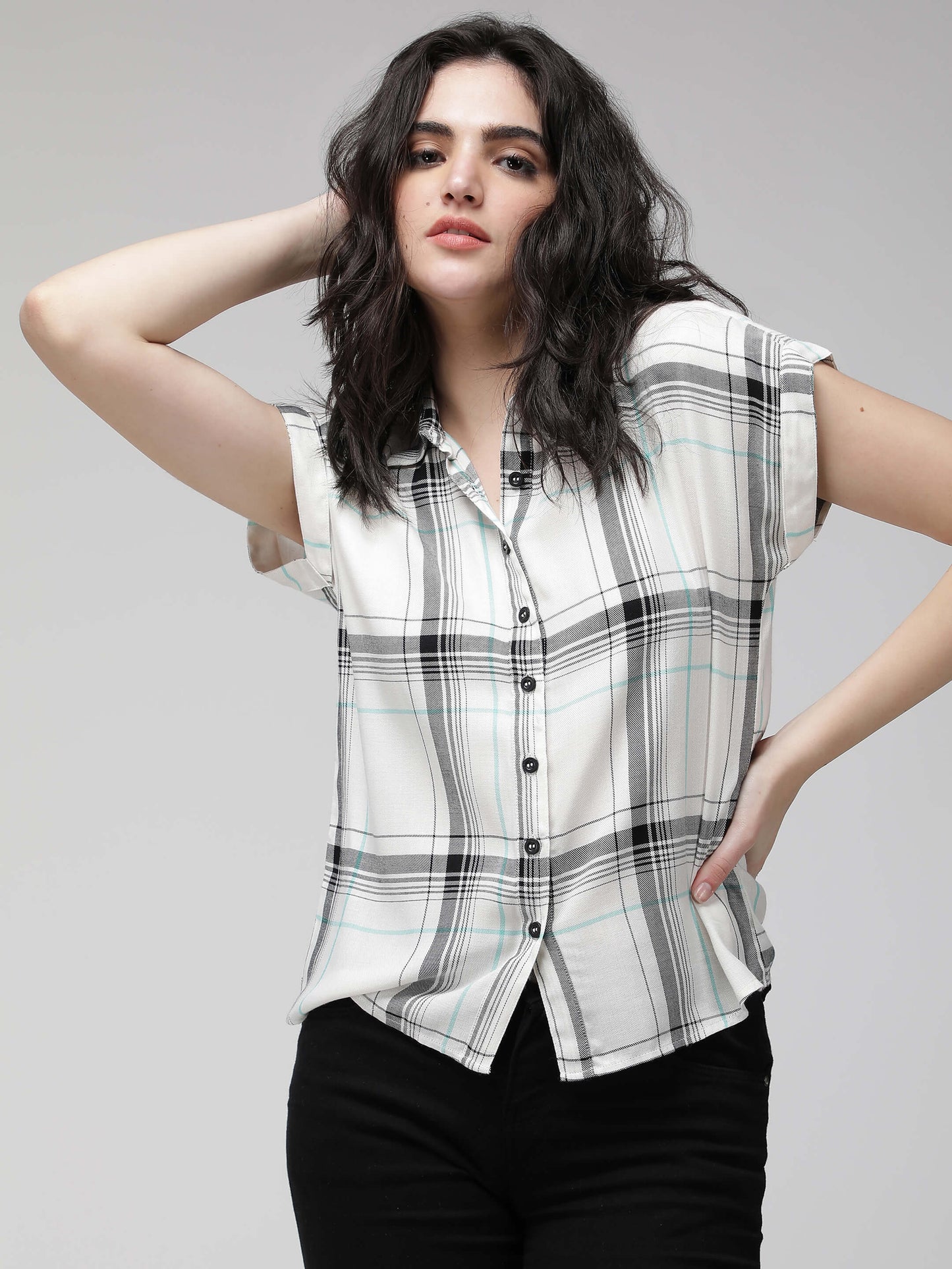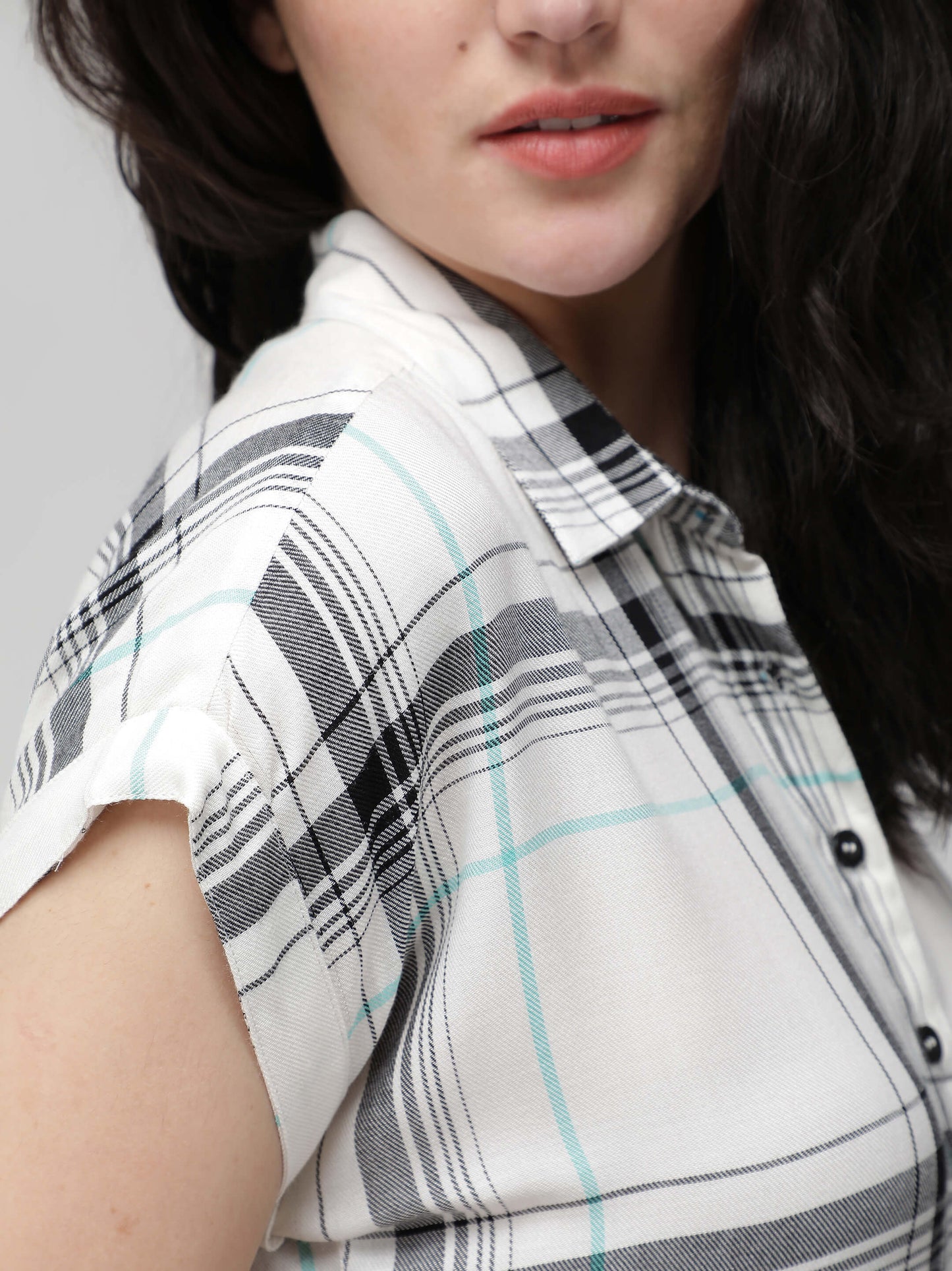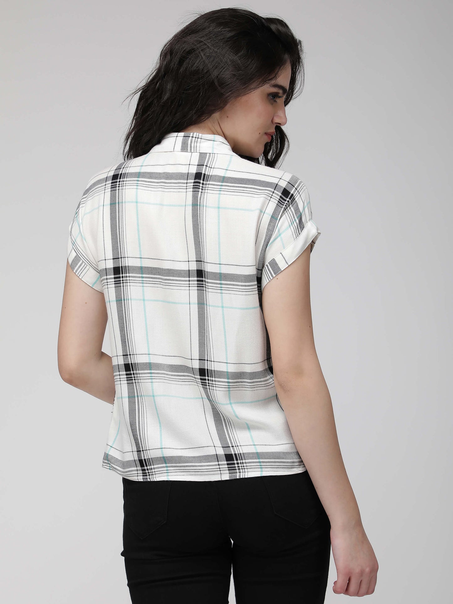 White Checkered short sleeves crop shirt. Made from premium rayon.