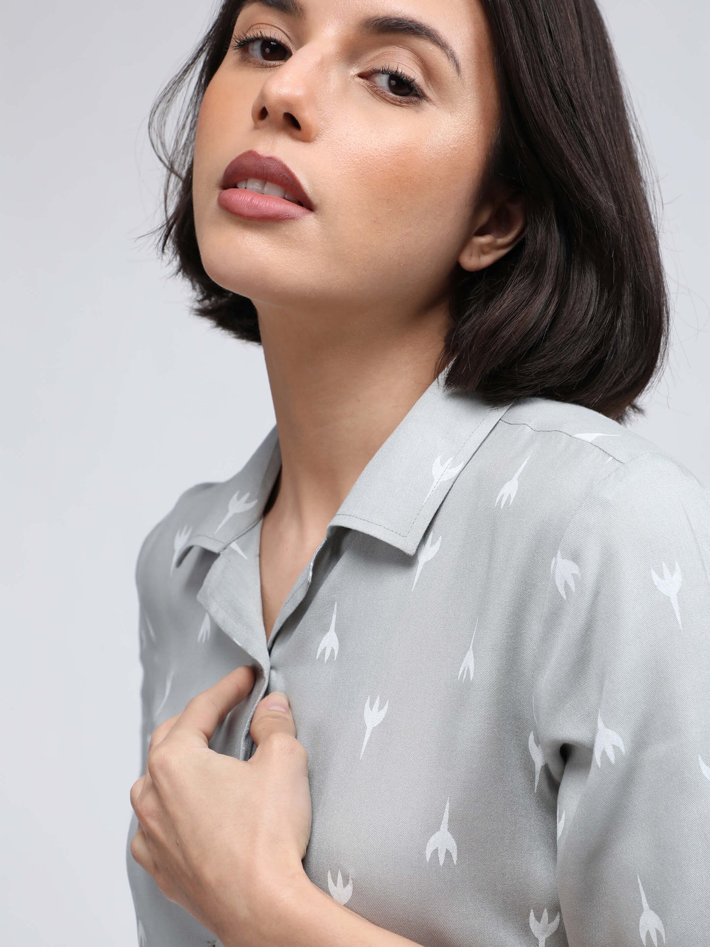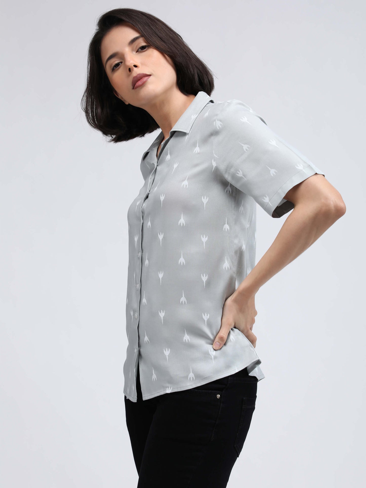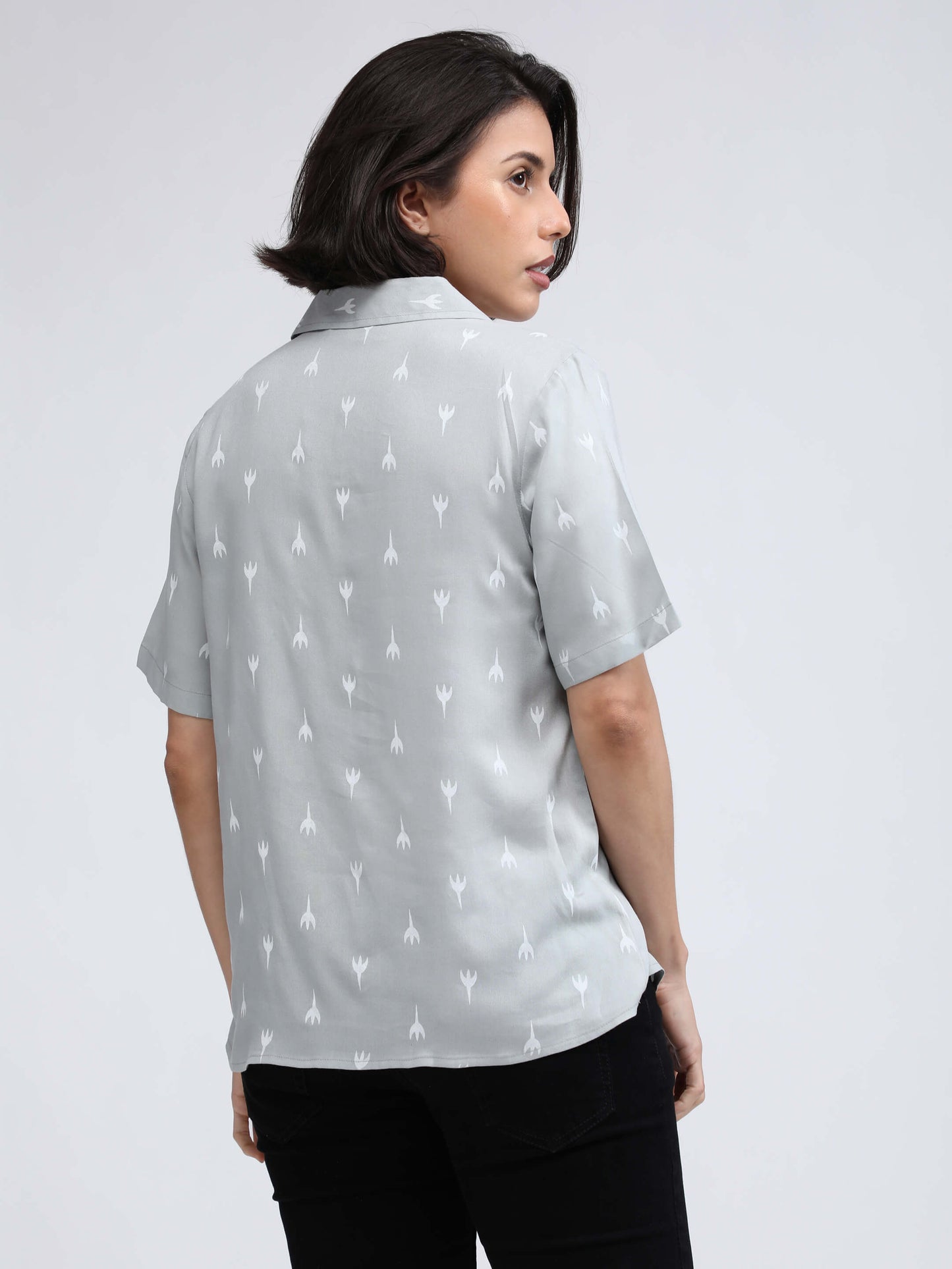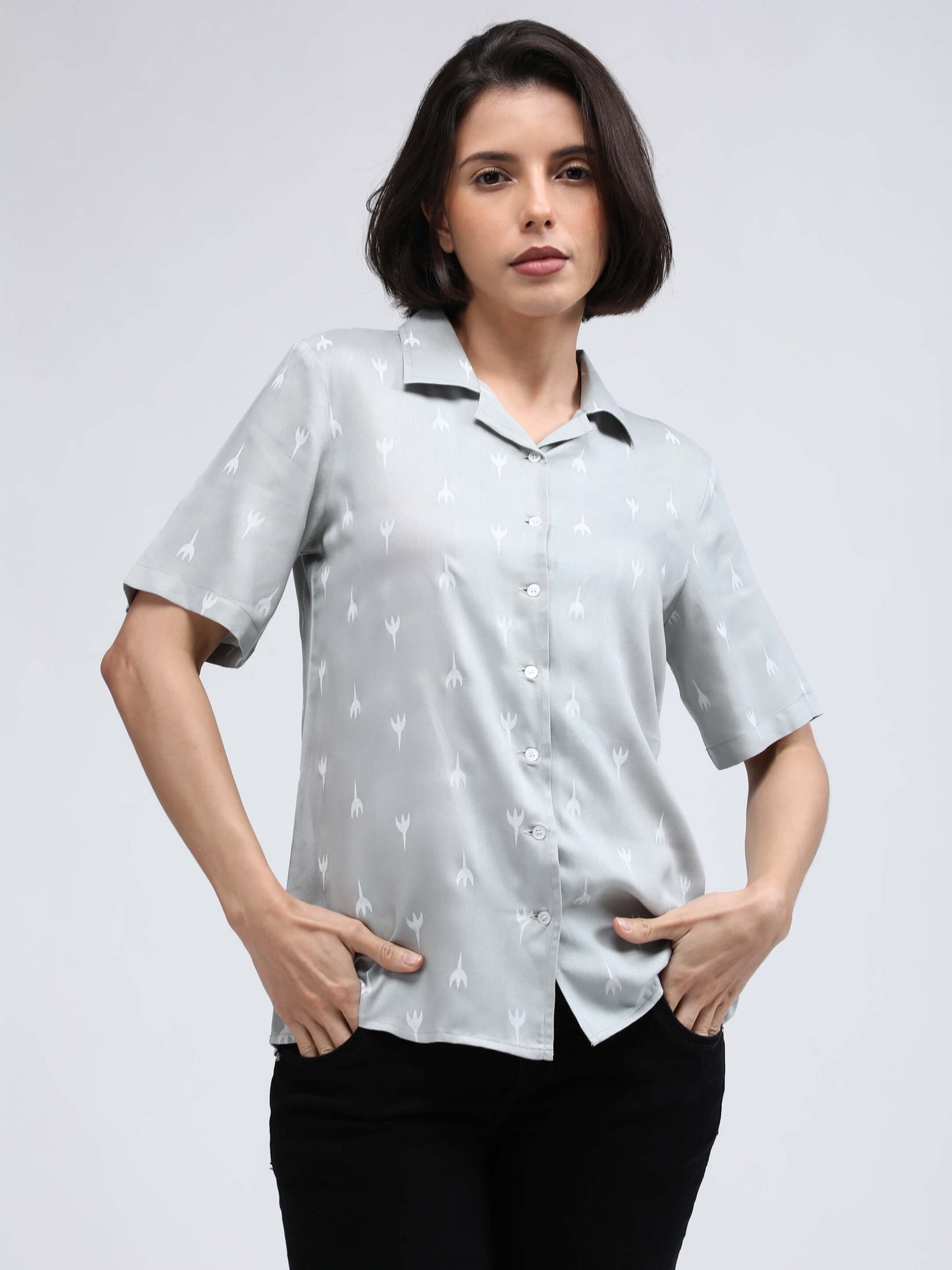 Grey cuban collared shirt in georgette. Half sleeve, button down shirt