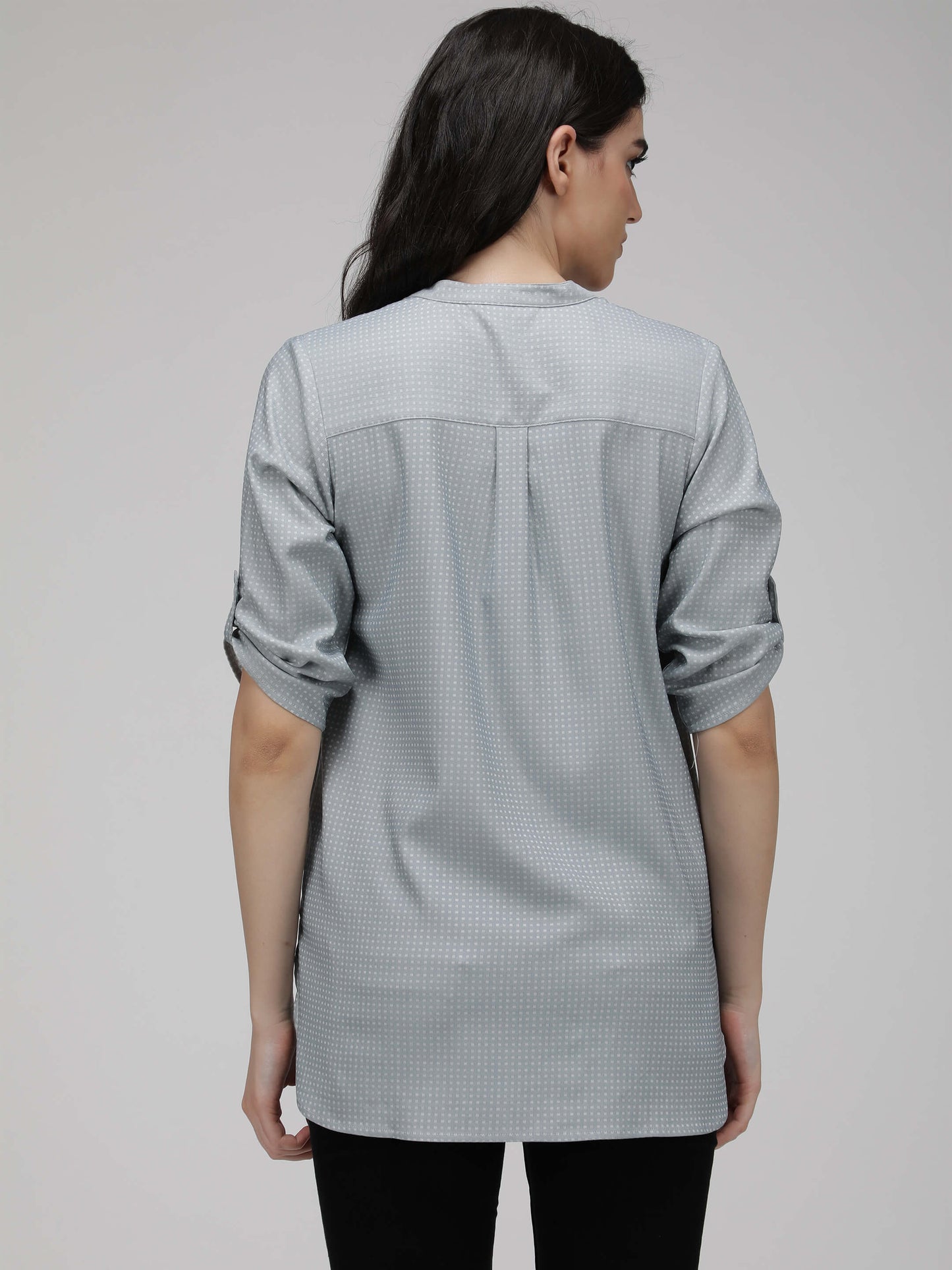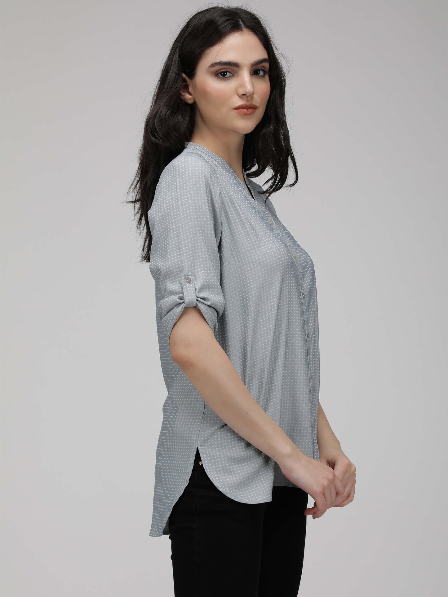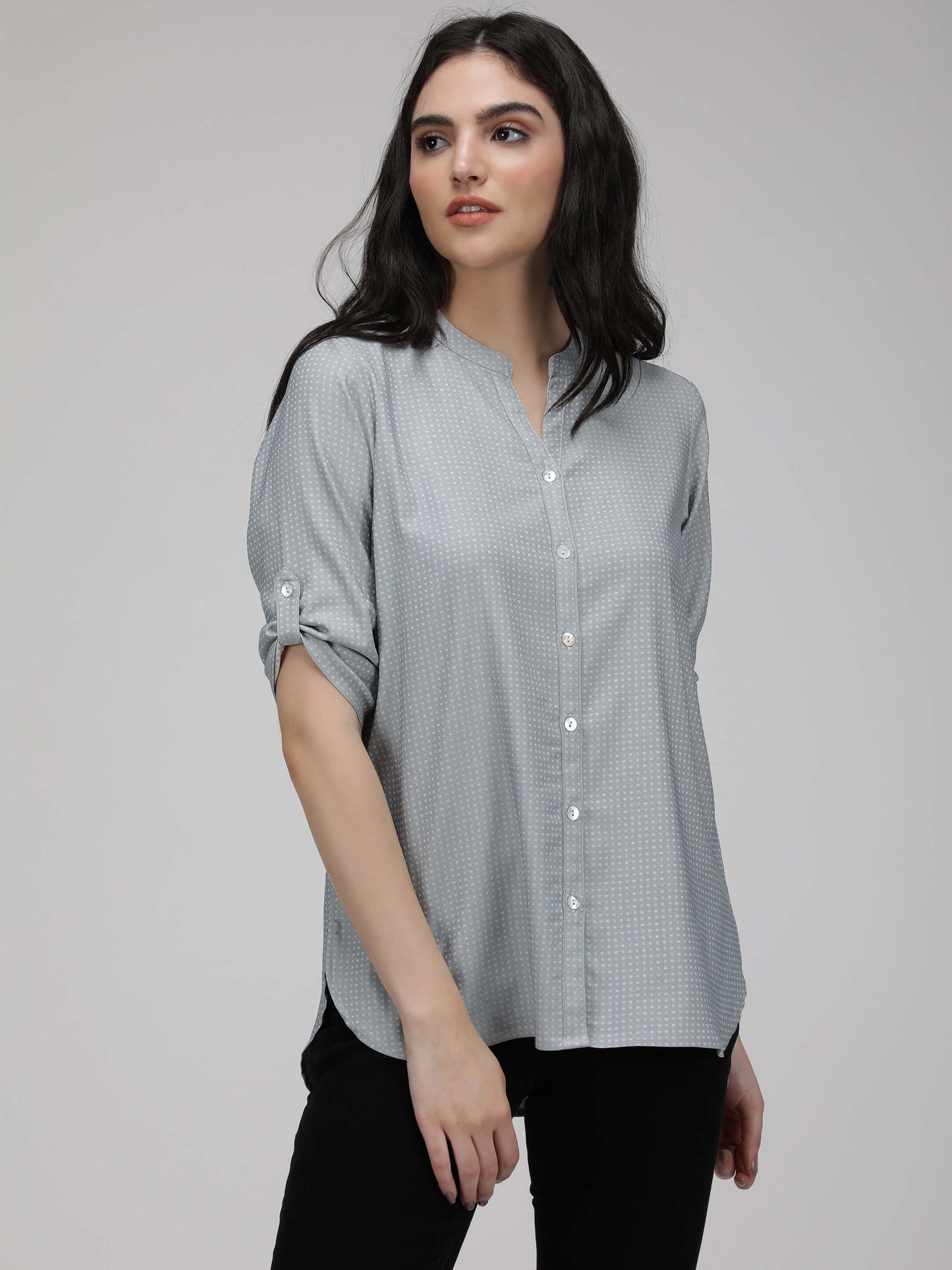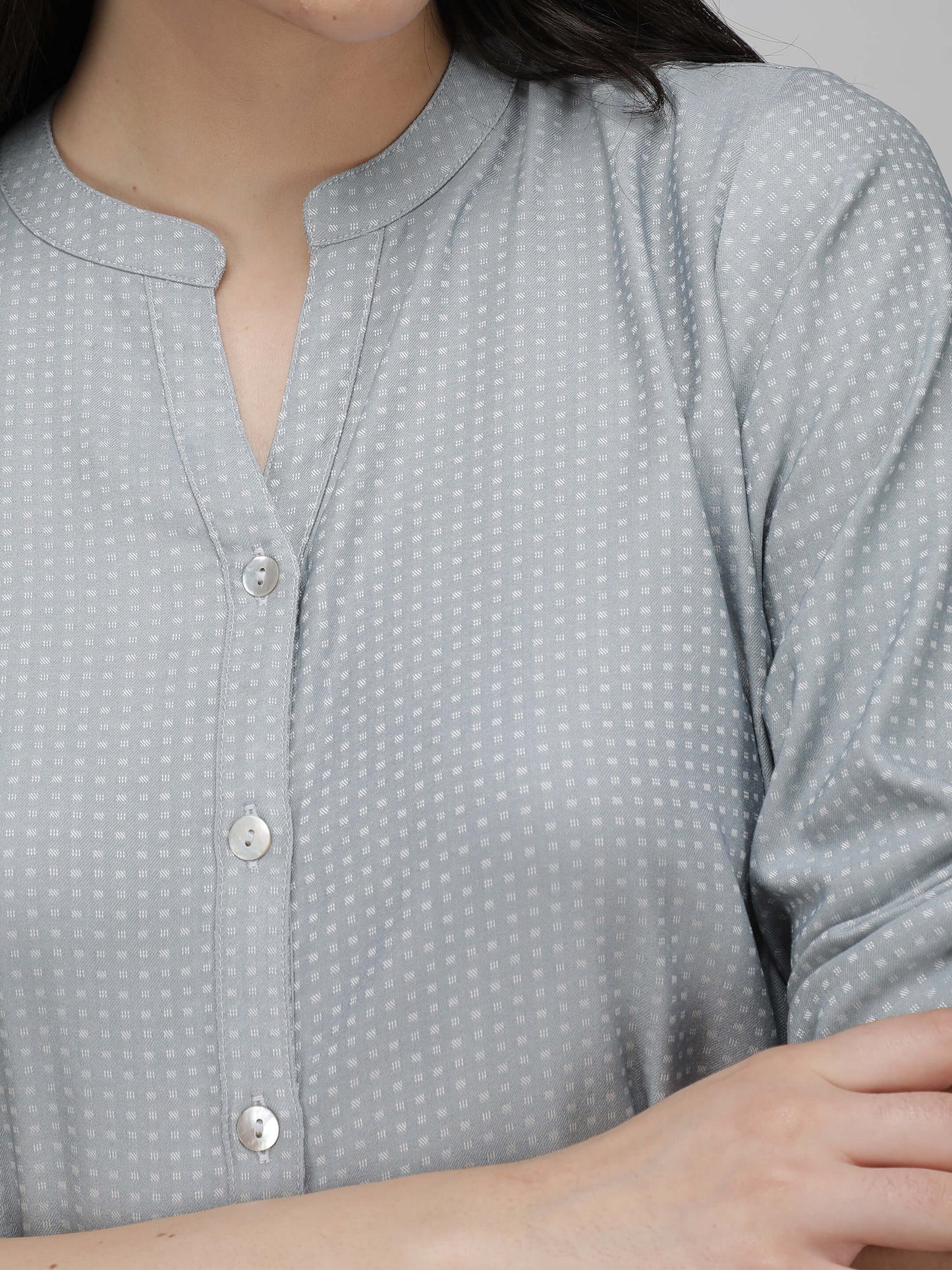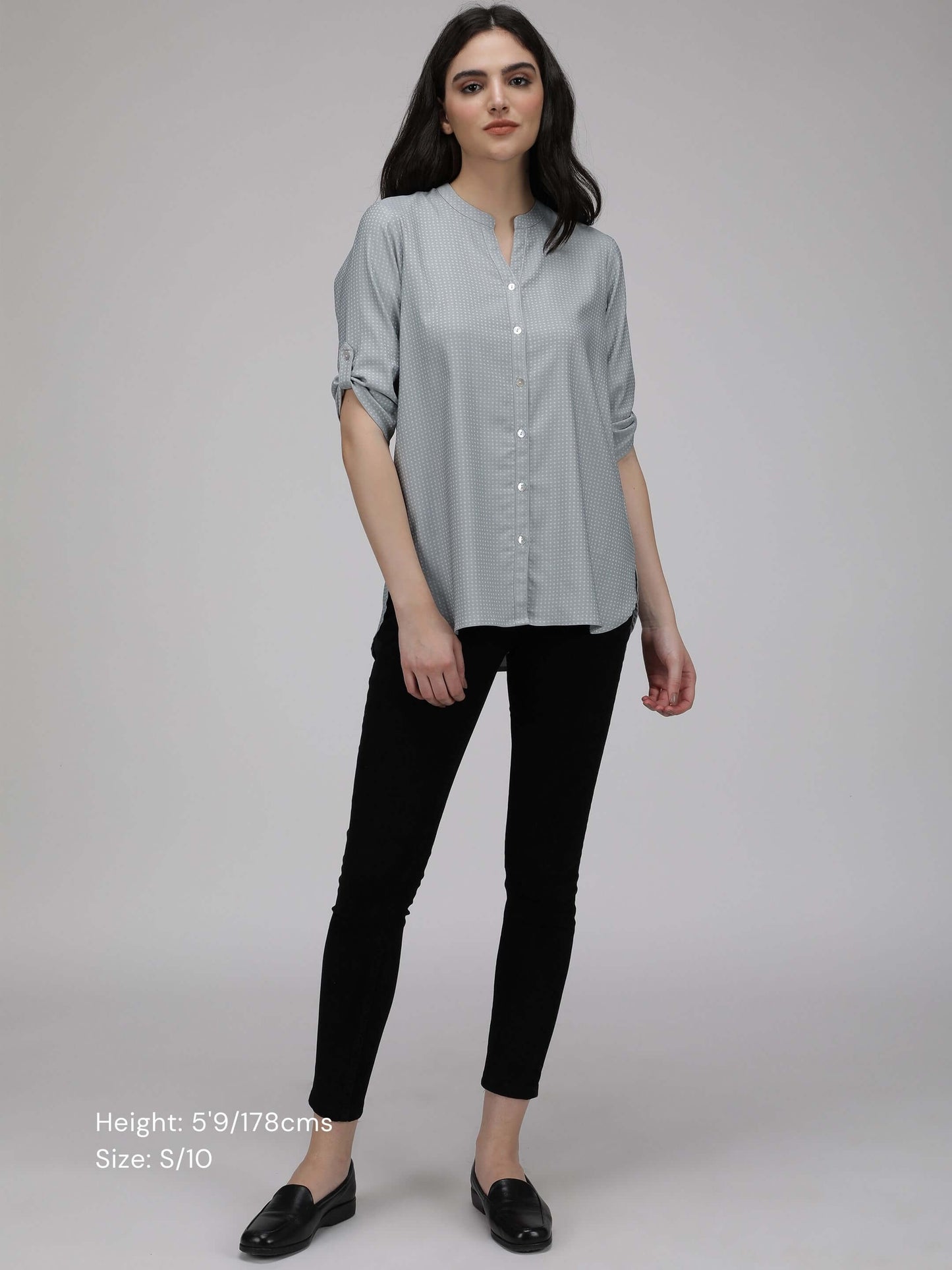 Regular price Rs. 660.00Crafted from a rayon spandex, Jacquard weave with two-way stretch, and featuring a band collar, regular fit, and flowy three-quarter sleeves.