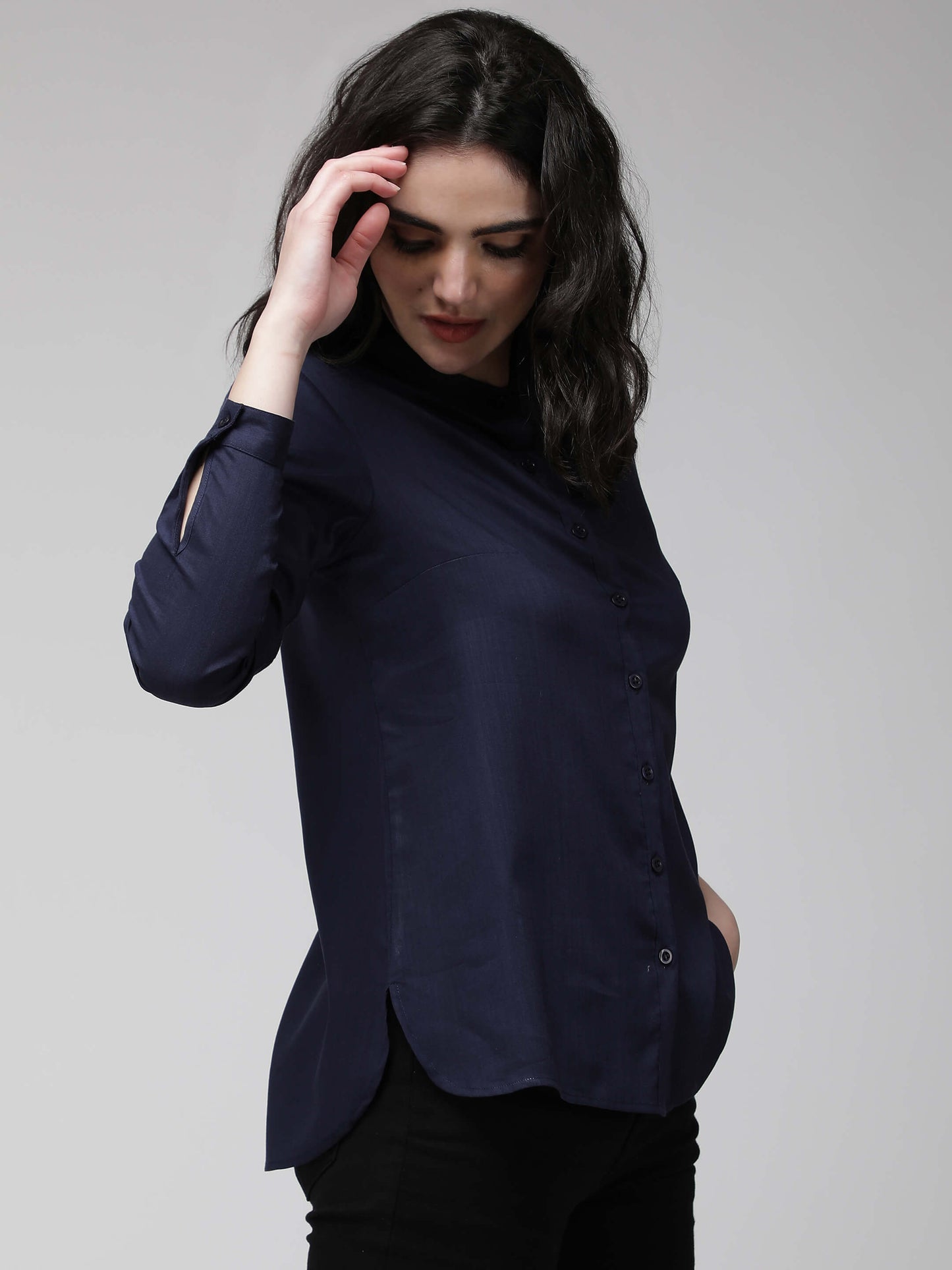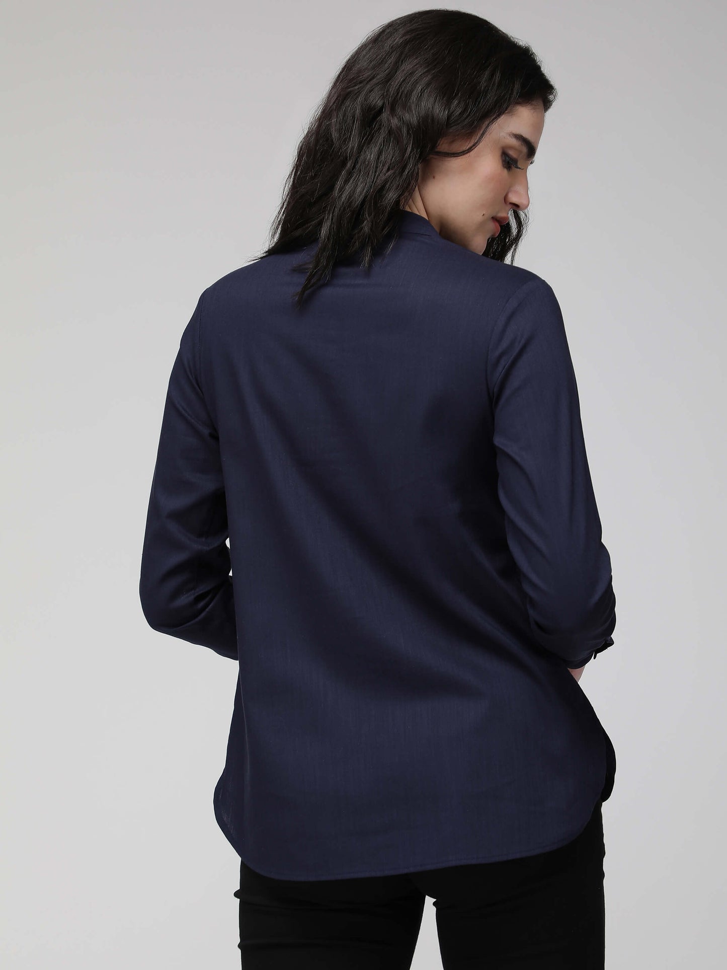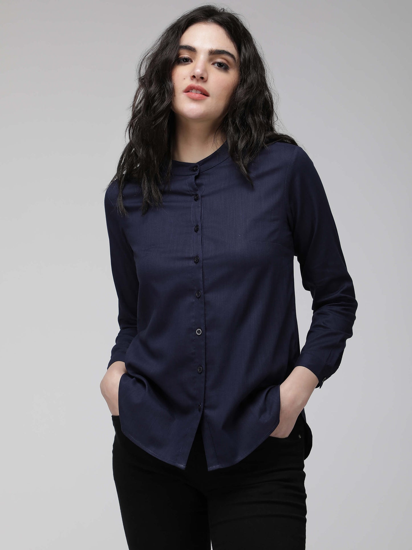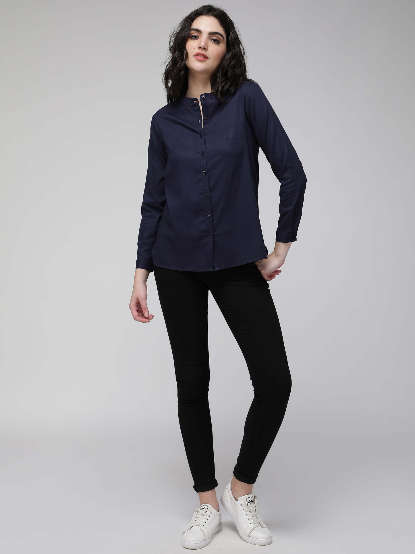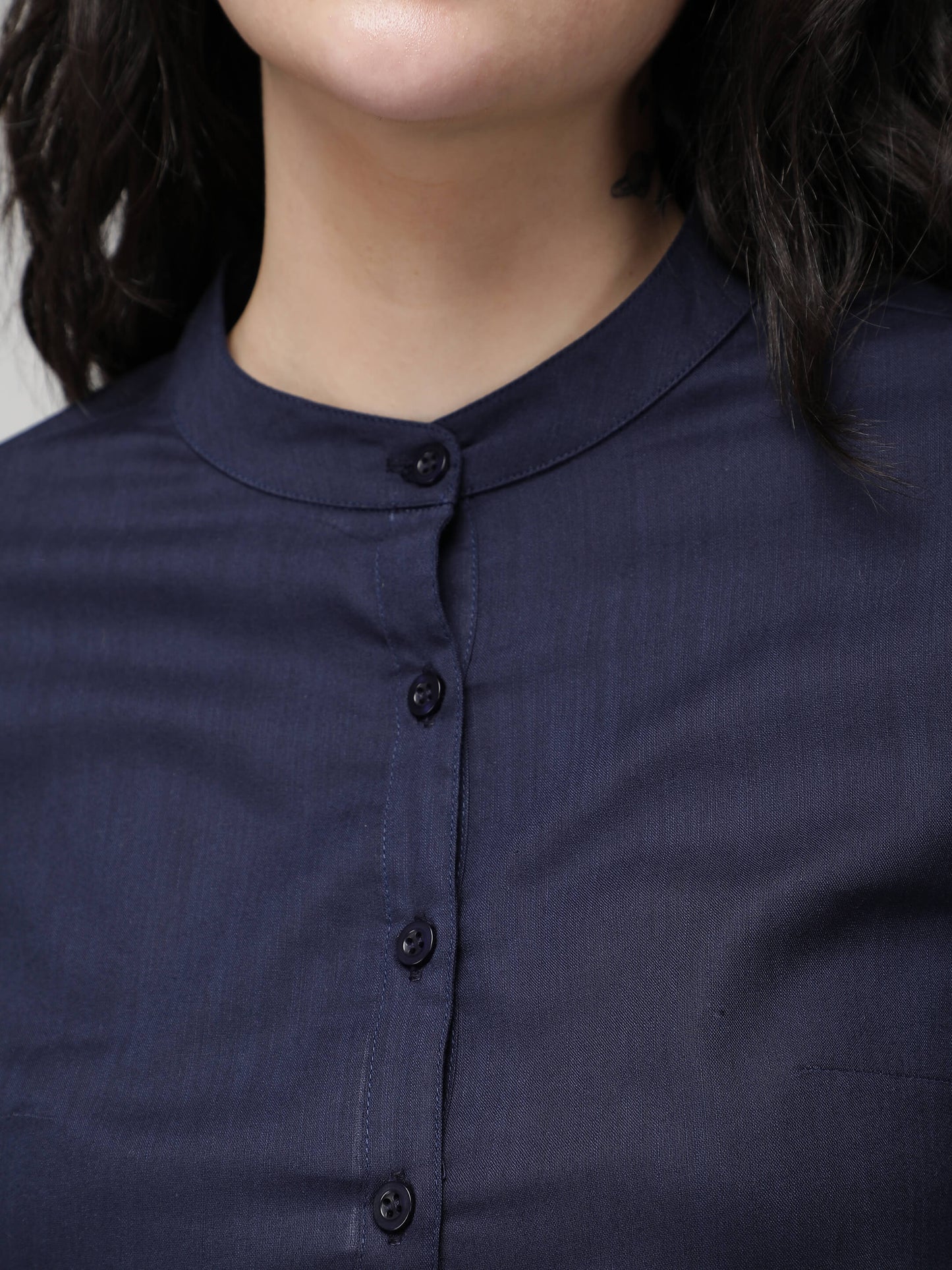 Navy blue mandarin collared, full sleeve rayon slub shirt. Full button down