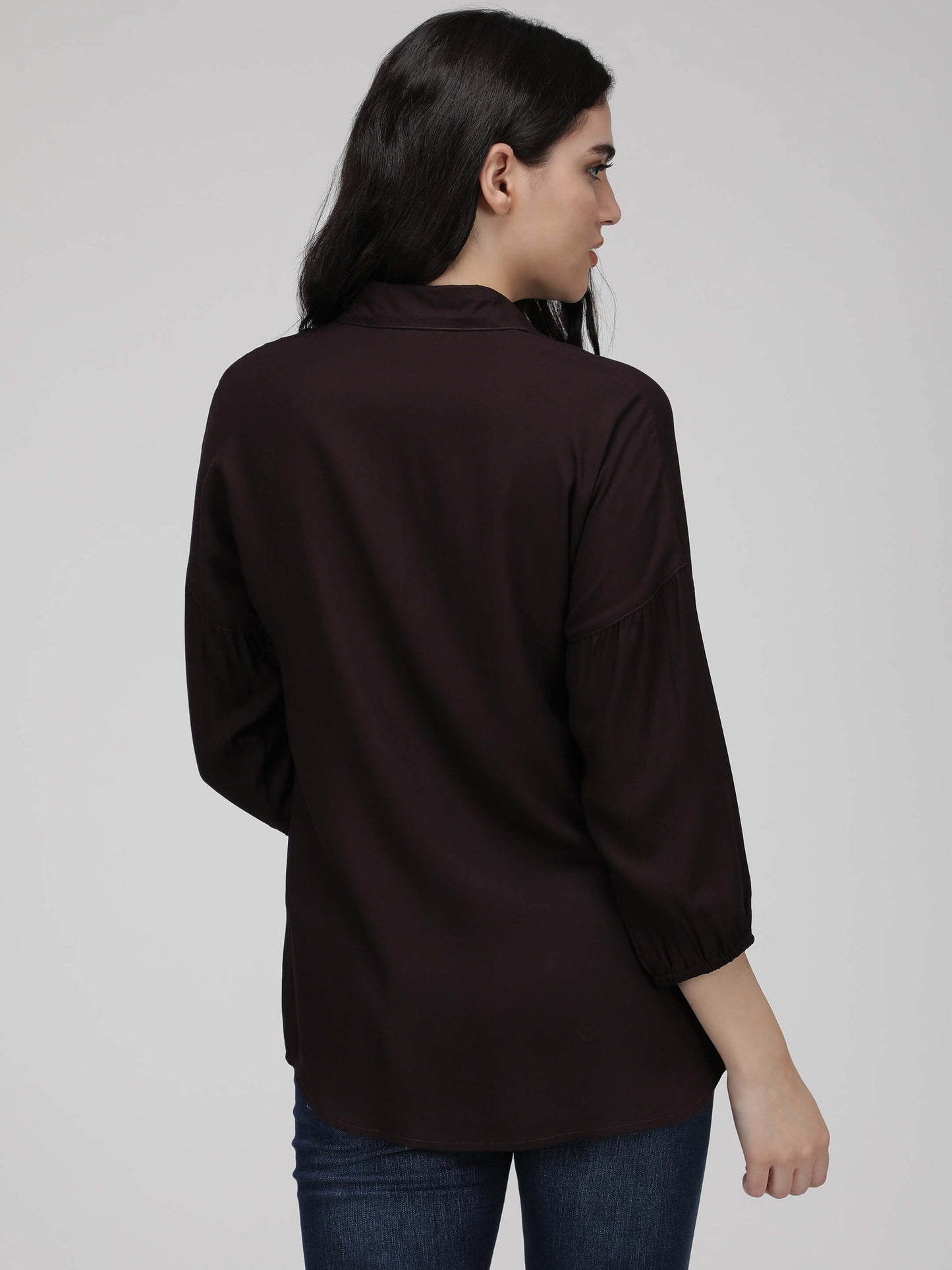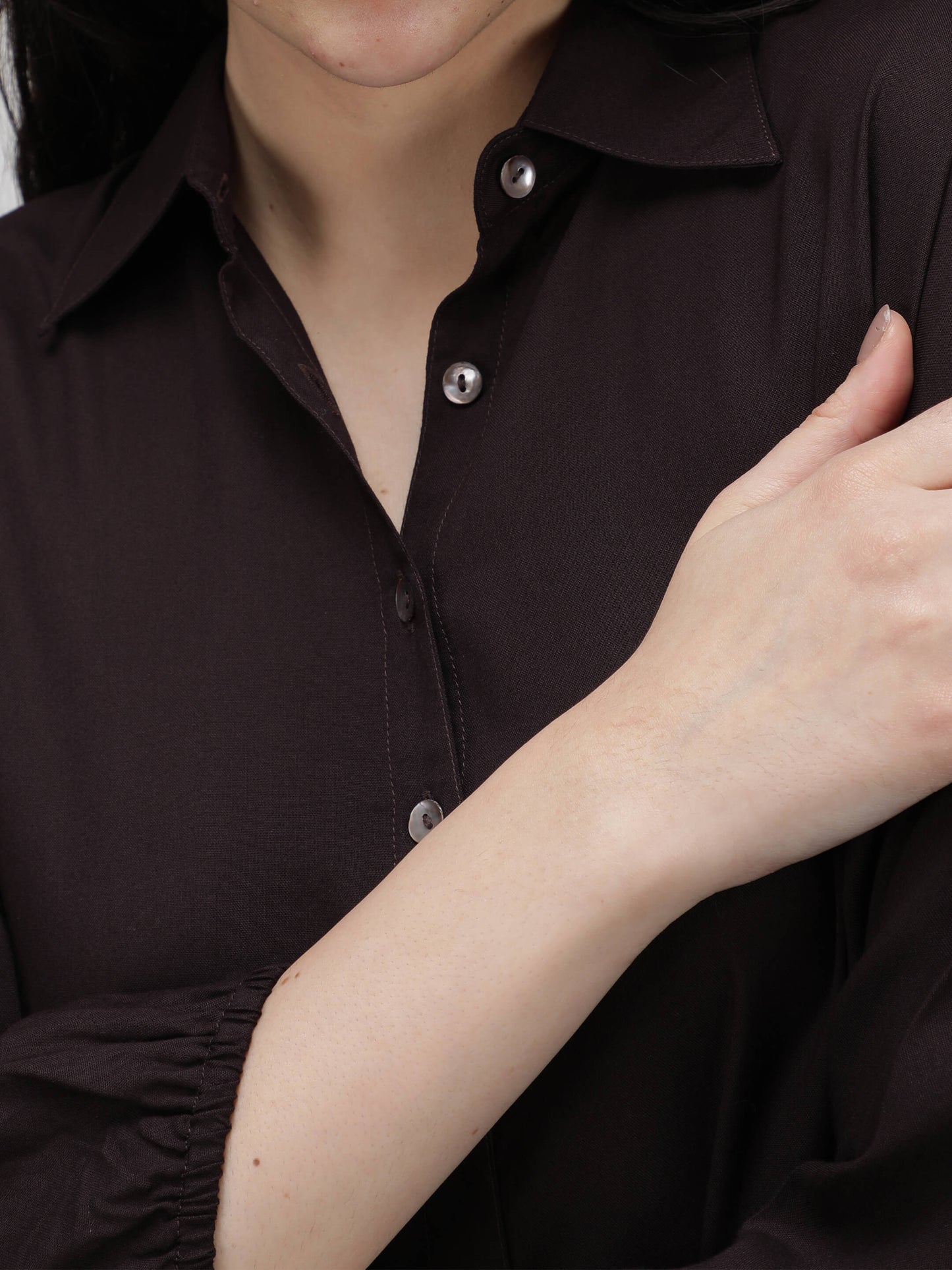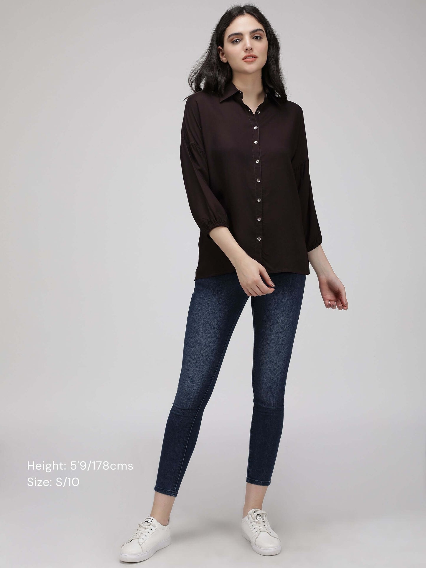 Crafted from soft rayon, it features loose-fit extended shoulders and bishop sleeves for optimum comfort.