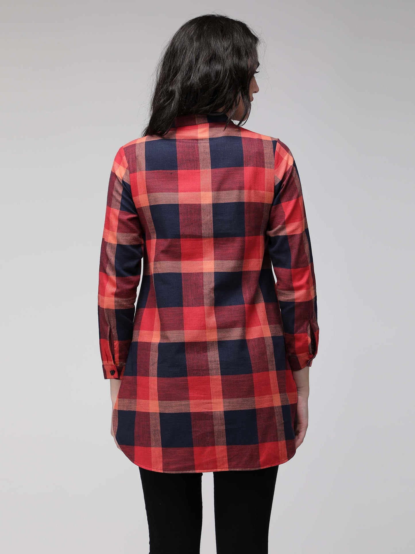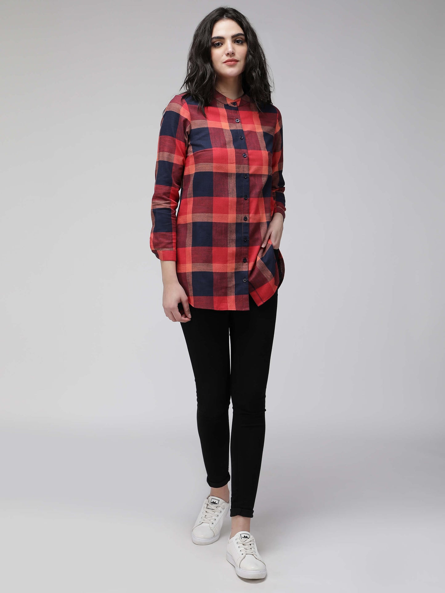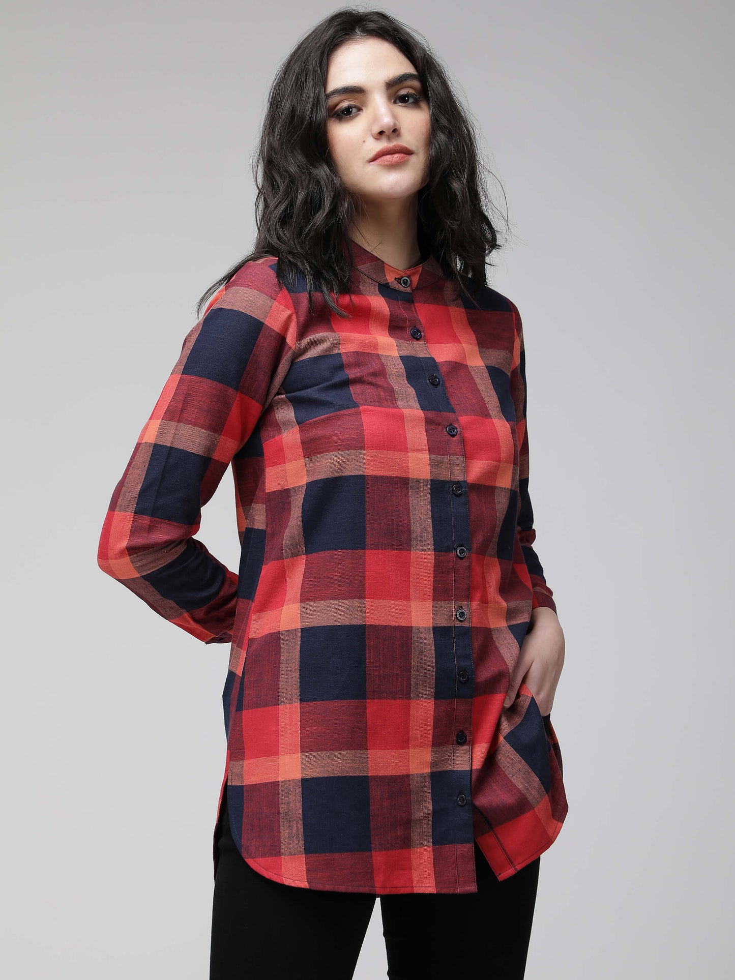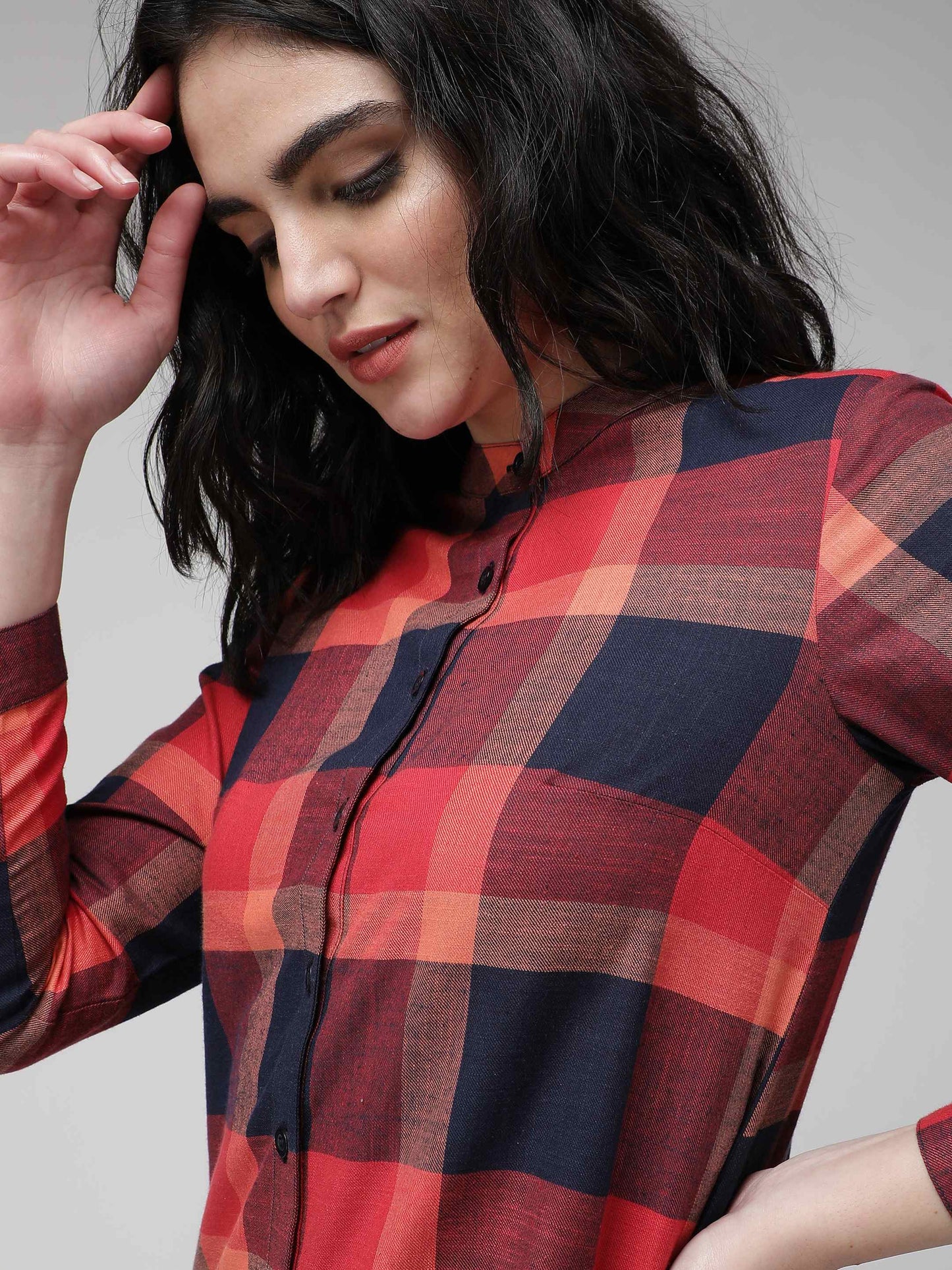 Red and blue checkered mandarin collared, full sleeve shirt. Slim fit. Full button down