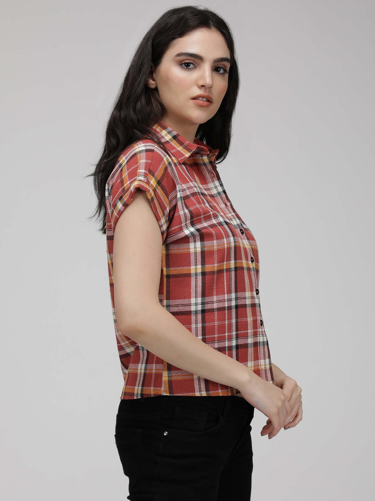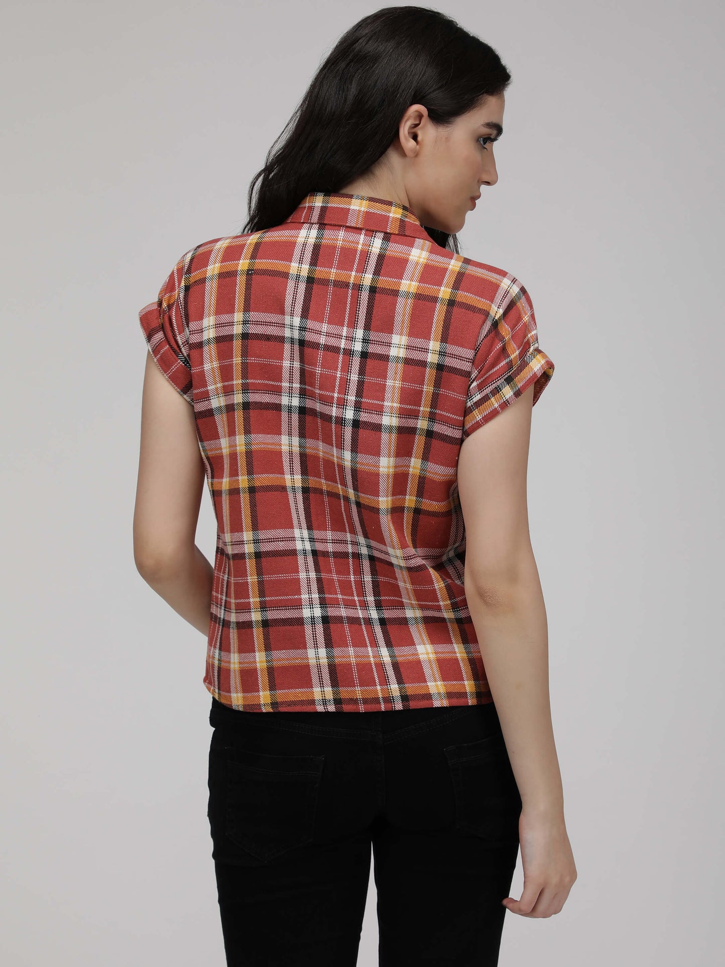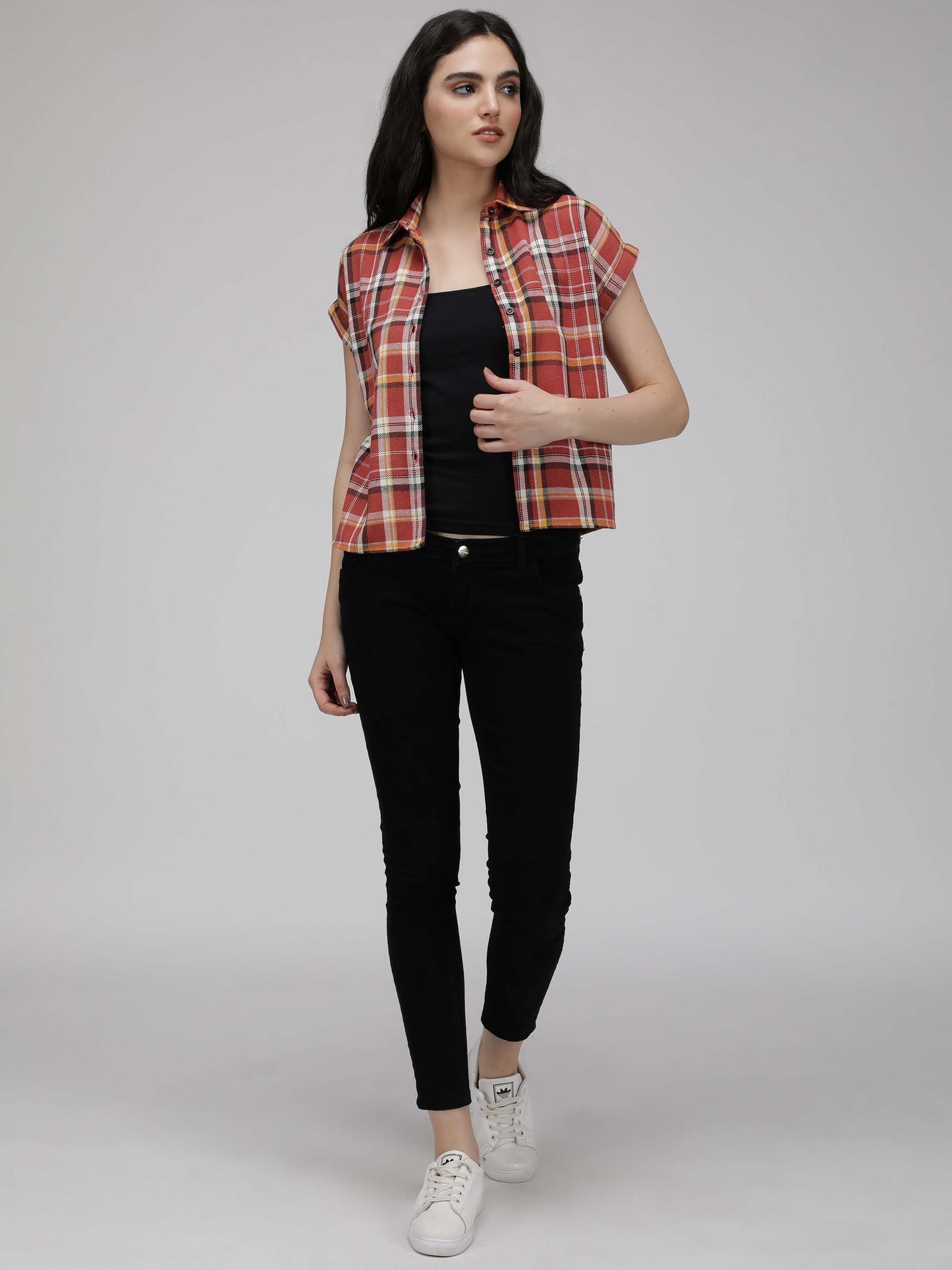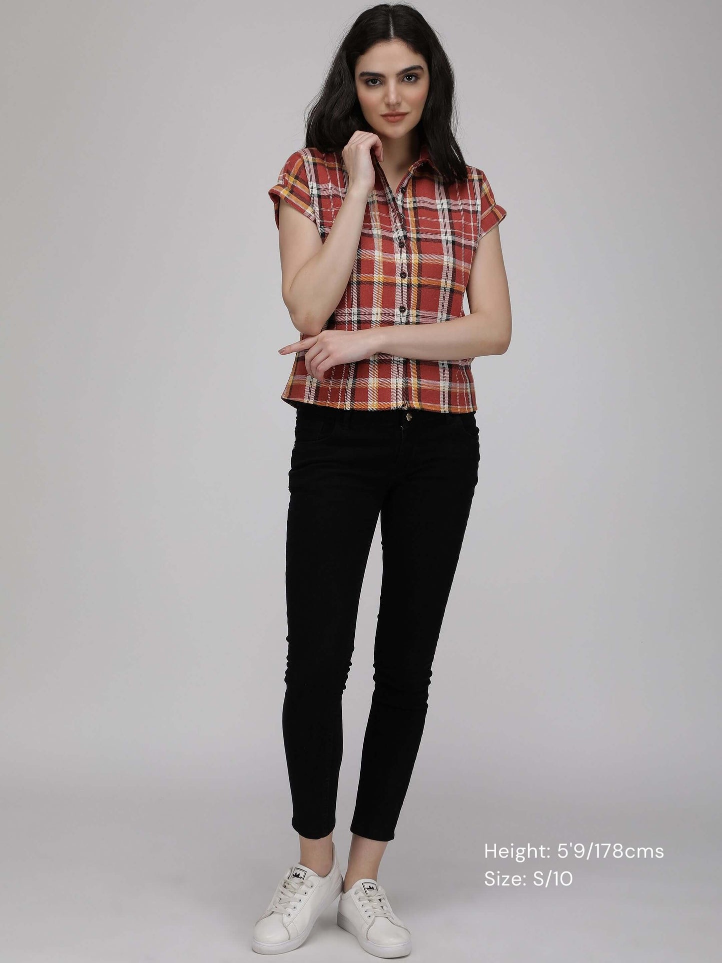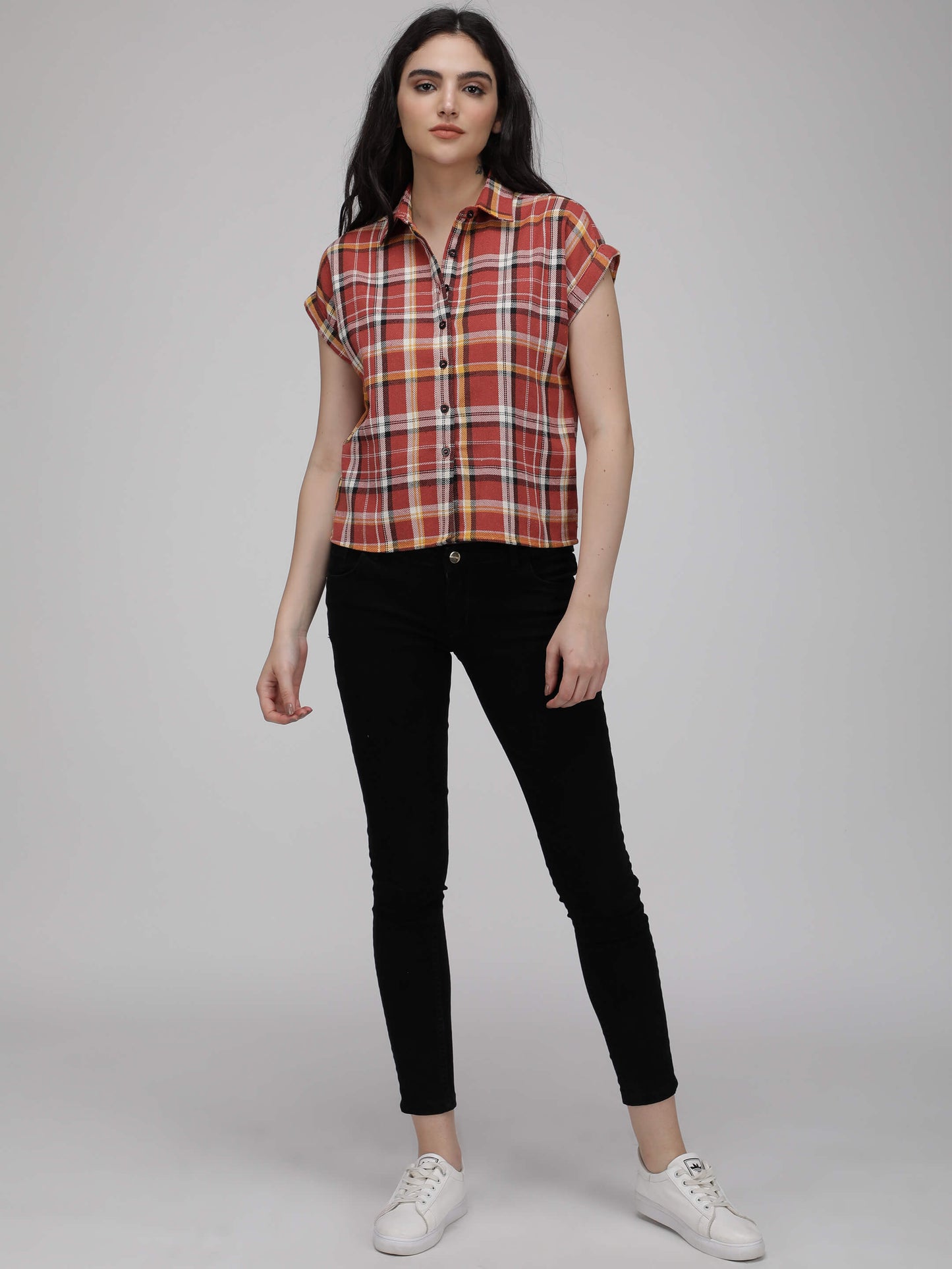 Regular price Rs. 600.00This timeless rust checkered crop shirt, with extended shoulder sleeves and crafted from thick rayon flannel. It can be worn as an over-shirt, adding a hint of elegance to any look.