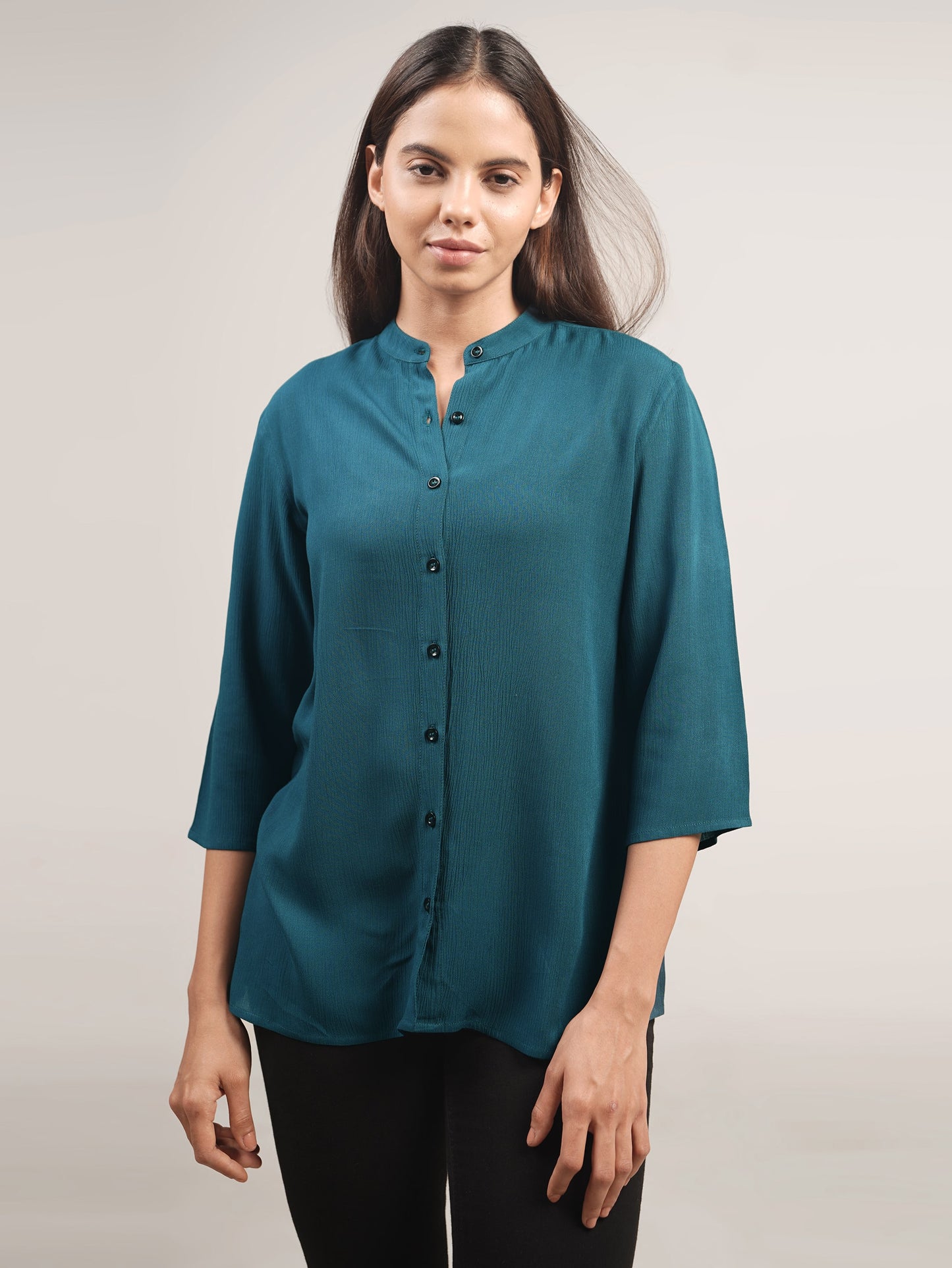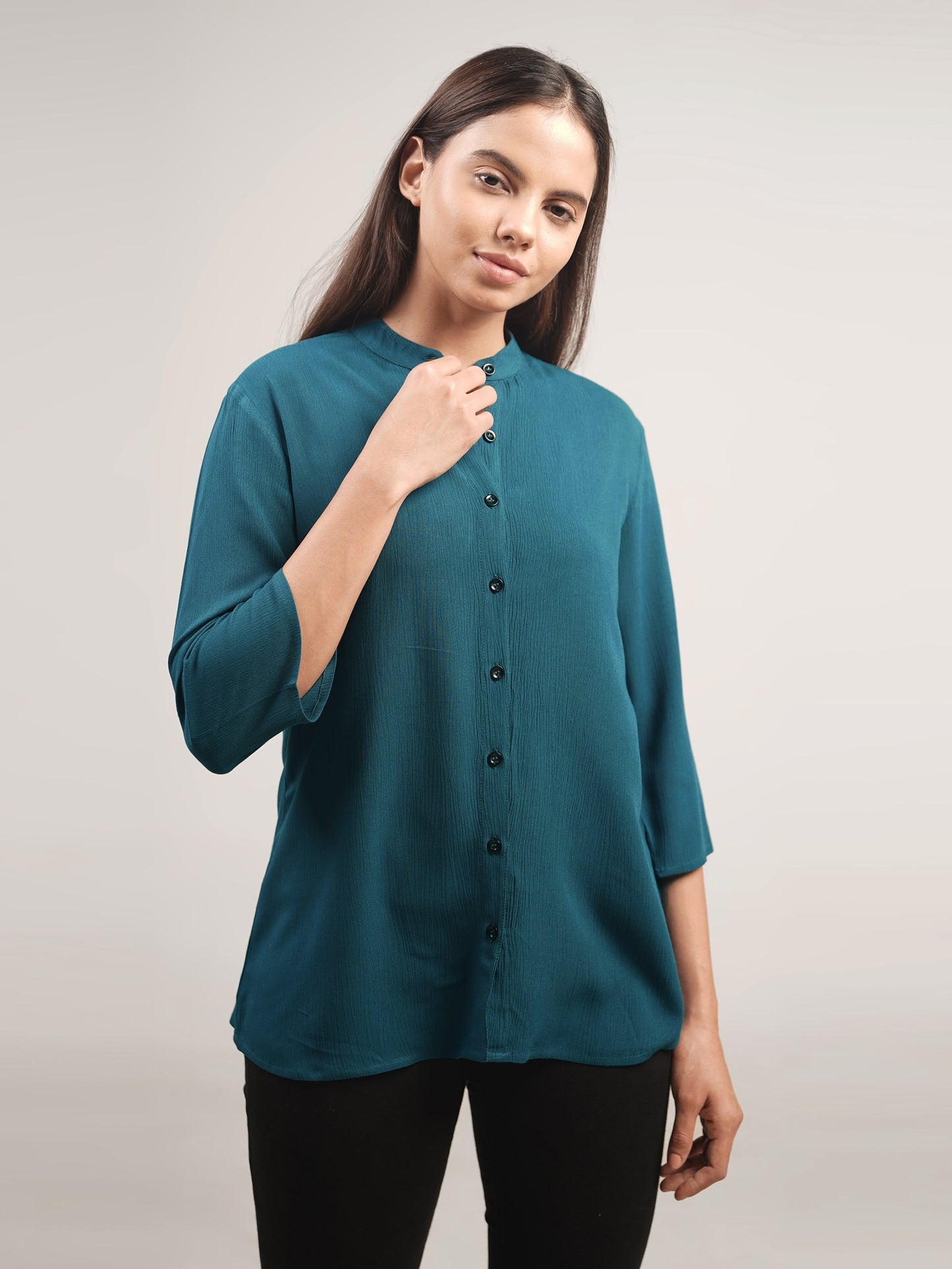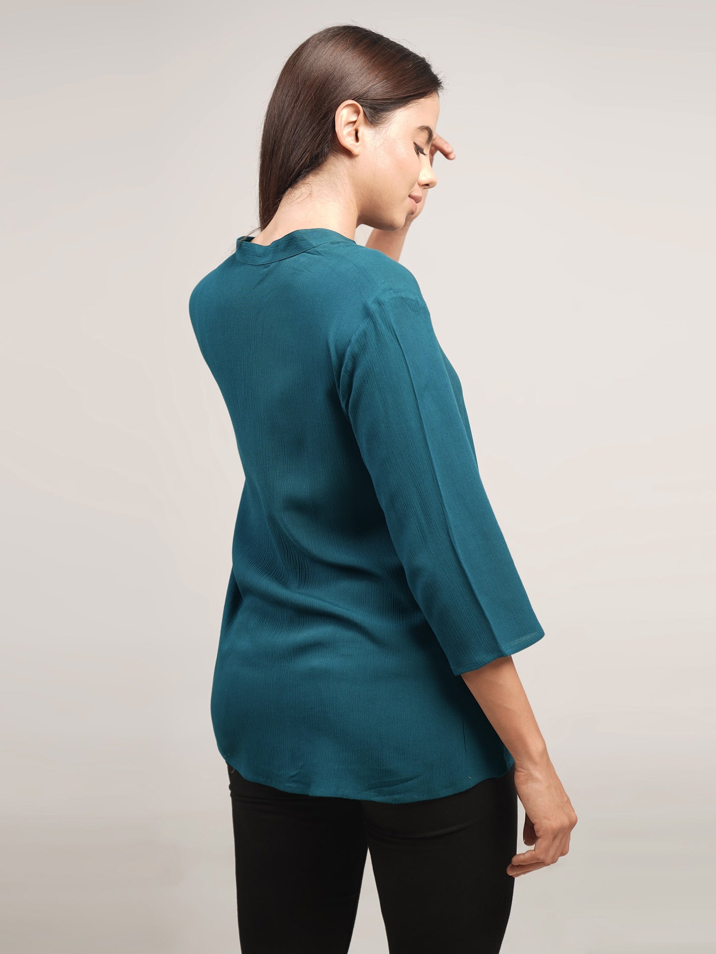 This teal blue mandarin neck shirt is made of soft, crushed rayon fabric for a light and comfortable fit. It features three-quarter length sleeves for an elegant look.