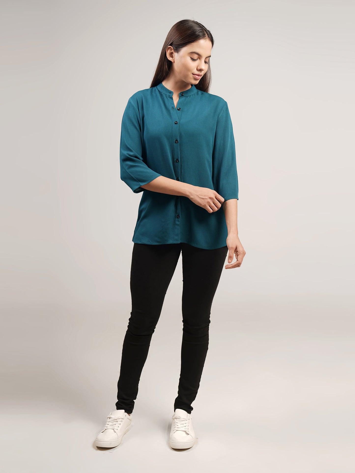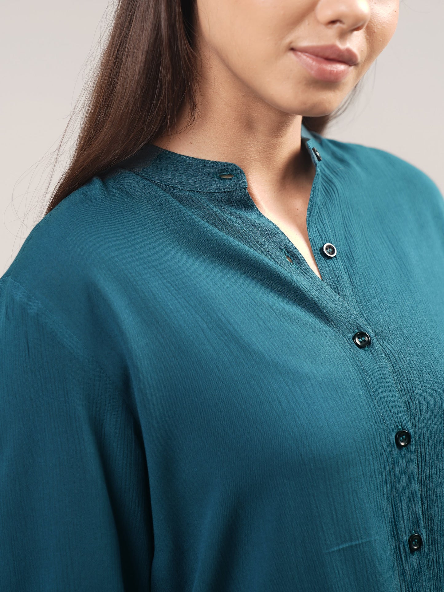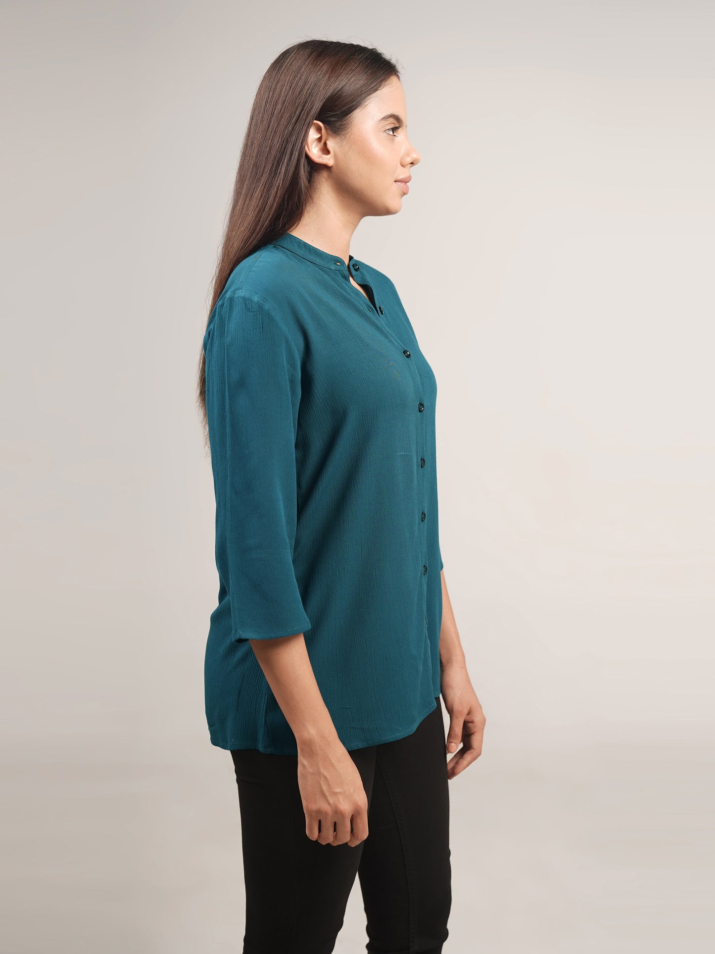 This teal blue mandarin neck shirt is made of soft, crushed rayon fabric for a light and comfortable fit. It features three-quarter length sleeves for an elegant look.