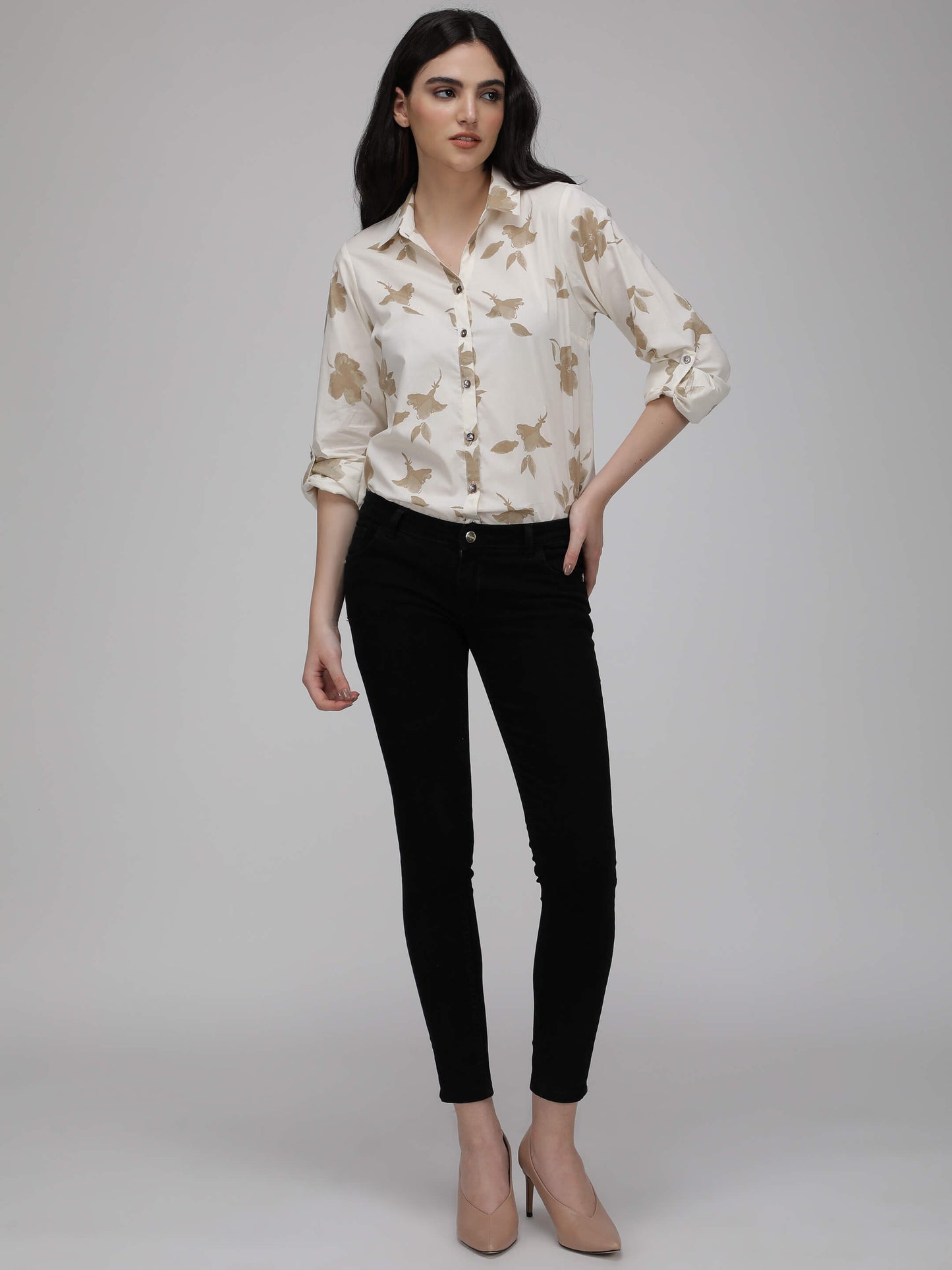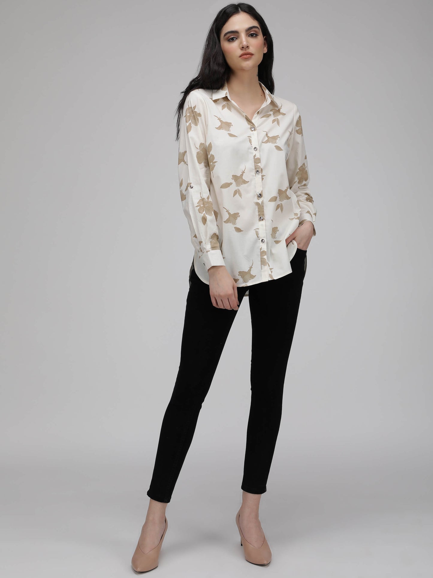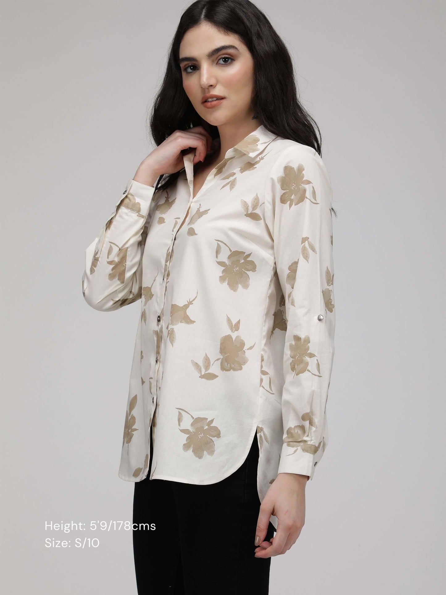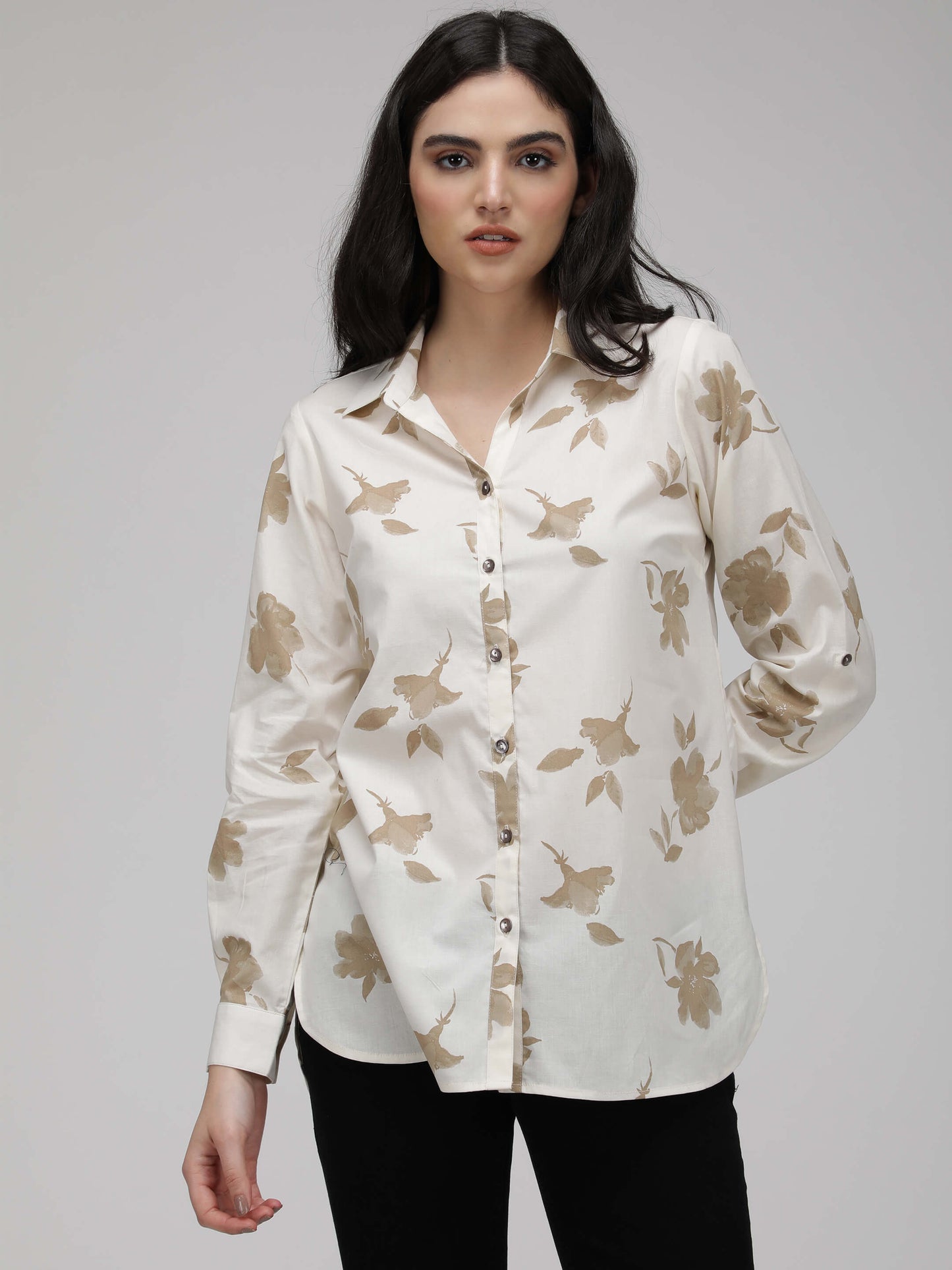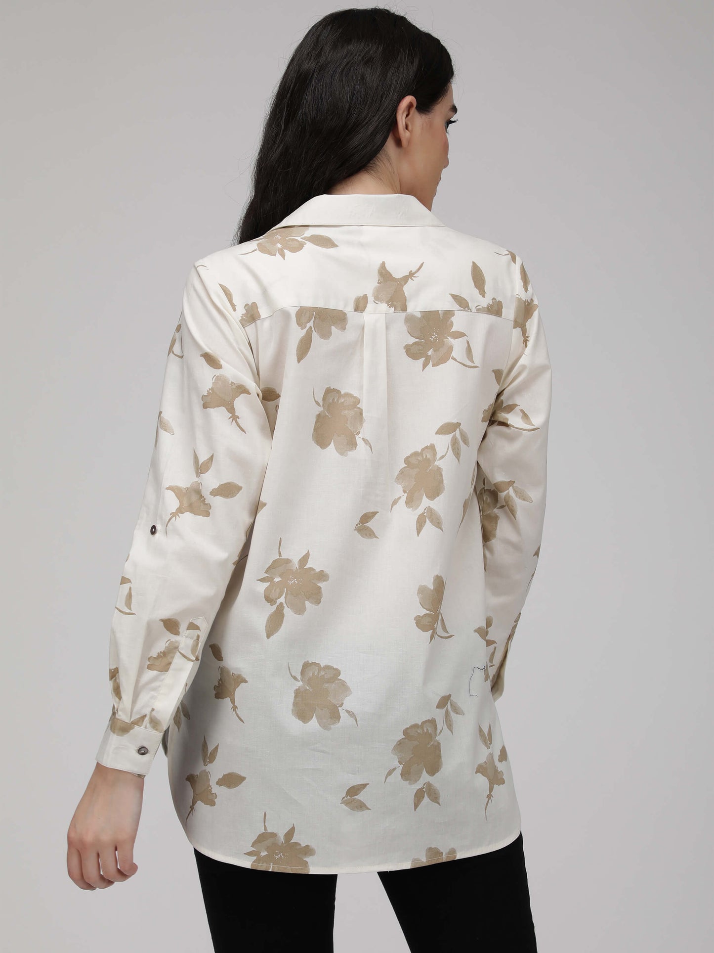 Regular price Rs. 540.00This premium cotton poplin shirt features a loose fit and full sleeves, with a tasteful floral print in white and golden. Crafted with care.