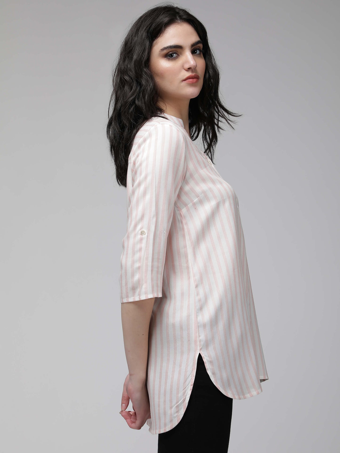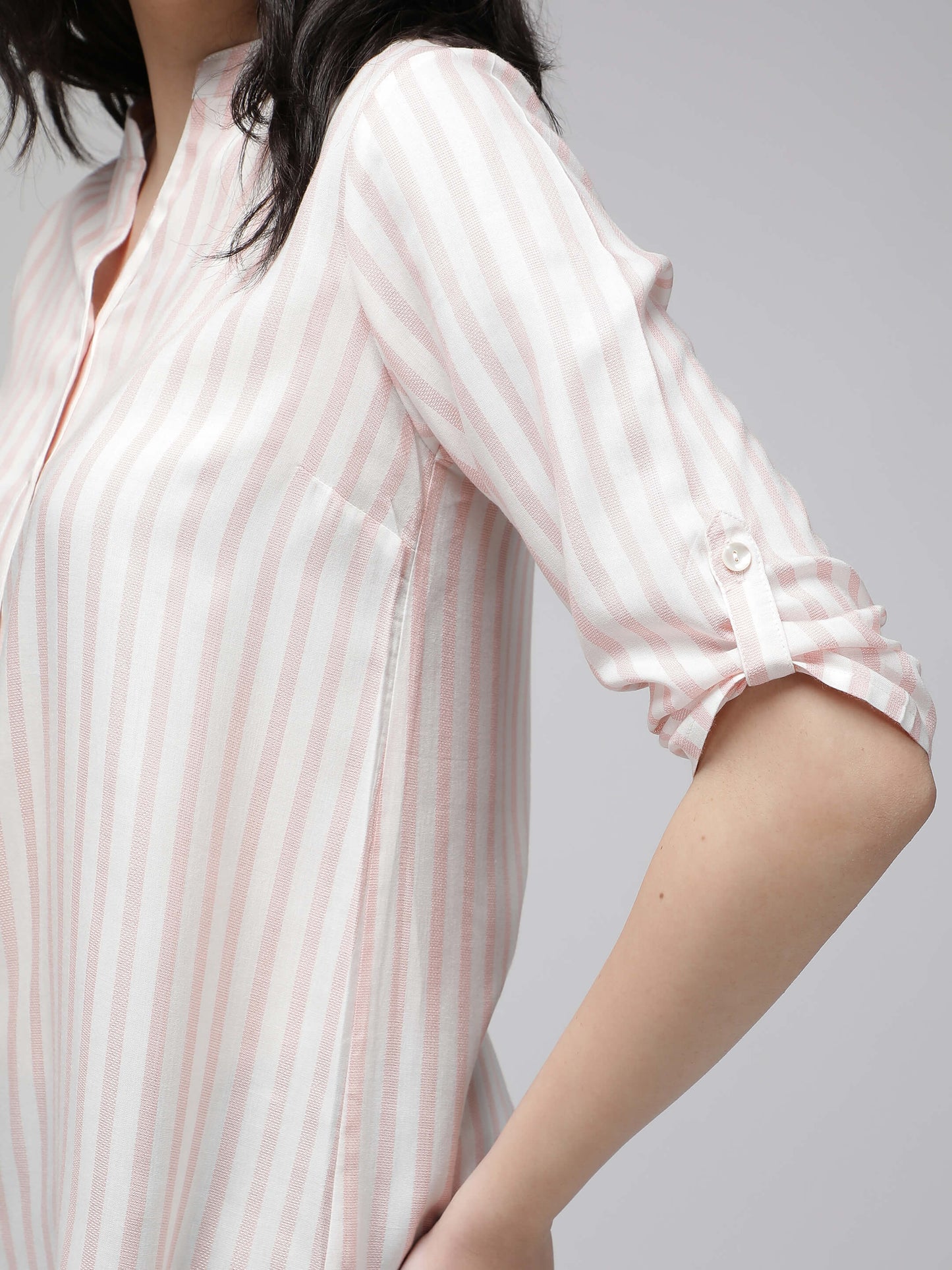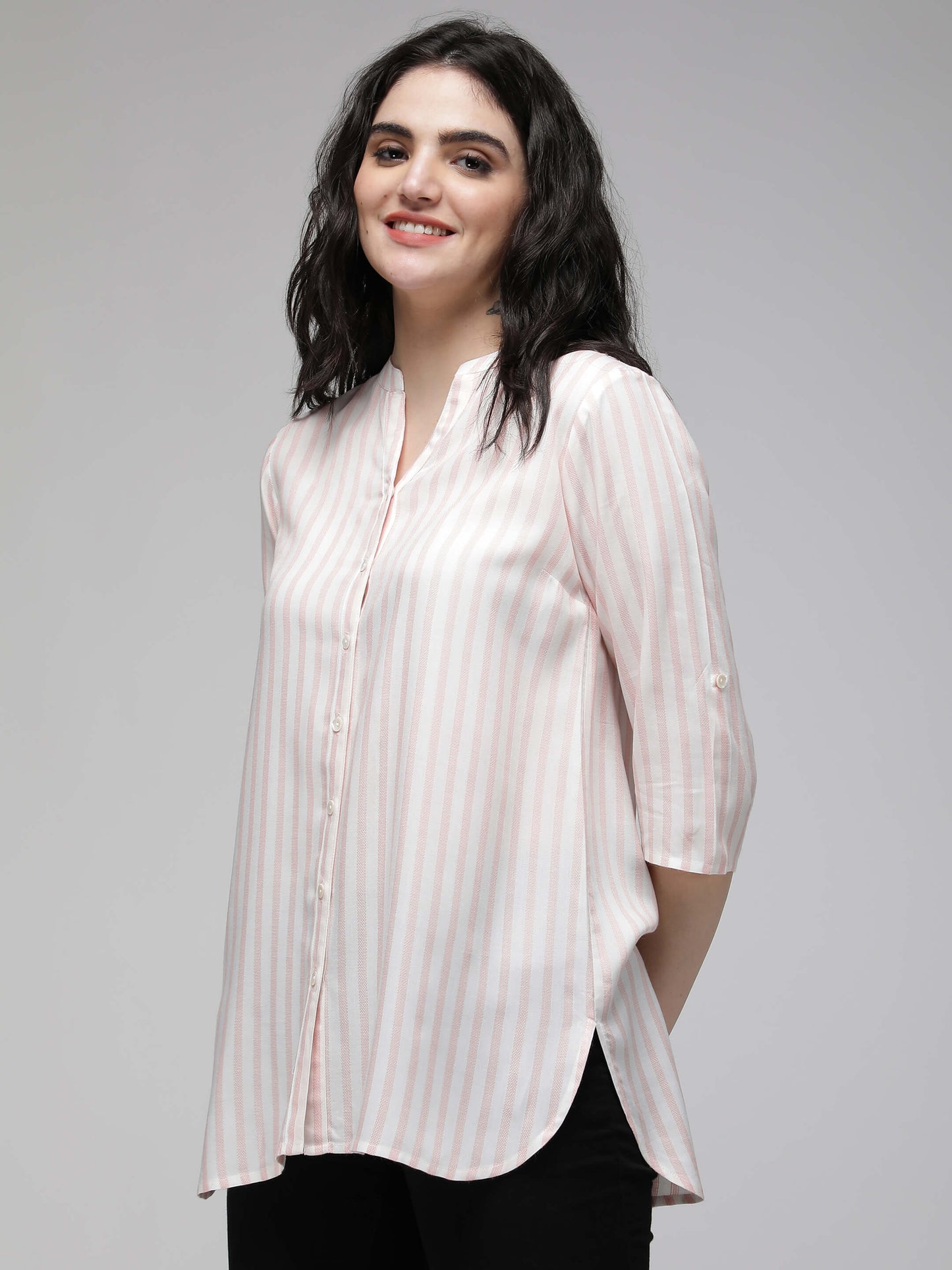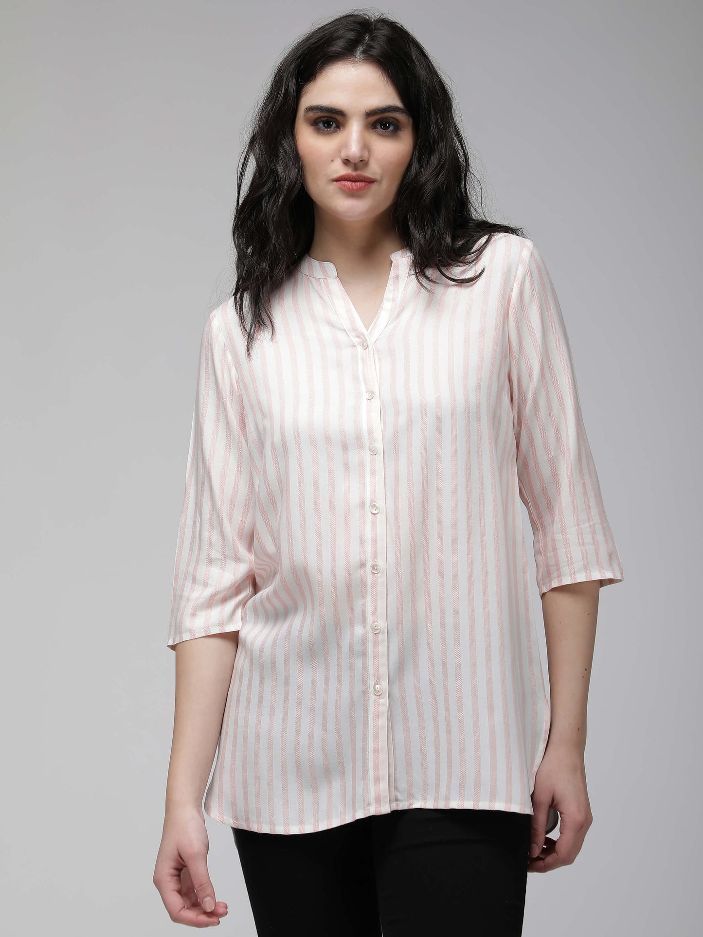 white and pink striped button down shirt, comfort fit, three quarter sleeves.