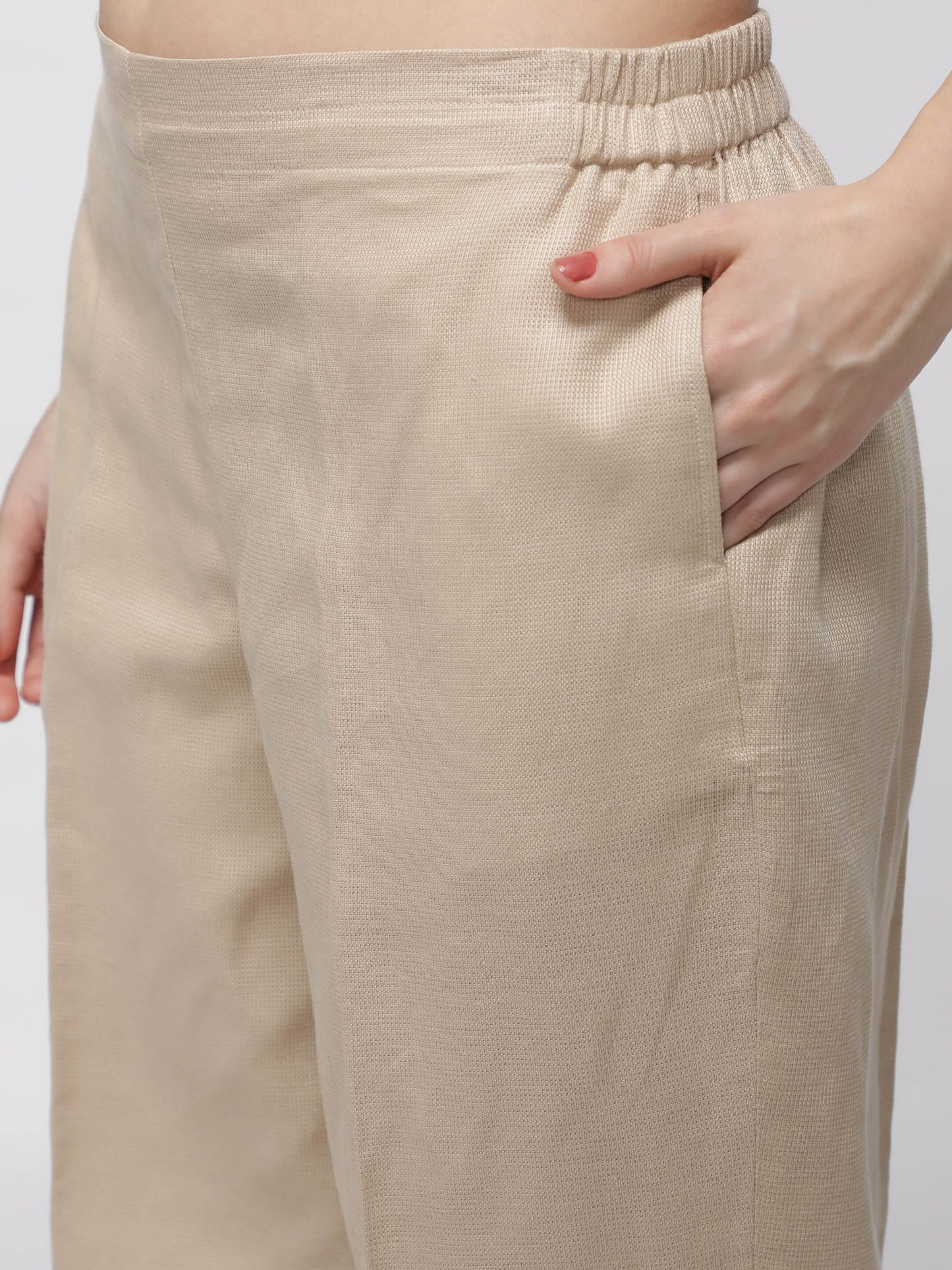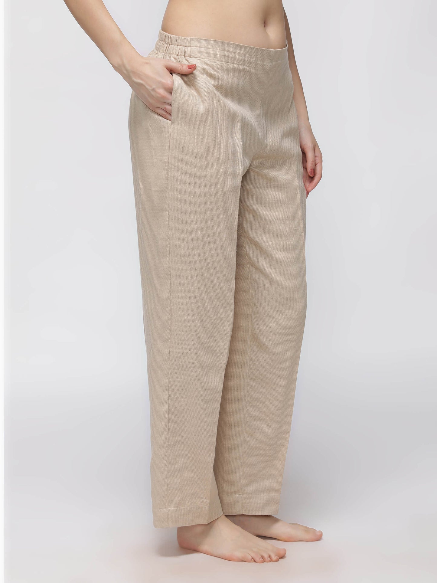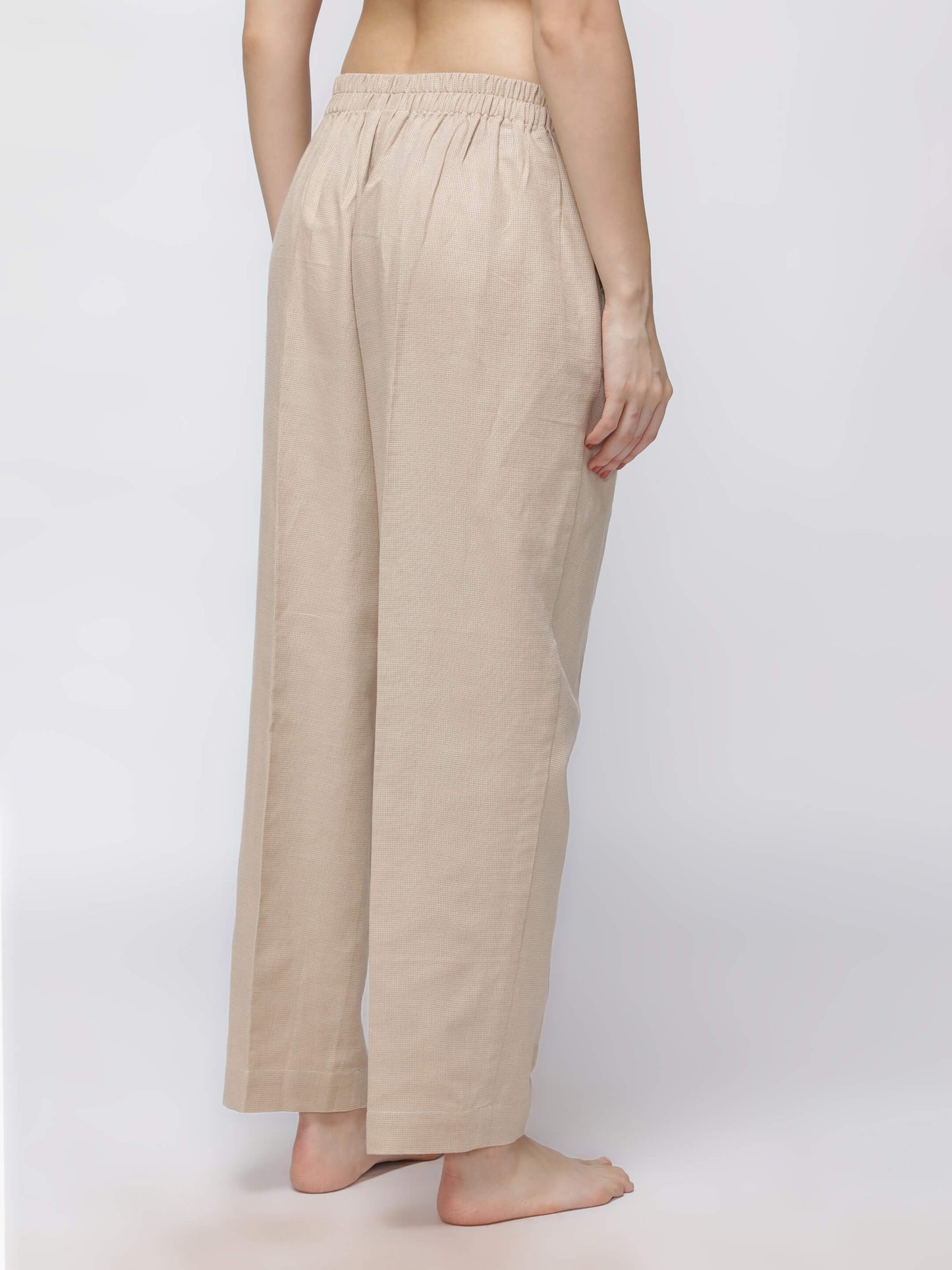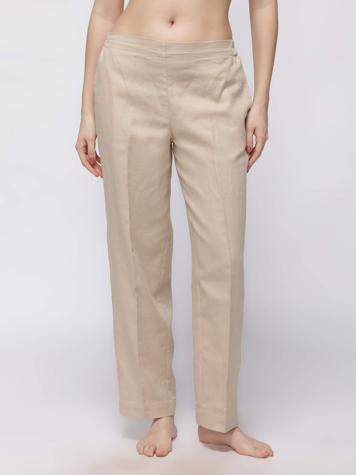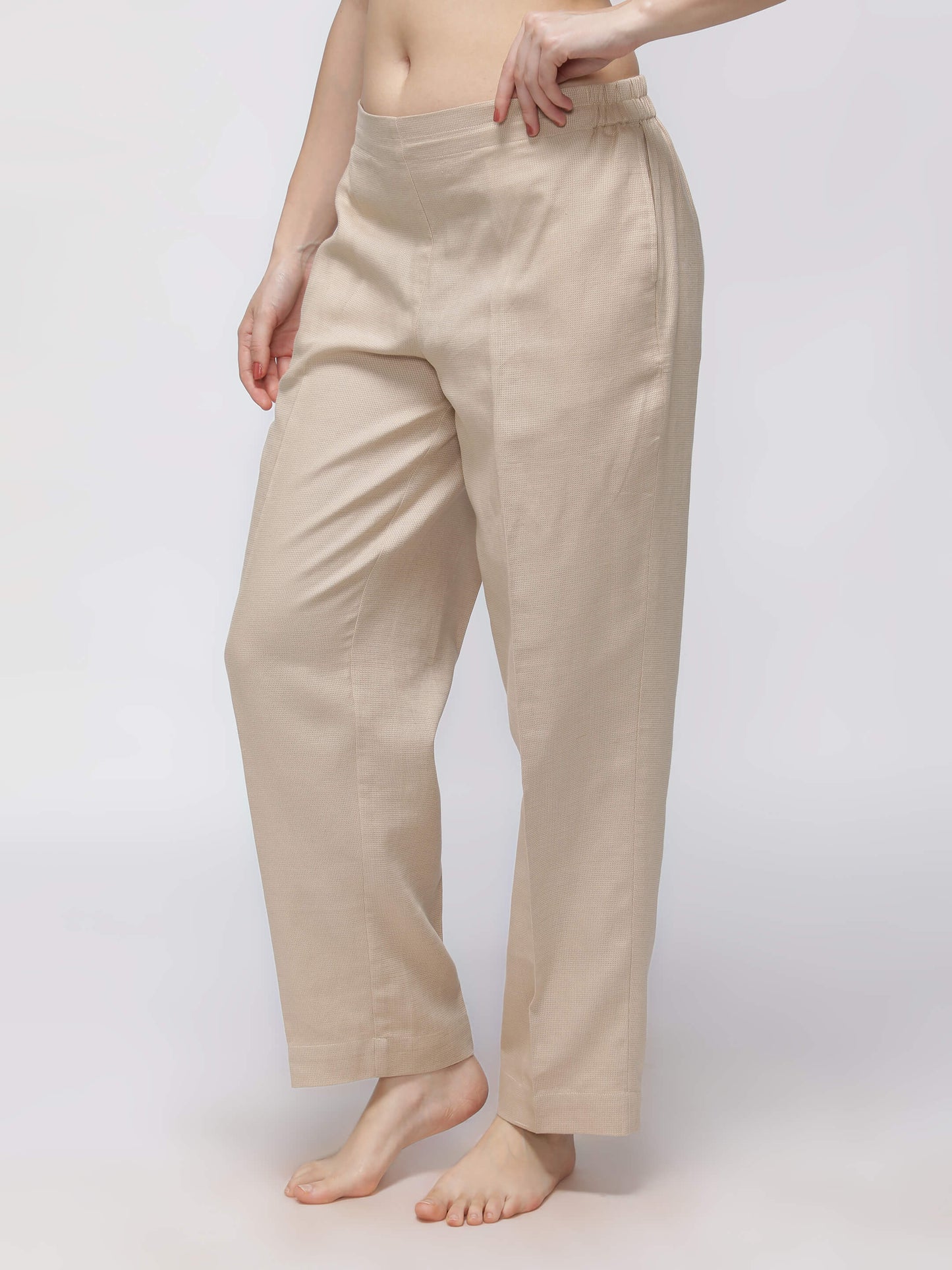 Crafted from soft textured rayon, these beige pants combine breath ability with style. The elastic waist and pockets add everyday ease.