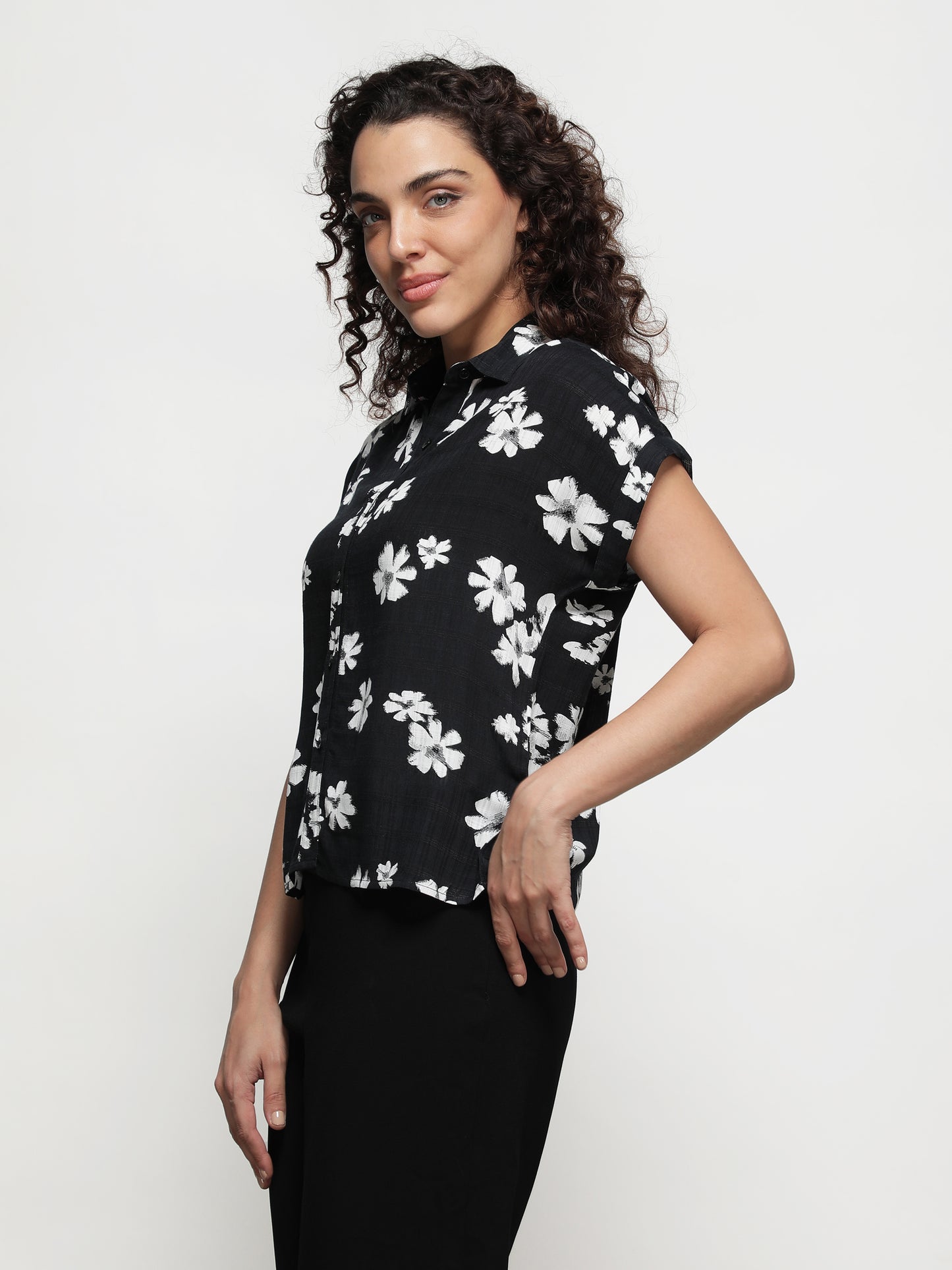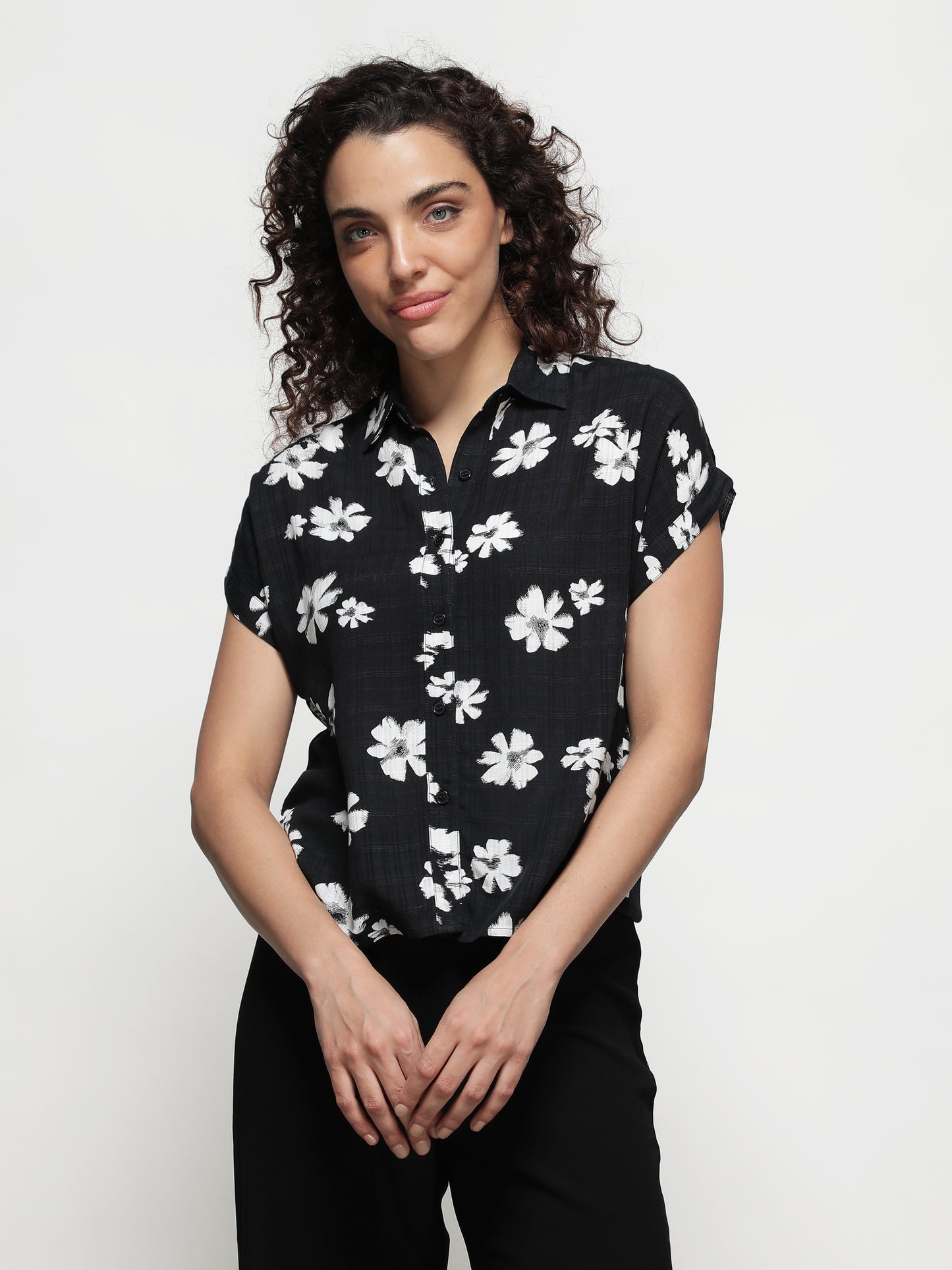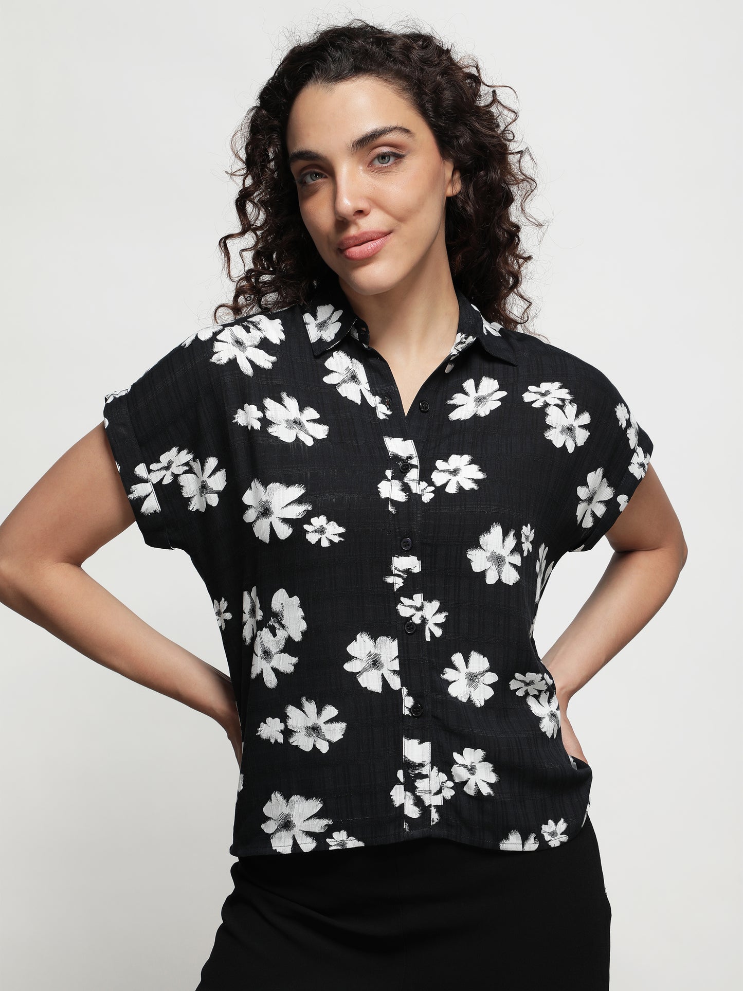 Regular price Rs. 899.00A floral twist on a classic crop shirt! Designed in airy crepe fabric, this black printed piece features extended shoulder sleeves for a relaxed yet structured look. Perfect for styling up or down.