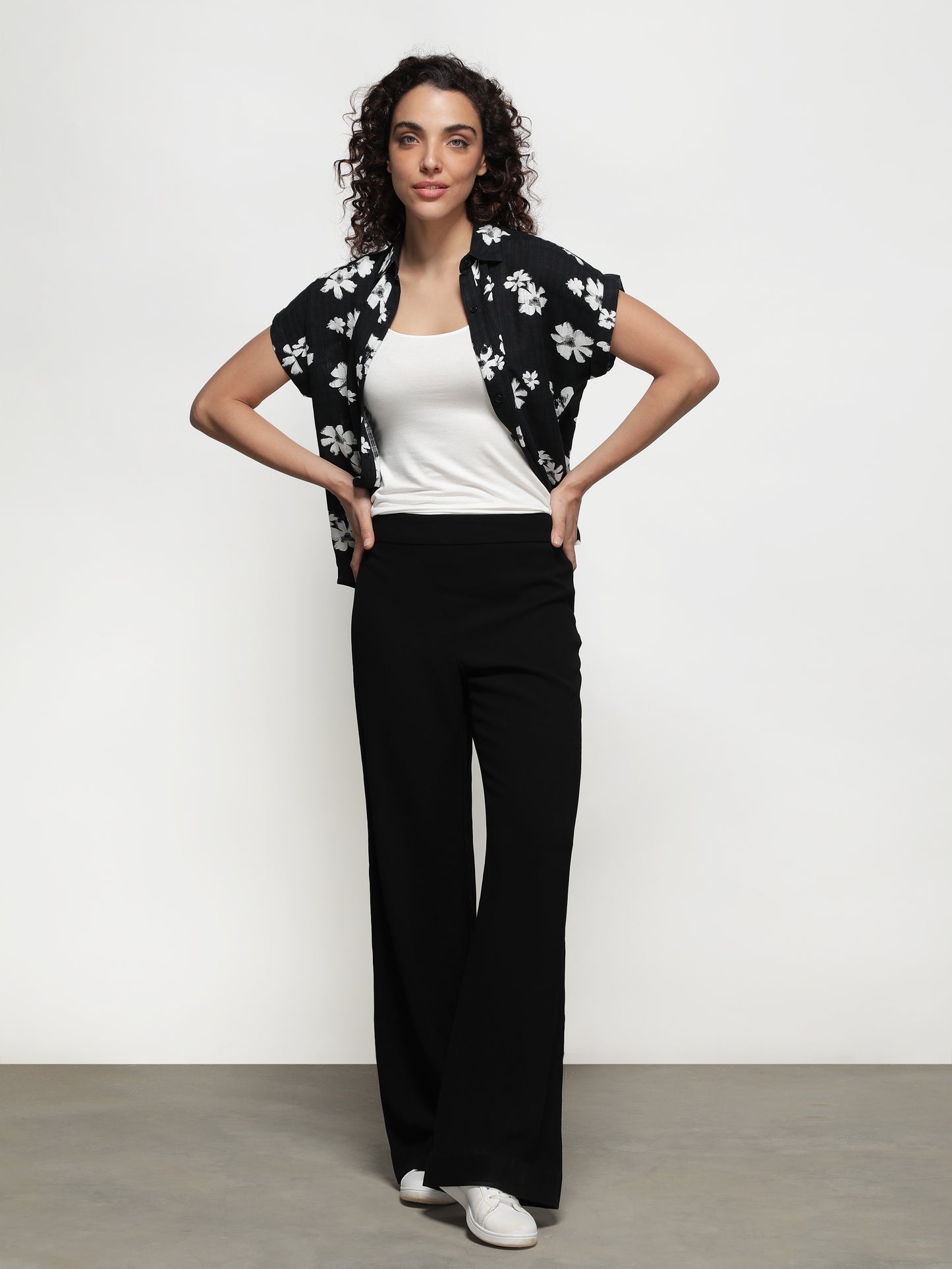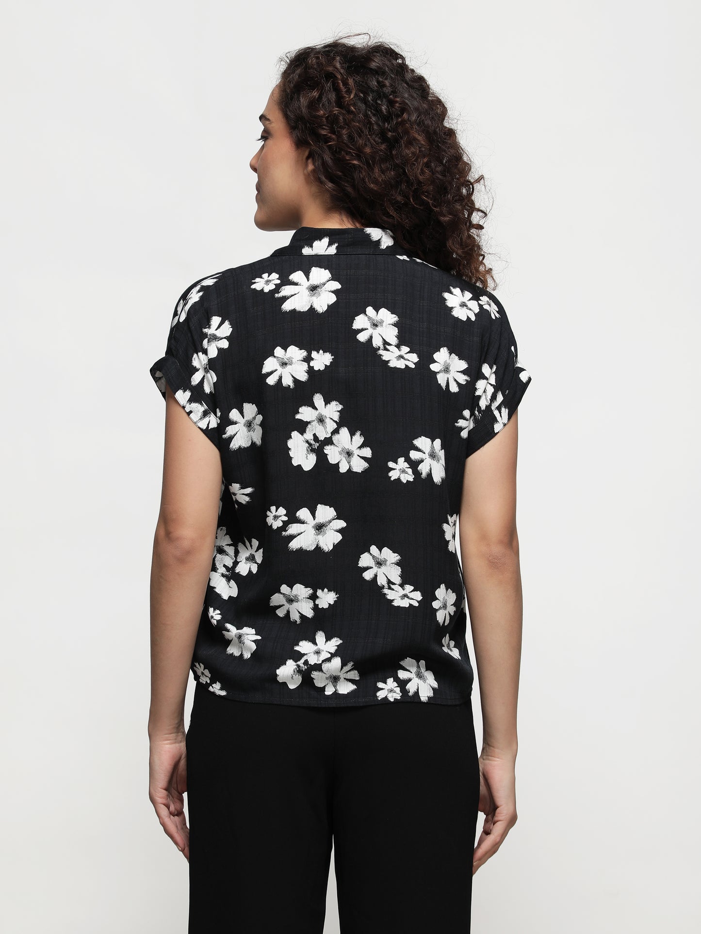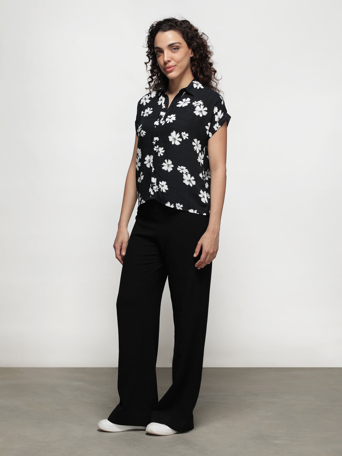 Regular price Rs. 899.00A floral twist on a classic crop shirt! Designed in airy crepe fabric, this black printed piece features extended shoulder sleeves for a relaxed yet structured look. Perfect for styling up or down.