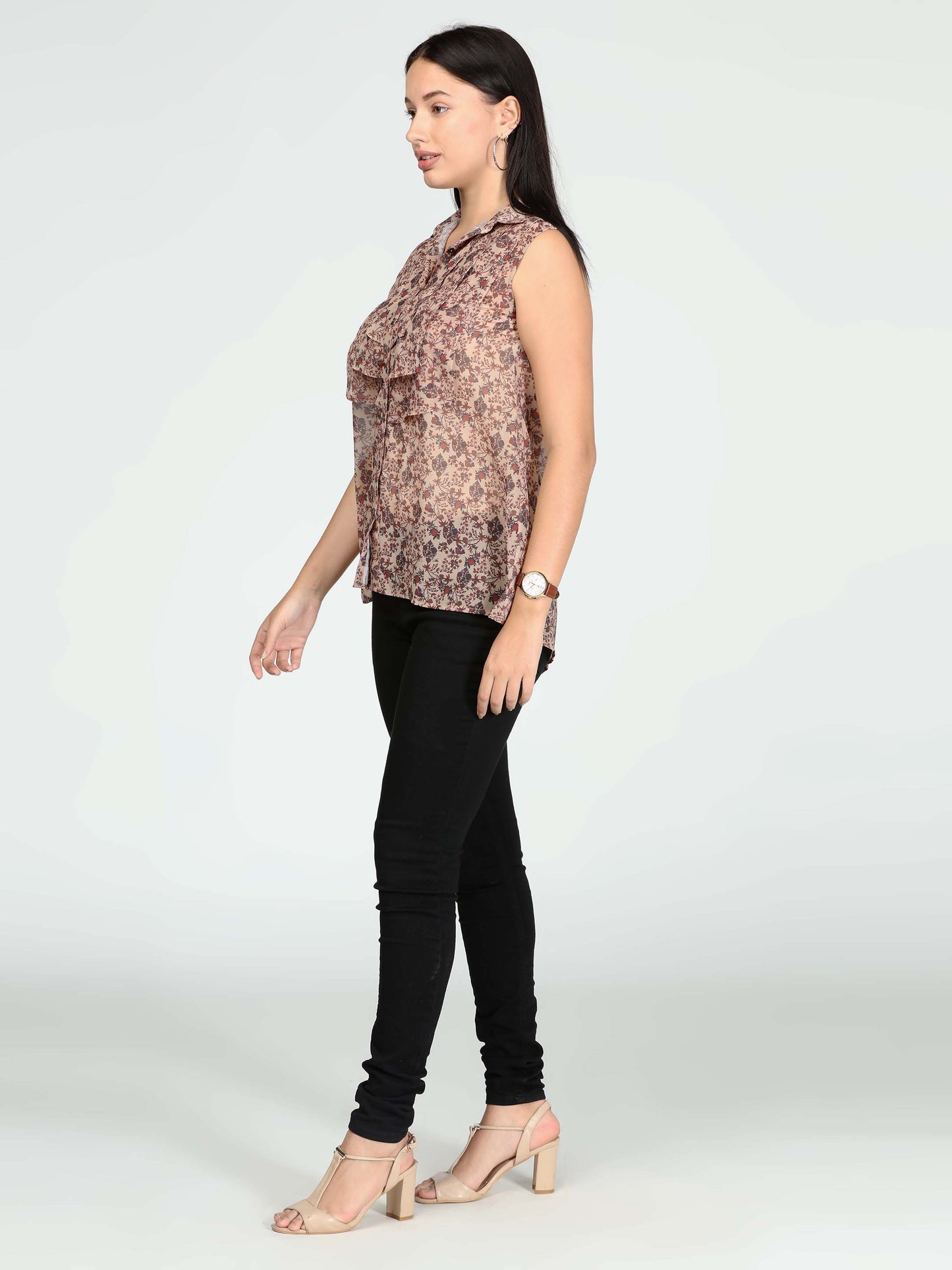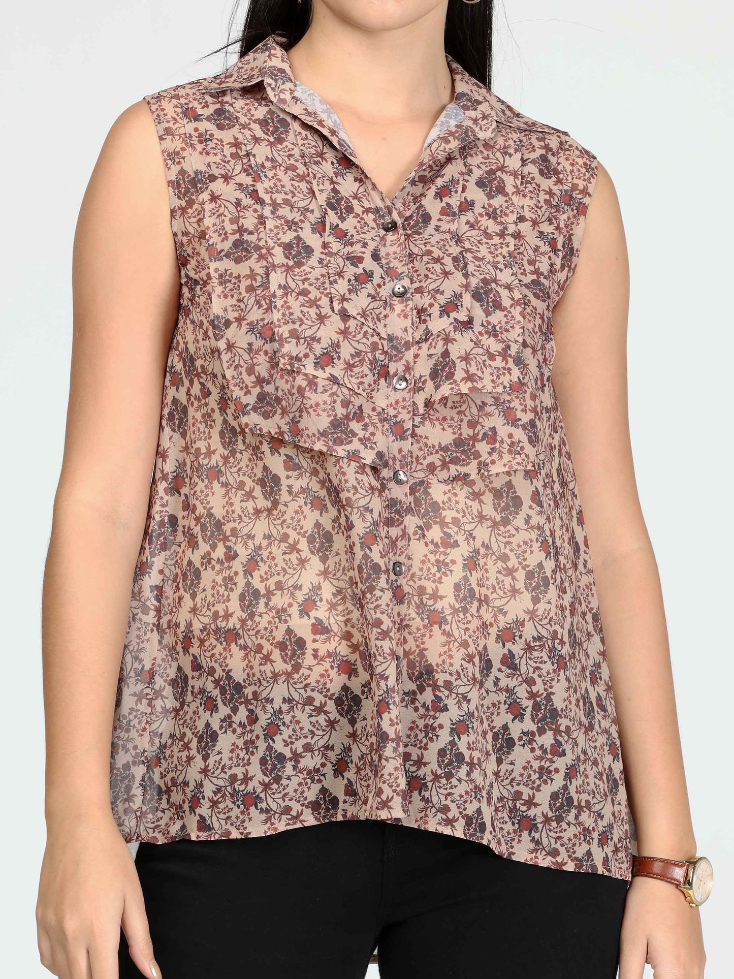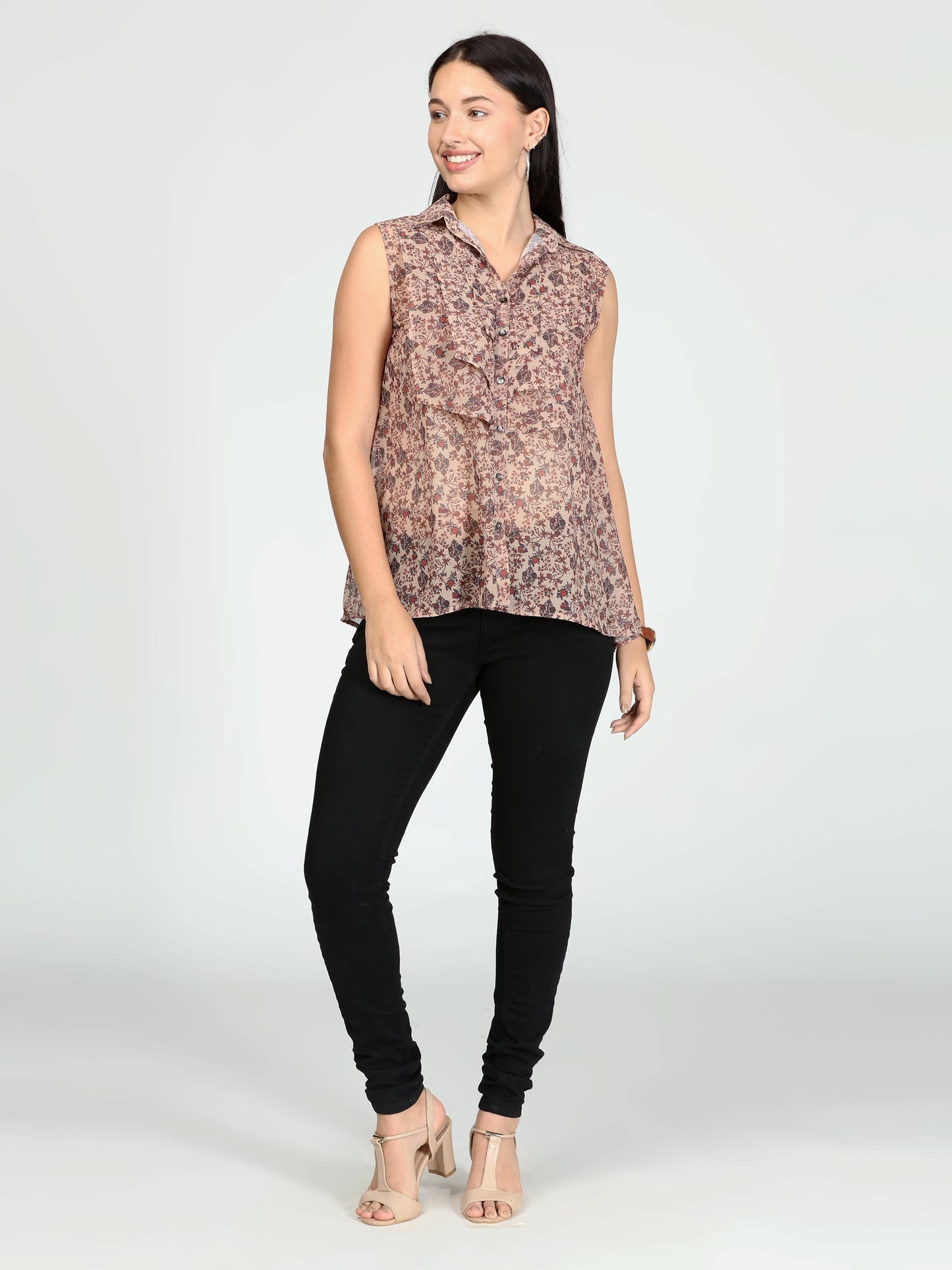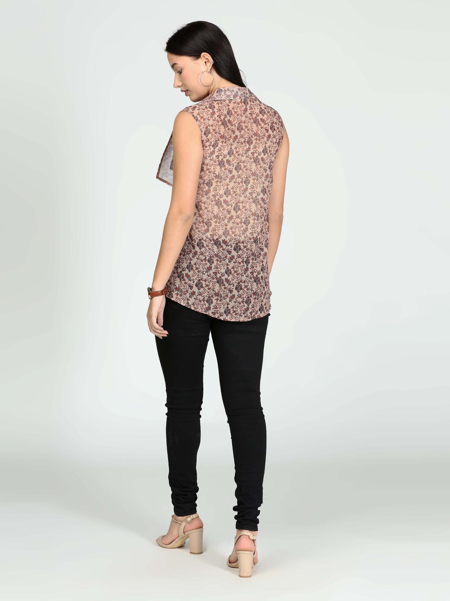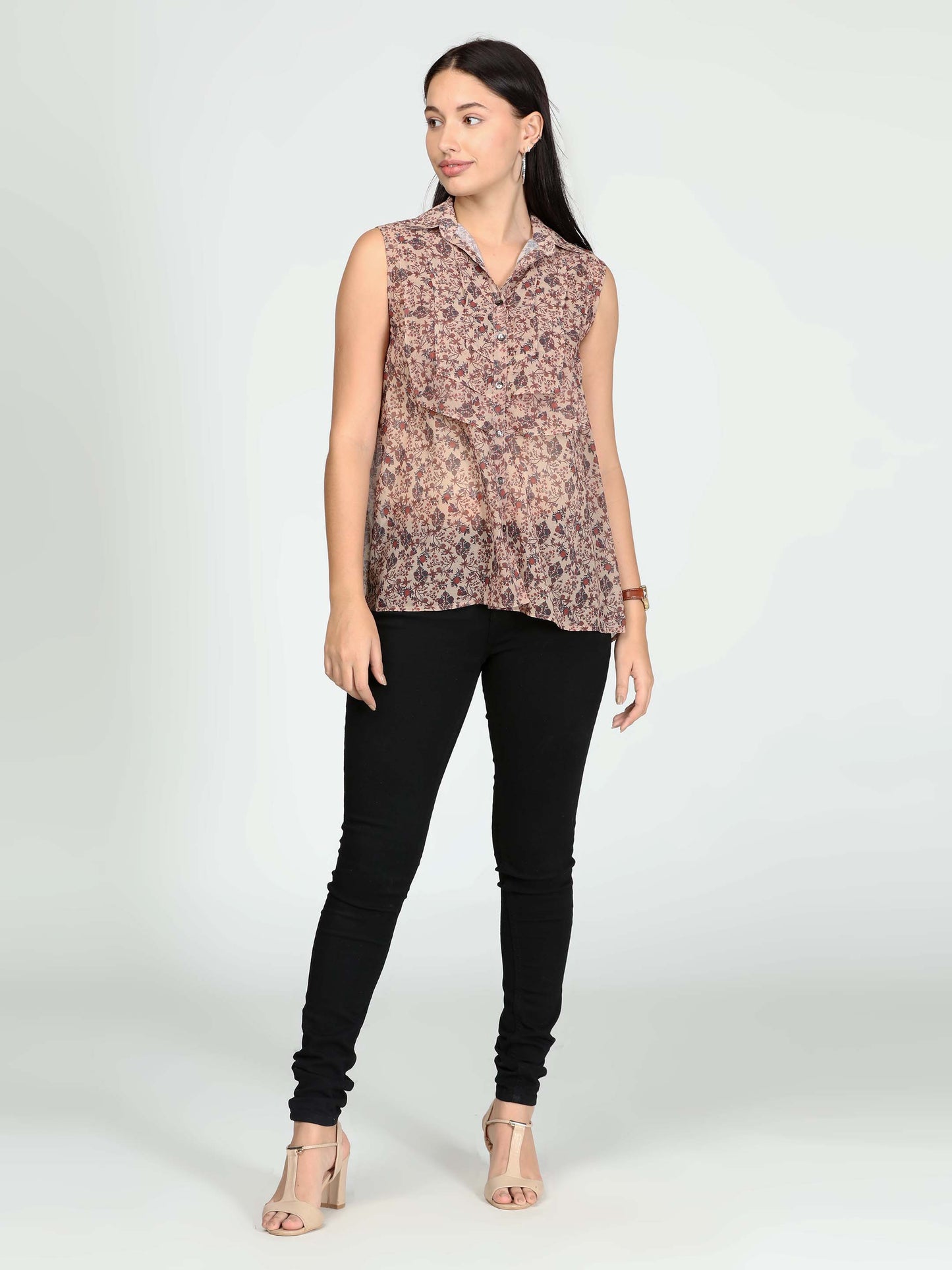 Cream printed georgette shirt, sleevelss, mandarin collar.