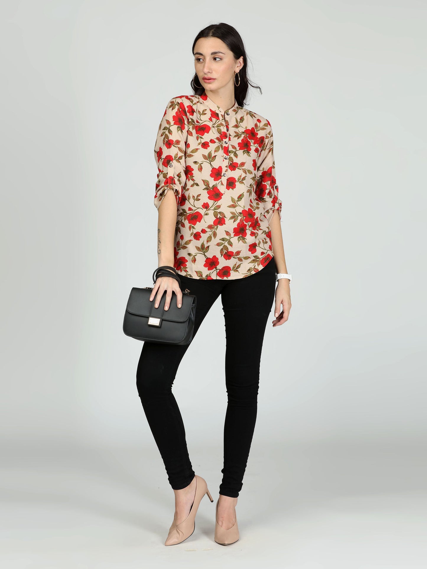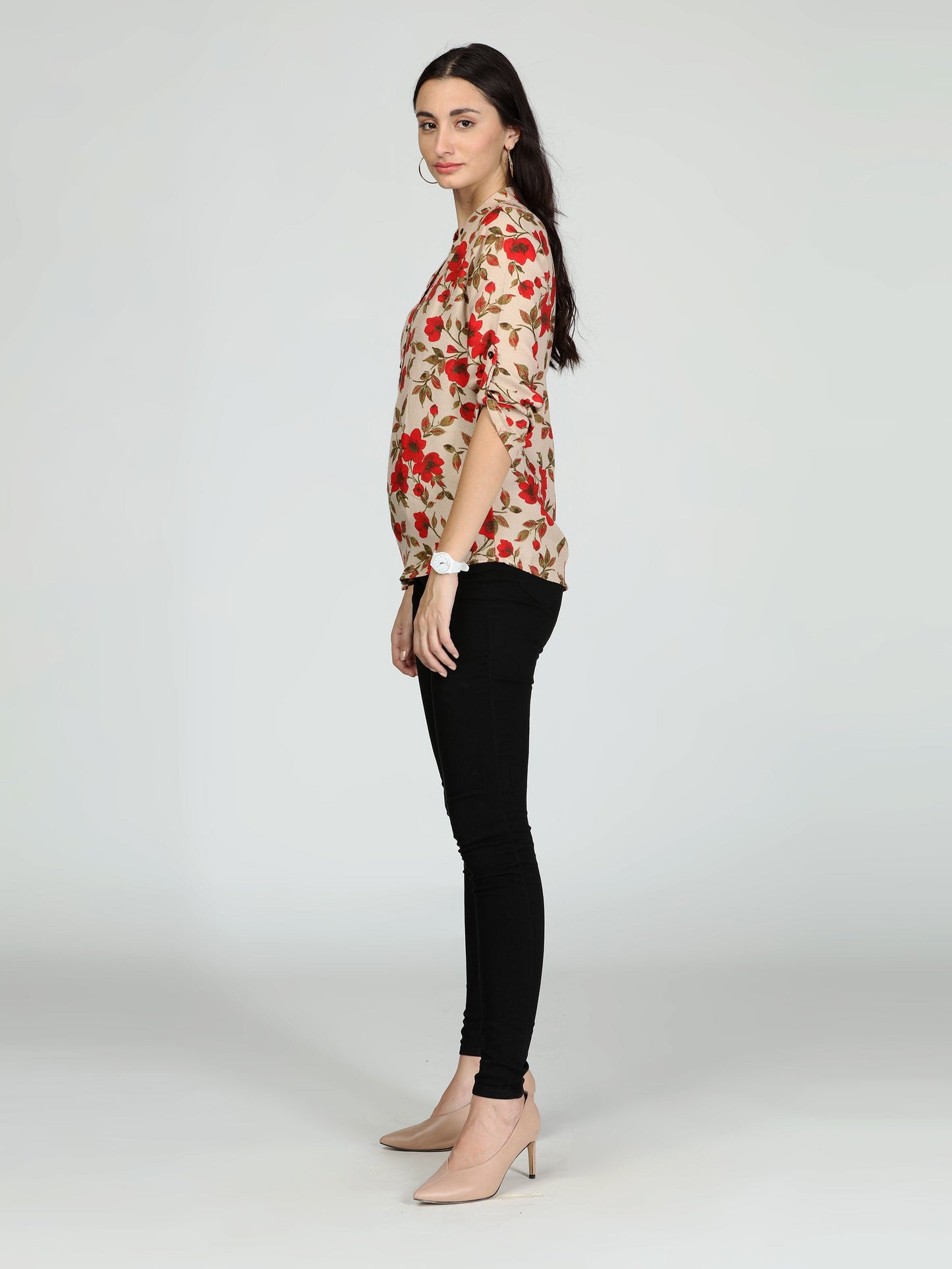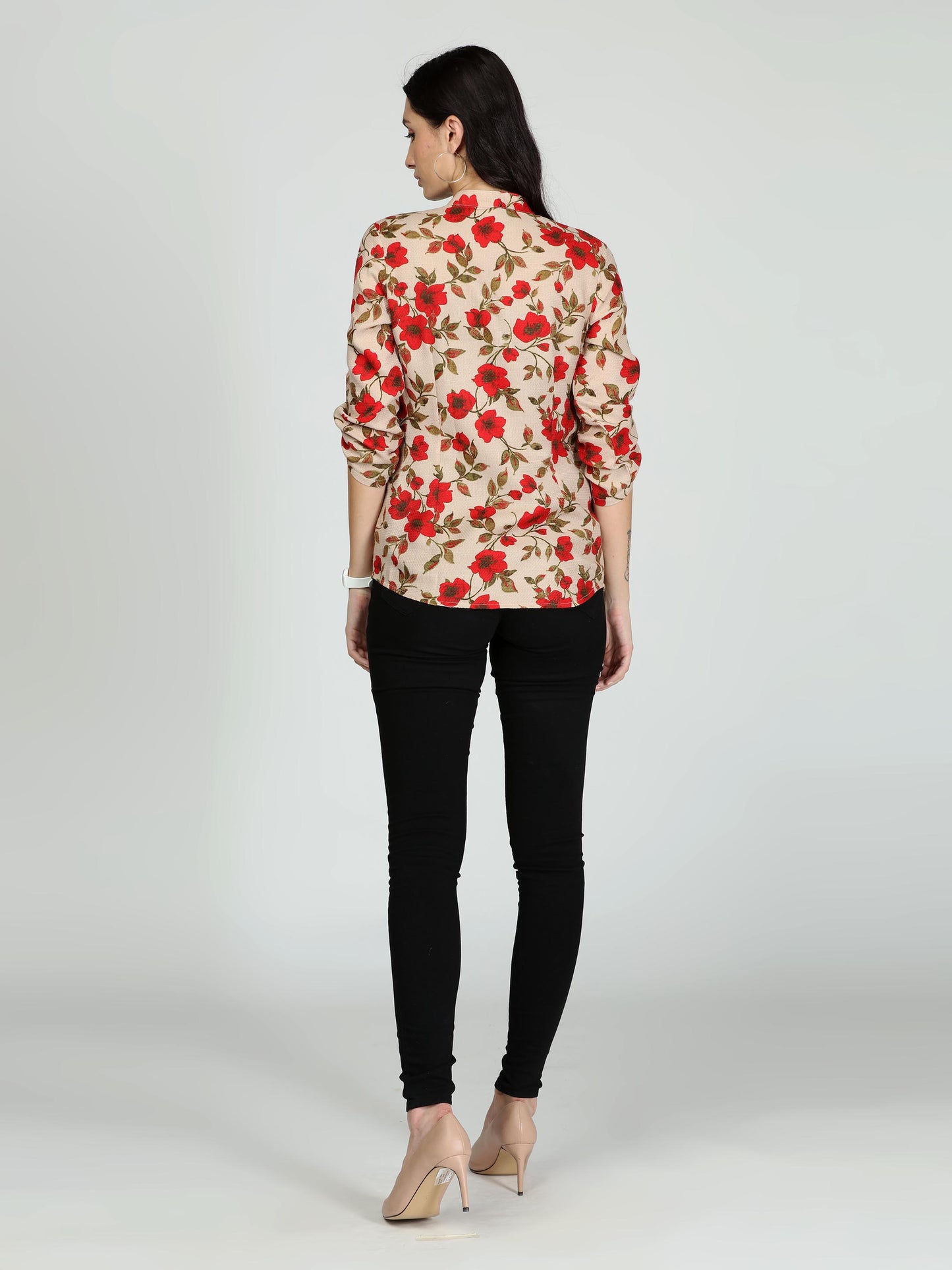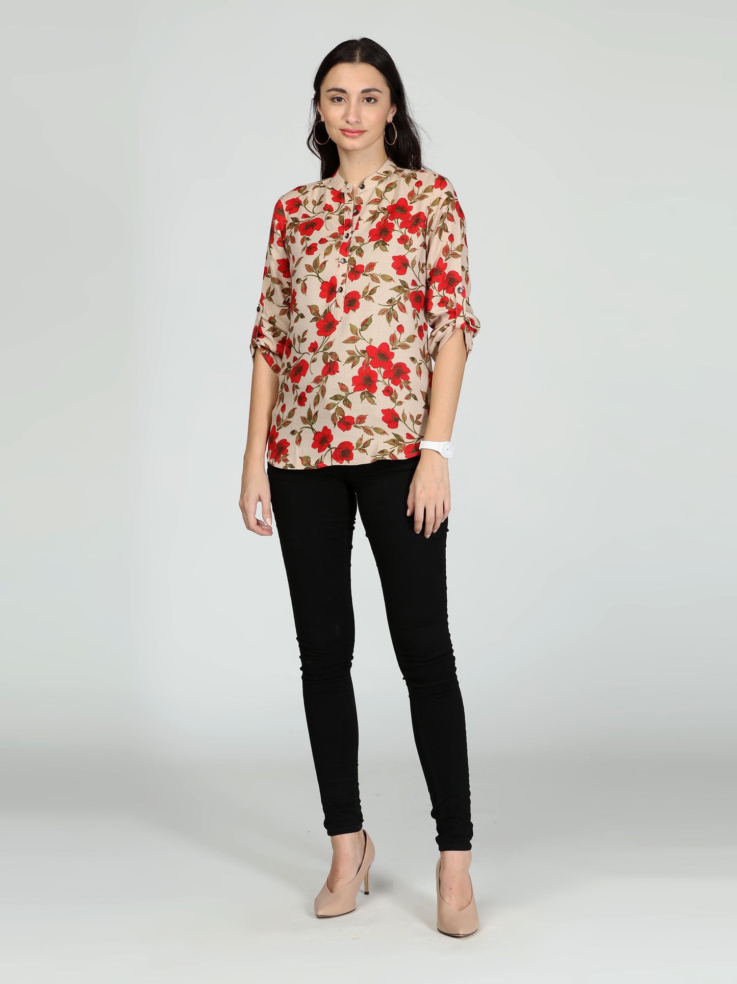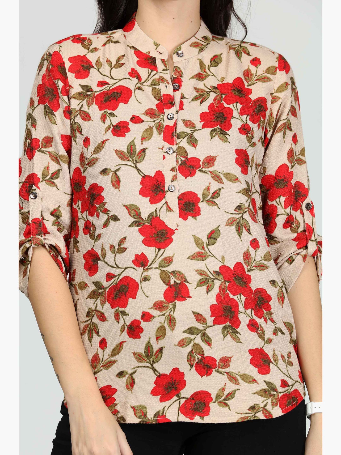 Cream and red printed stand collar top, front half button.