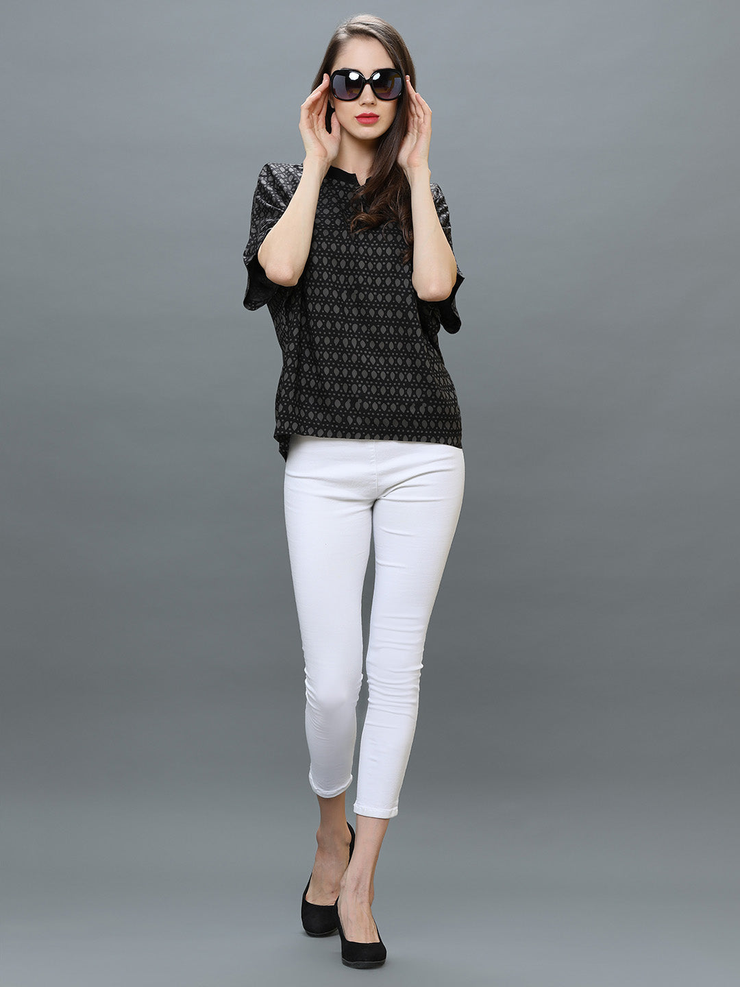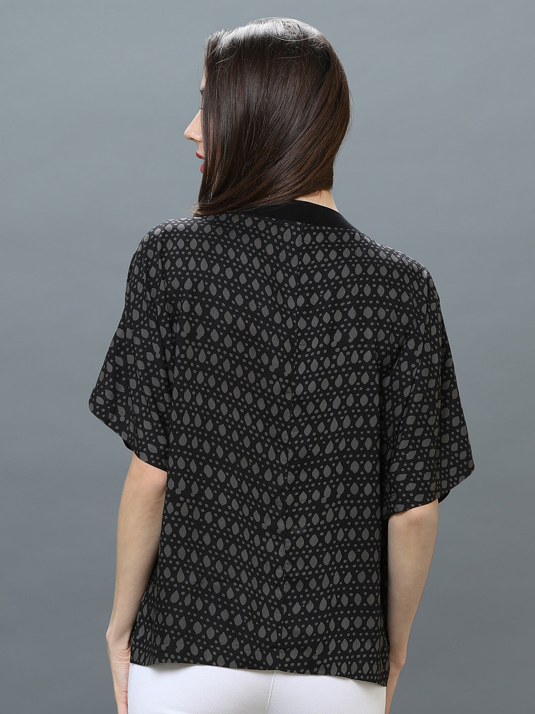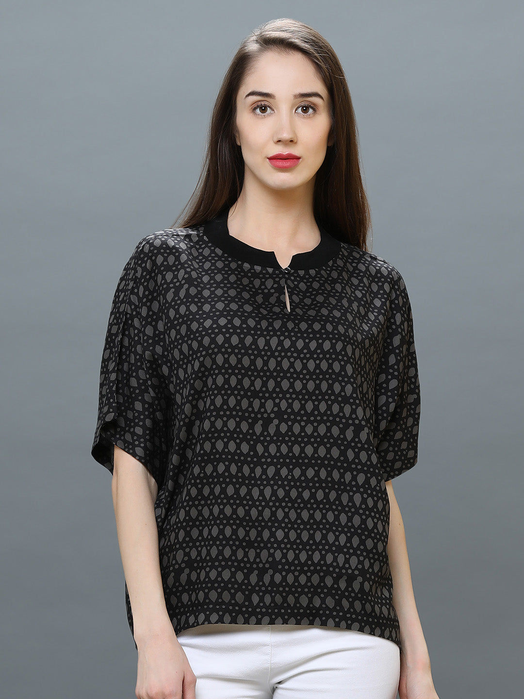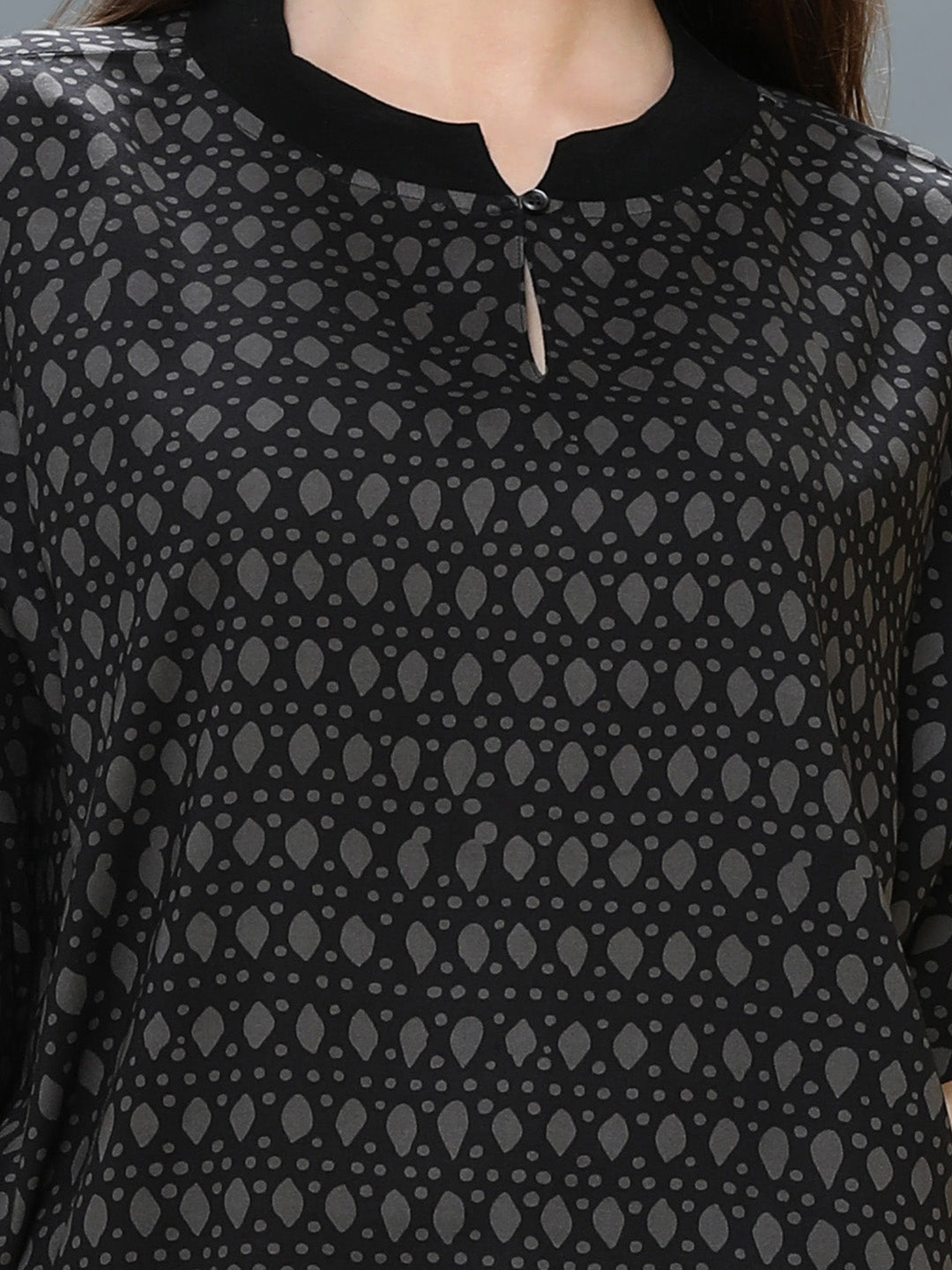 Digital printed black rayon top, Ribbed mandarin collar