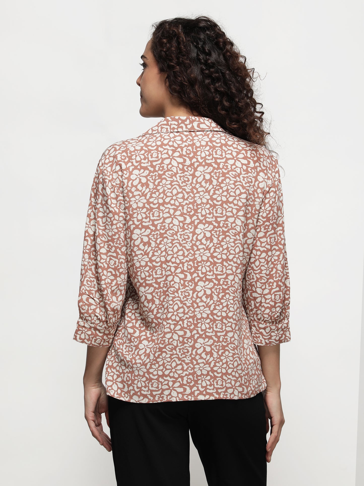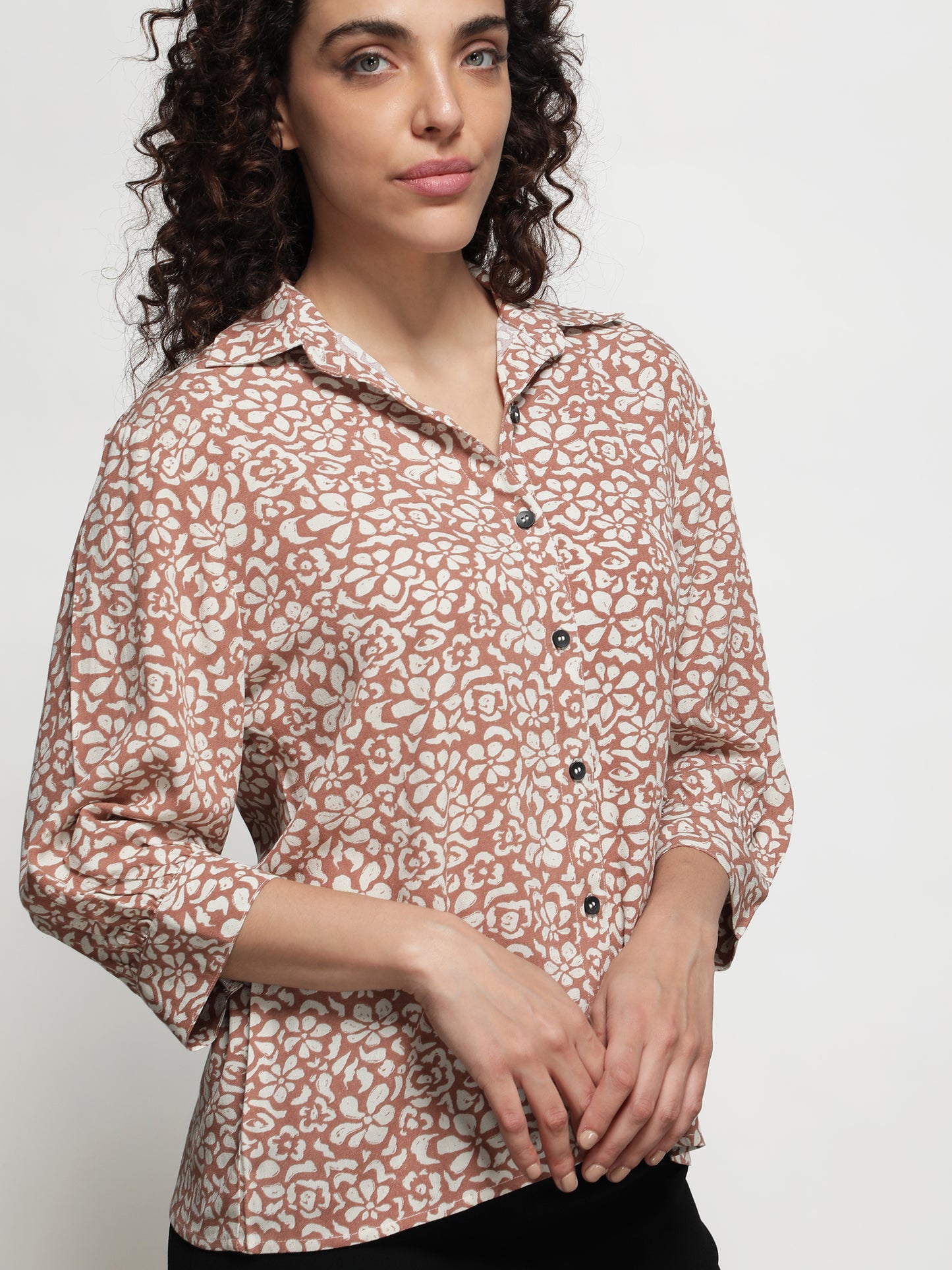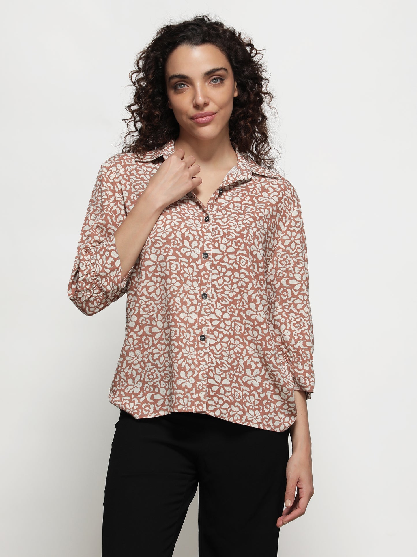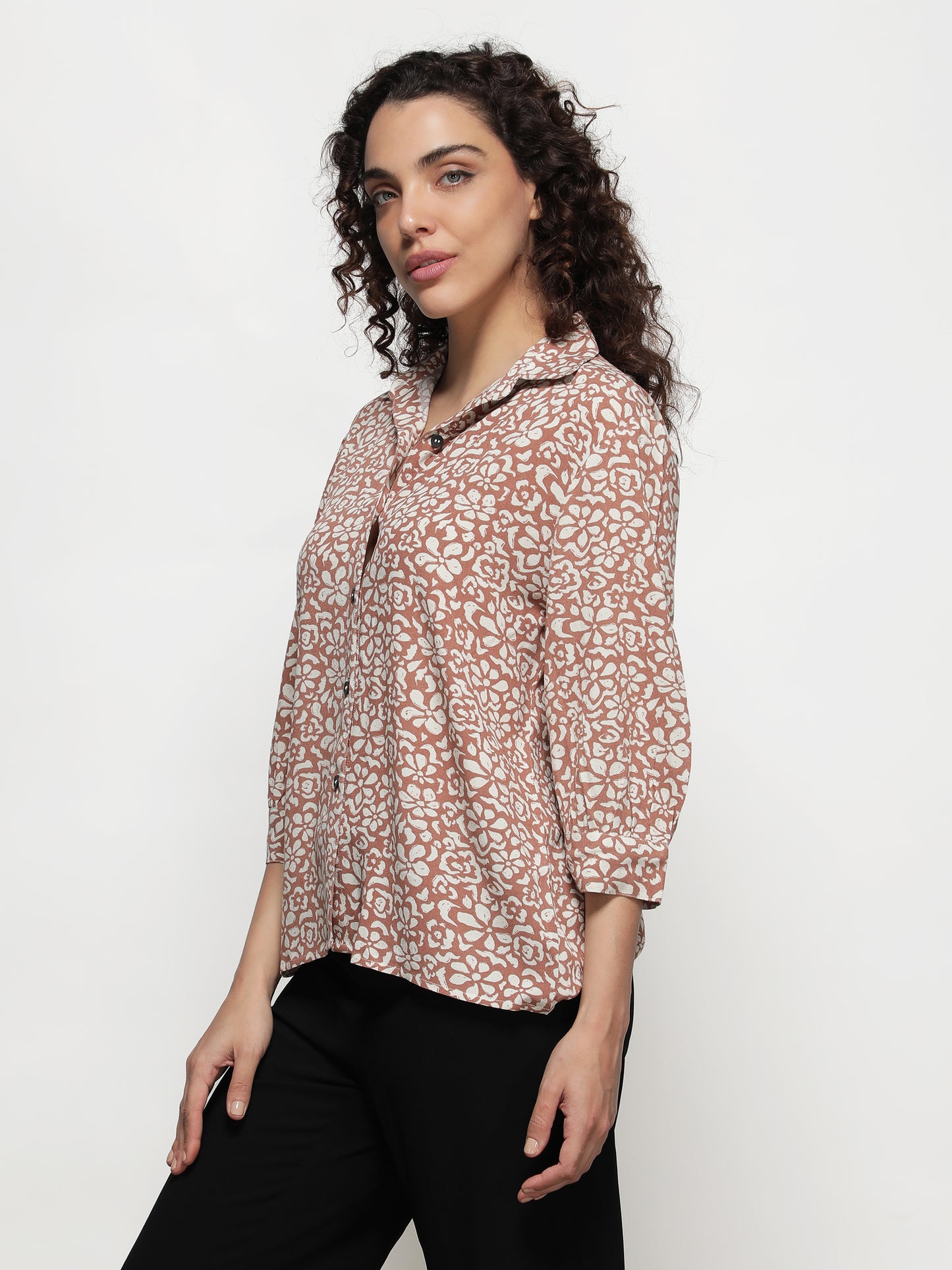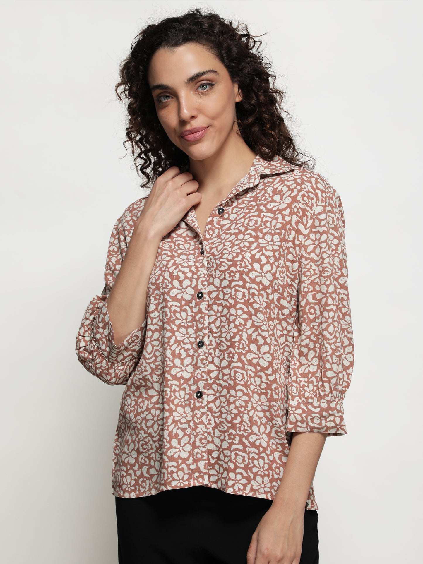 Brown loose-fit shirt, Designed in breathable crepe fabric, it features bishop sleeves with cuff details for a polished yet relaxed look, ideal for any occasion.